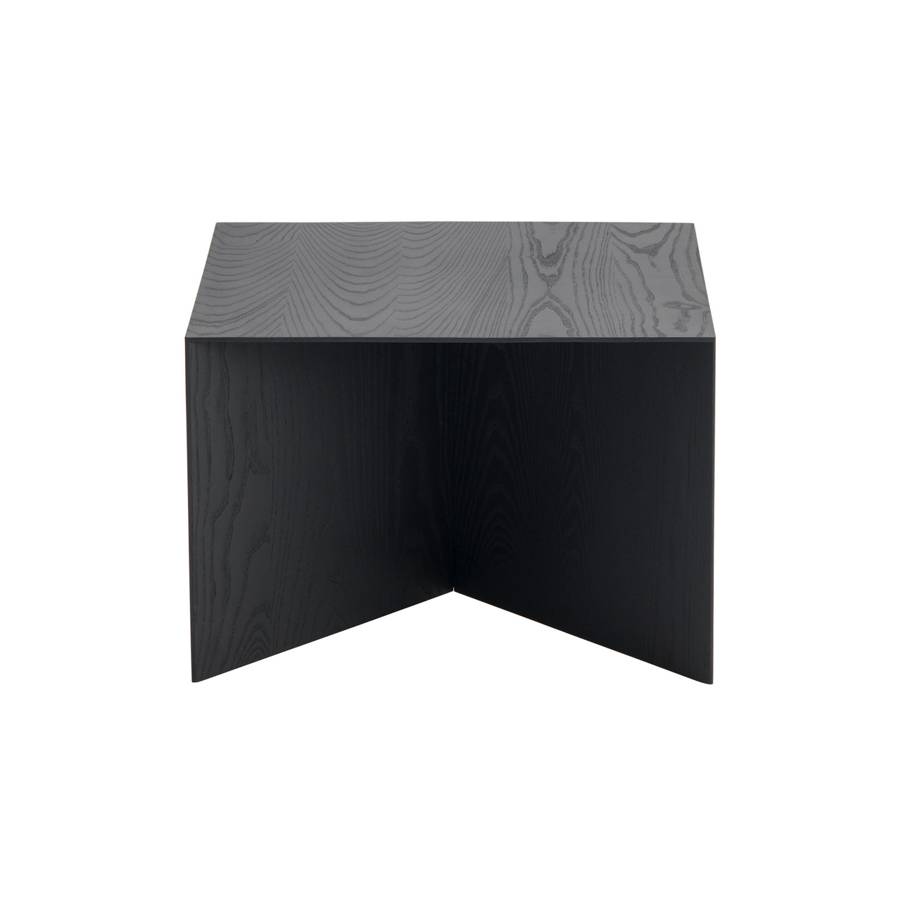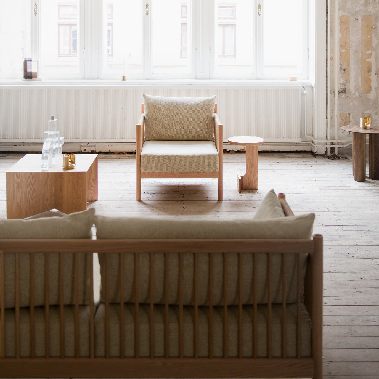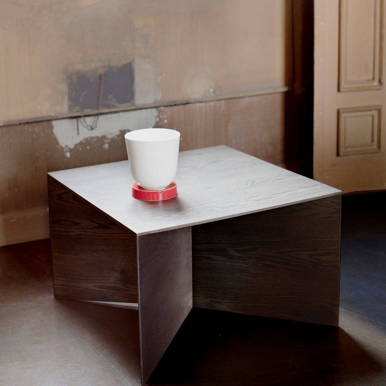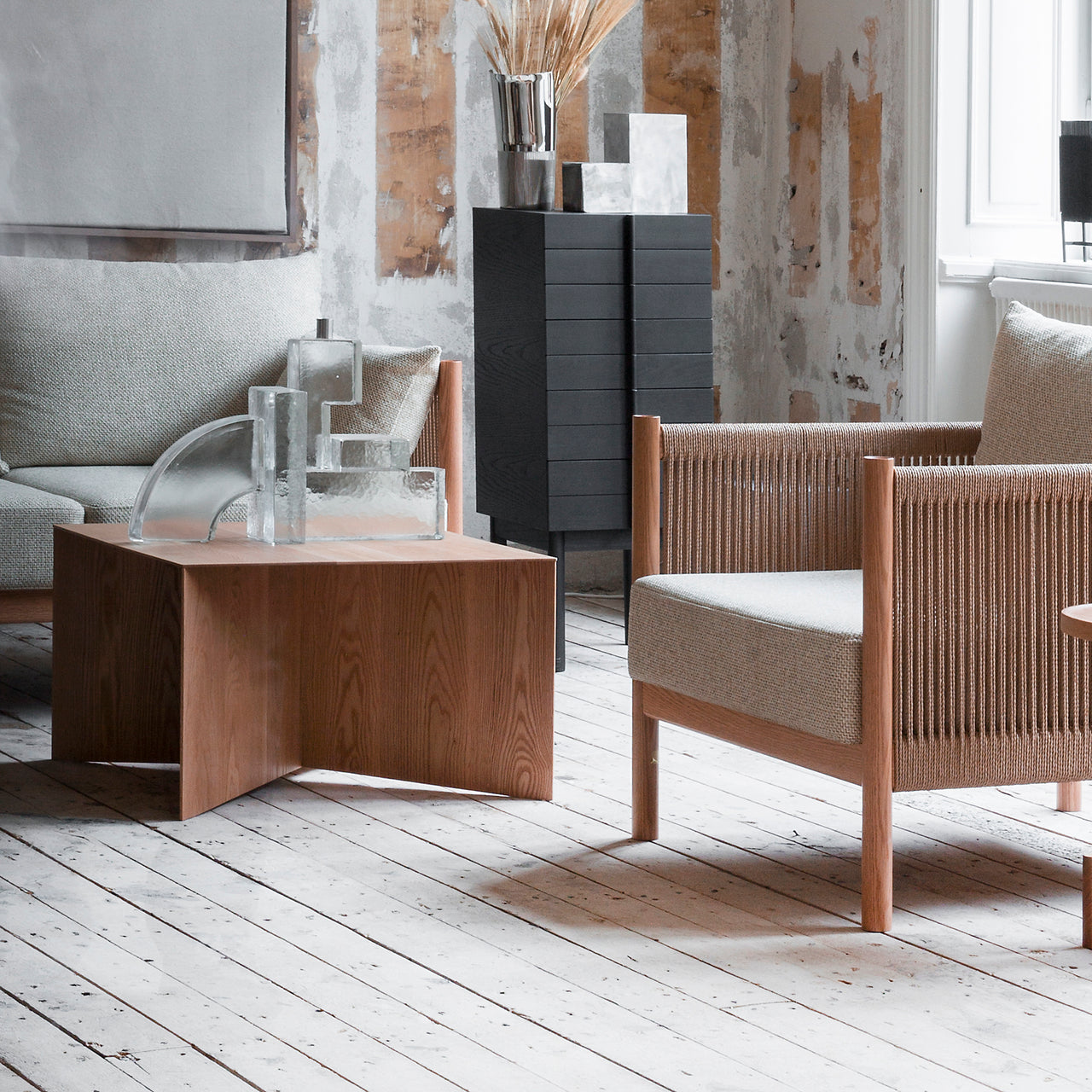 The Paperwood Coffee Table, designed by Anderssen & Voll, features a tapered design that conveys a sense of visual lightness. The table's legs and top narrow, accentuating its delicate appearance. This effect is further highlighted by a small gap at the base, allowing a sliver of light to pass through, lifting the table visually off the floor. Made from solid oak or ash, it is available in finishes such as white oak, smoke oak, sumi ash (black), indigo ash, or red ash.