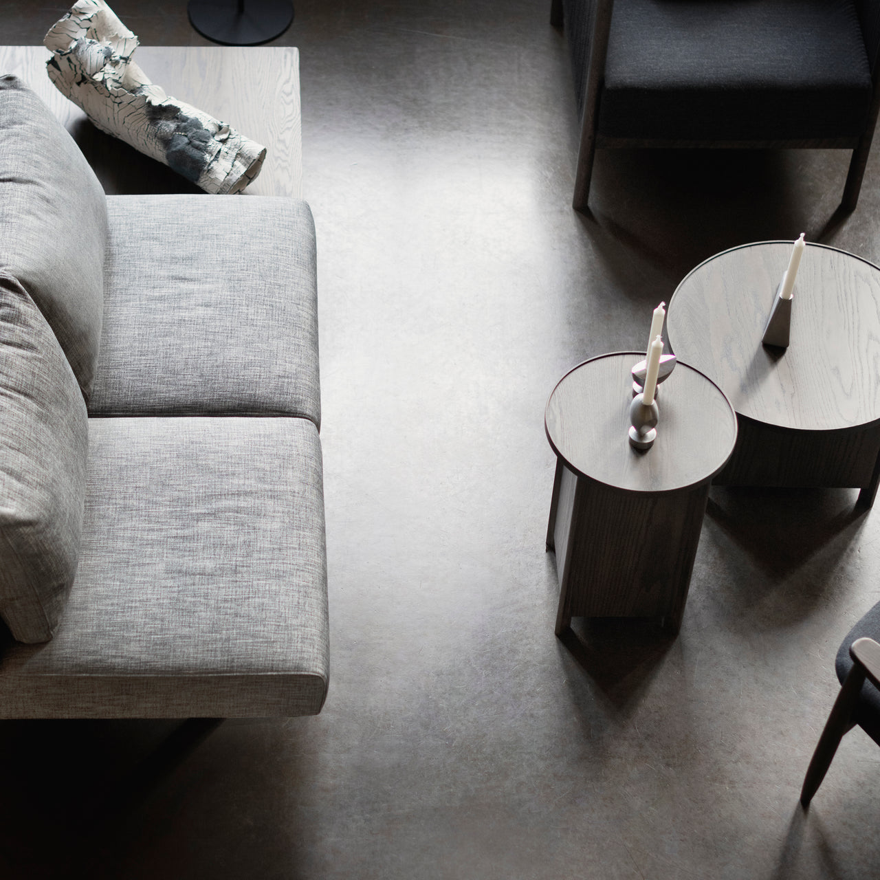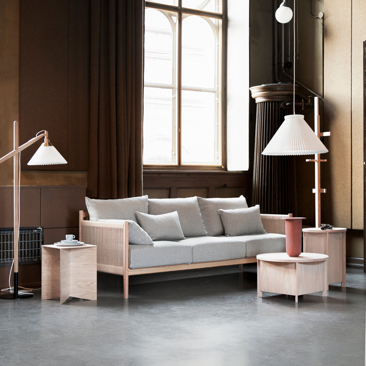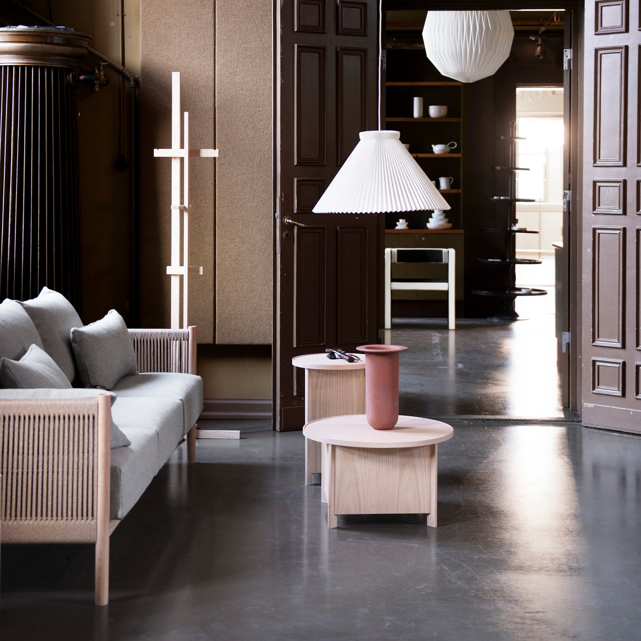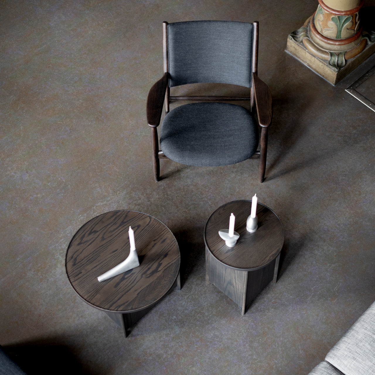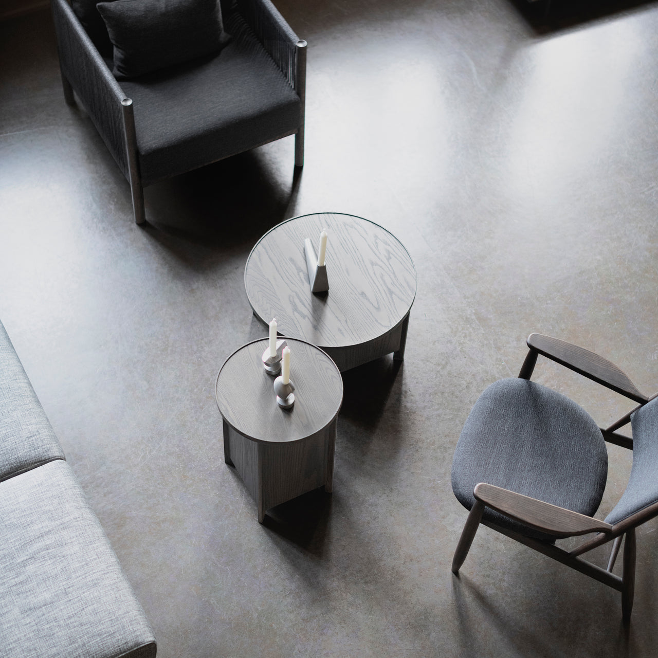 The Sake Coffee Table, designed by Note Design Studio, has a rounded, low-profile tabletop and slender legs. Crafted from solid oak or ash, it comes in finishes white, natural, smoke, sumi, or indigo. It’s compact footprint makes it ideal for various interiors.