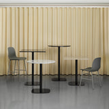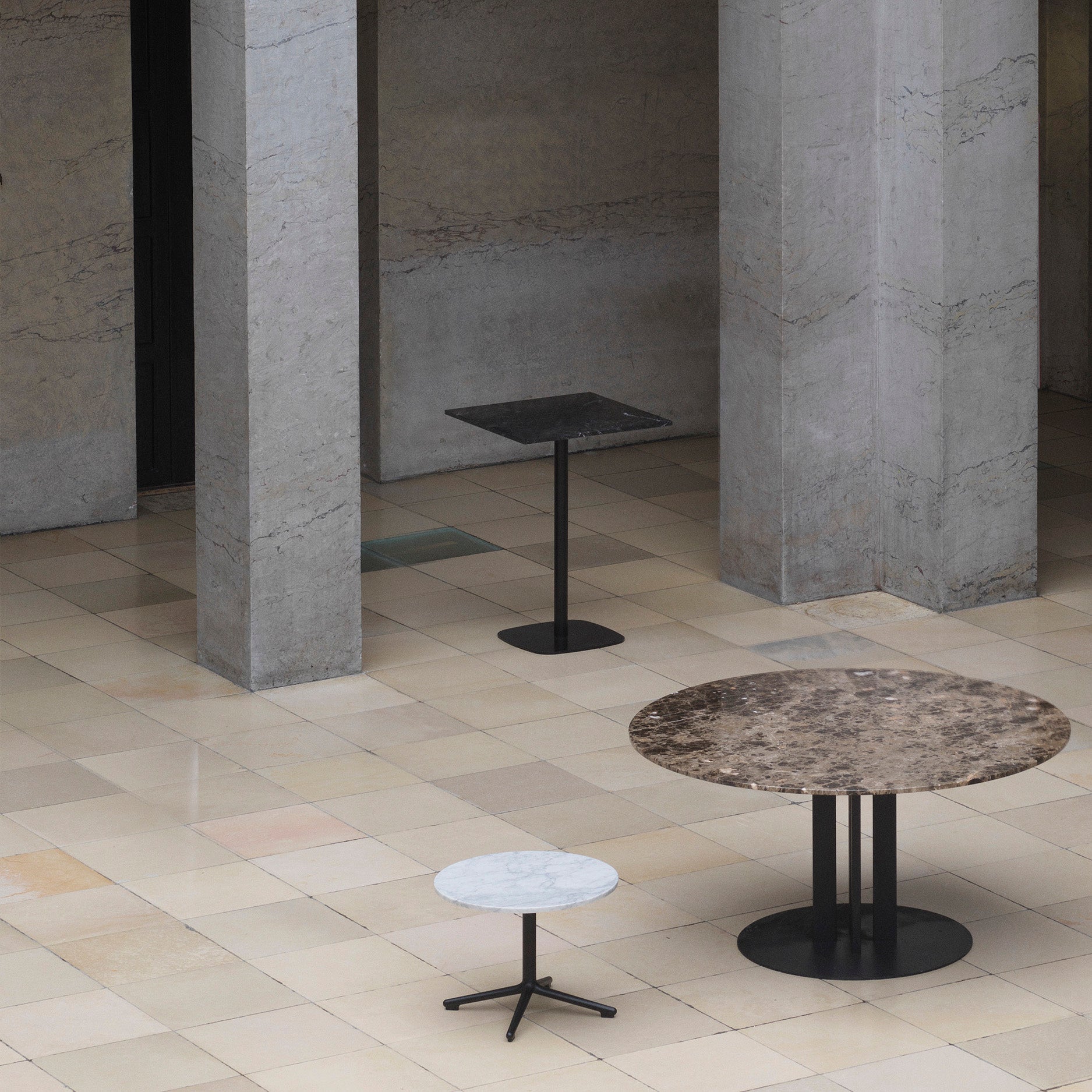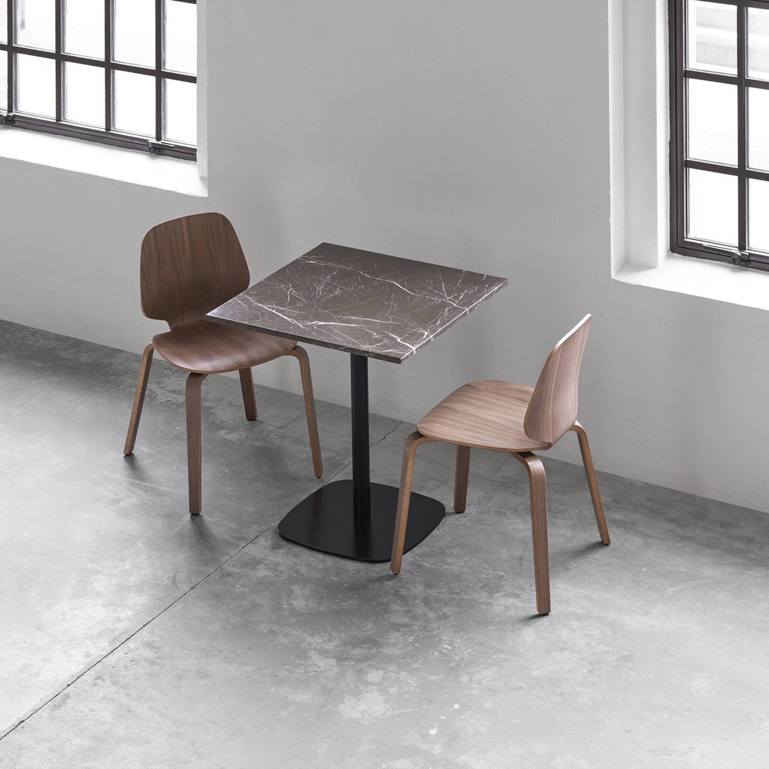 This smart square-top cafe table takes its place alongside SImon Legald’s notable Form seating. With a centered black steel base, the design shows its versatility, accommodating tabletop choices in lacquered wood grain, steel, solid black or the luxury of solid marble in coffee and sand tones. And it is available in 4 different heights—lounge, dining, counter or bar—to pair with its companion chair or stool.