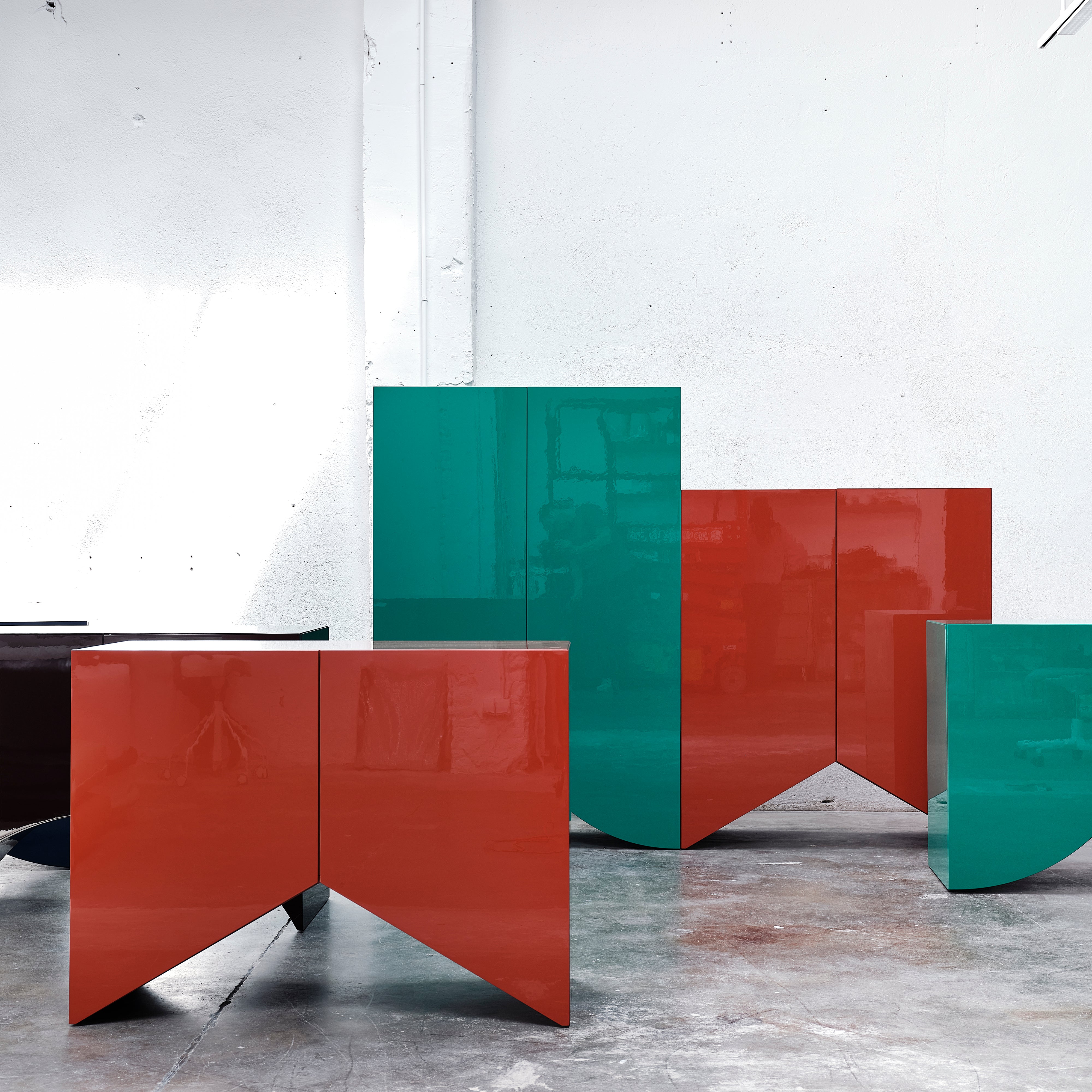 Designed by the Belgian duo Muller Van Severen, this collection of cabinets evolved from their series of 'Wave' vases, incorporating the vase silhouettes into handmade cabinets with distinctive cutout bases. The cabinets stand out with their refined colors and glossy finishes, adding a sculptural beauty to any space. Each piece in the Bridges collection can function alone or combine to create a vibrant and spacious architectural element full of personality.