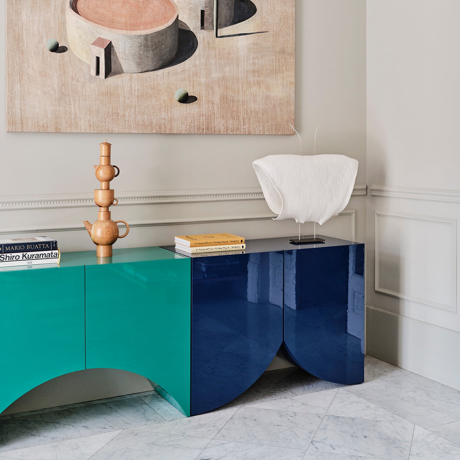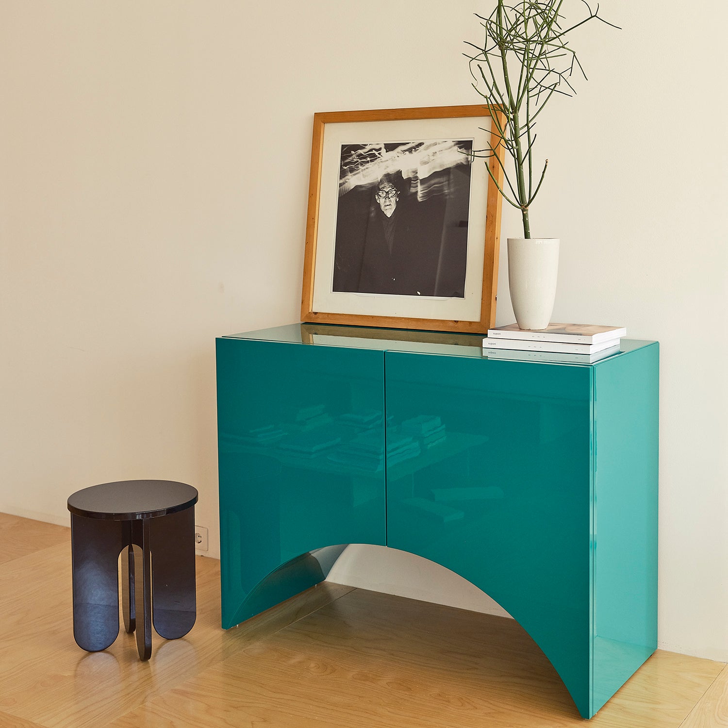 Designed by Muller Van Severen for BD Barcelona, the Bridges Cabinet transforms storage into sculpture with arched cutout bases and bold lacquered finishes in Green, Red, Blue, or Aubergine. Available in three sizes and now available with matching glass tops, it offers architectural presence whether used alone or grouped.