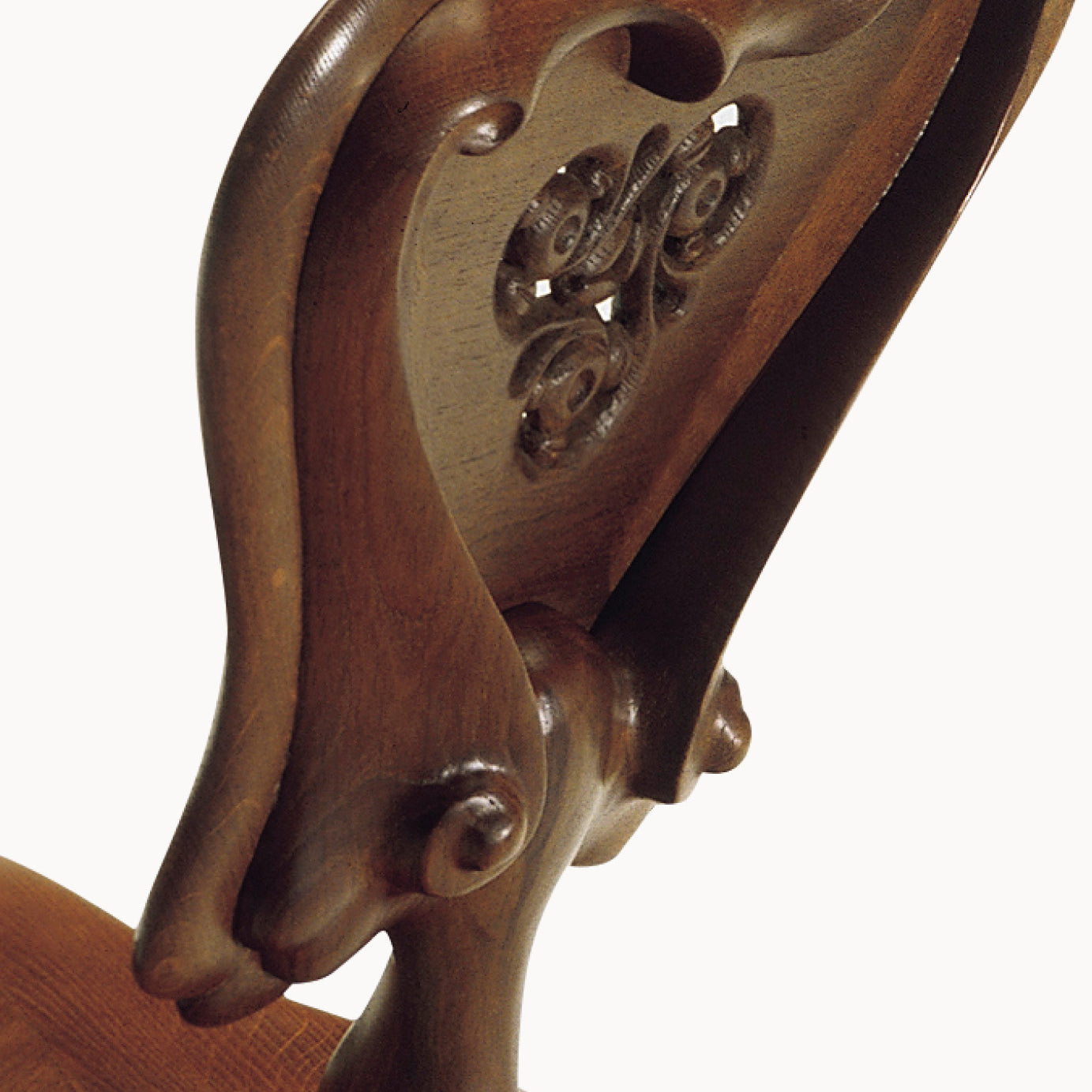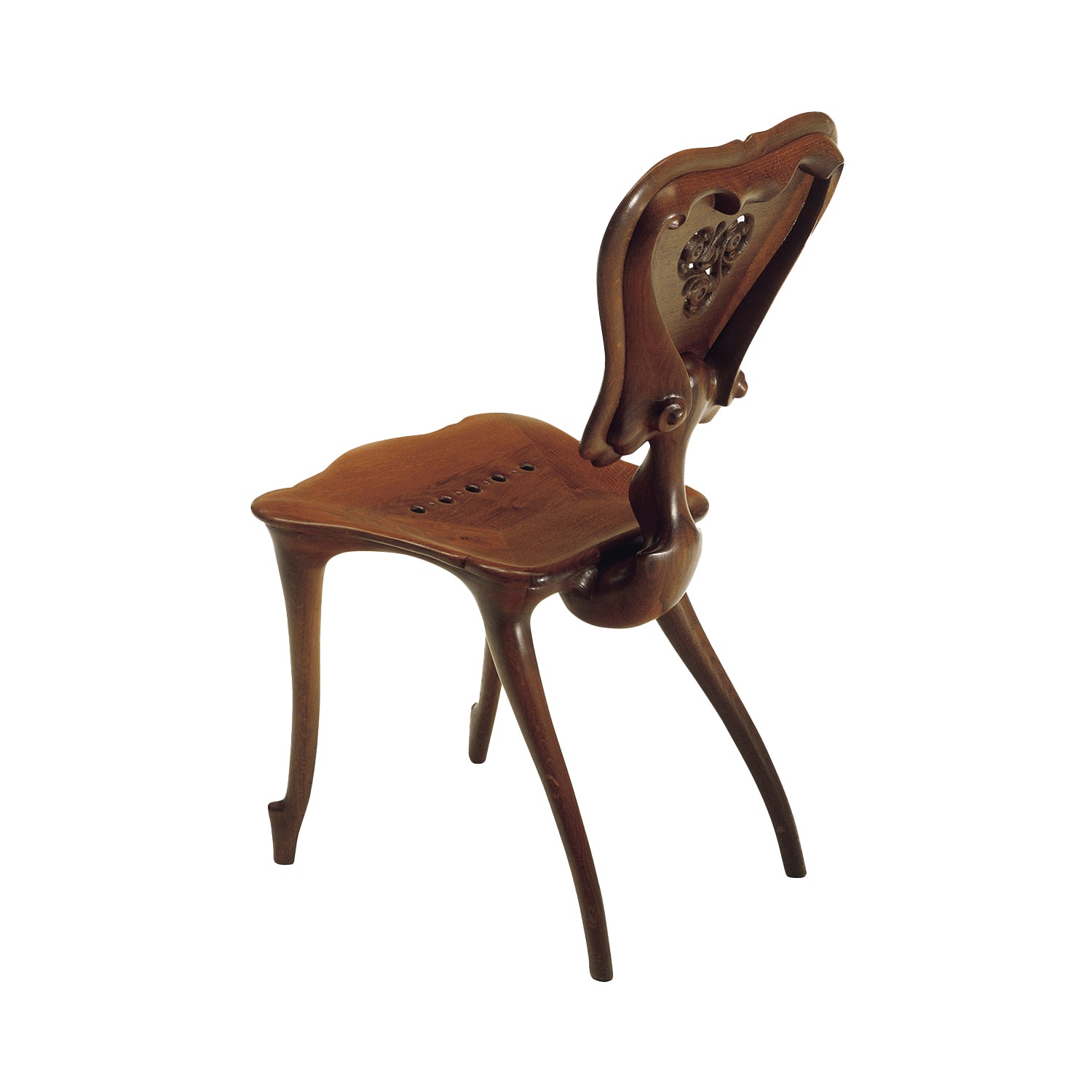 Made from solid varnished oak, the chair highlights a rich, natural grain that brings warmth and character. Its high backrest features intricate floral and geometric carvings, drawing on Gaudí's inspiration from nature. The chair’s flowing lines extend through the legs and armrests, giving it a sculptural feel. Despite its detailed design, the chair maintains a strong structure, with a sturdy base and a slightly curved seat for comfort.