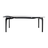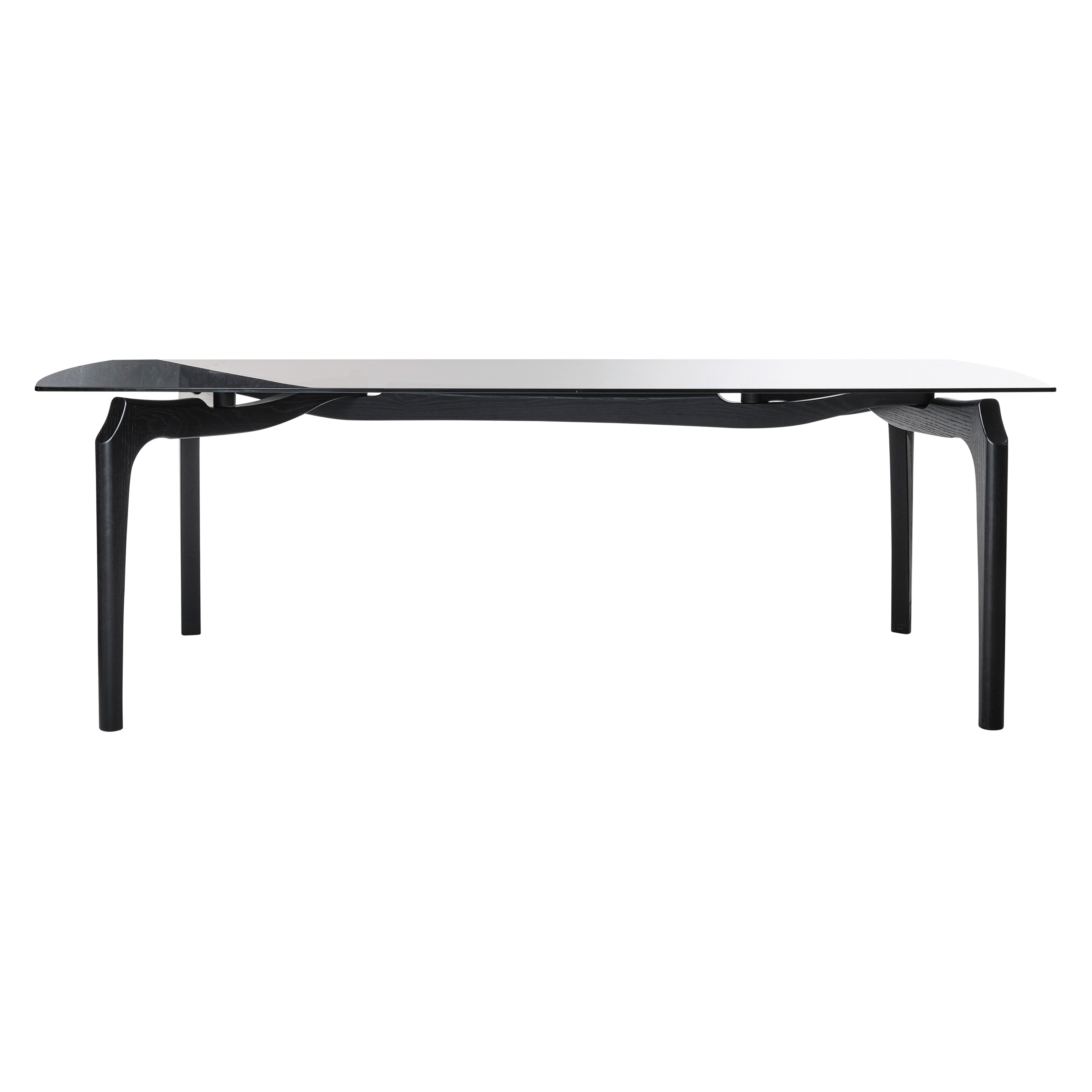 Suggested by the Surrealist architect Carlo Mollino, BD’s Carlinas range by Oscar Tousquets adds a dining table with a clear surface that exposes the biomorphic supporting structure. Twisting and triangulating, the black-painted ash timber upholds the tempered smoked-glass tabletop to mesmerizing effect.
