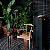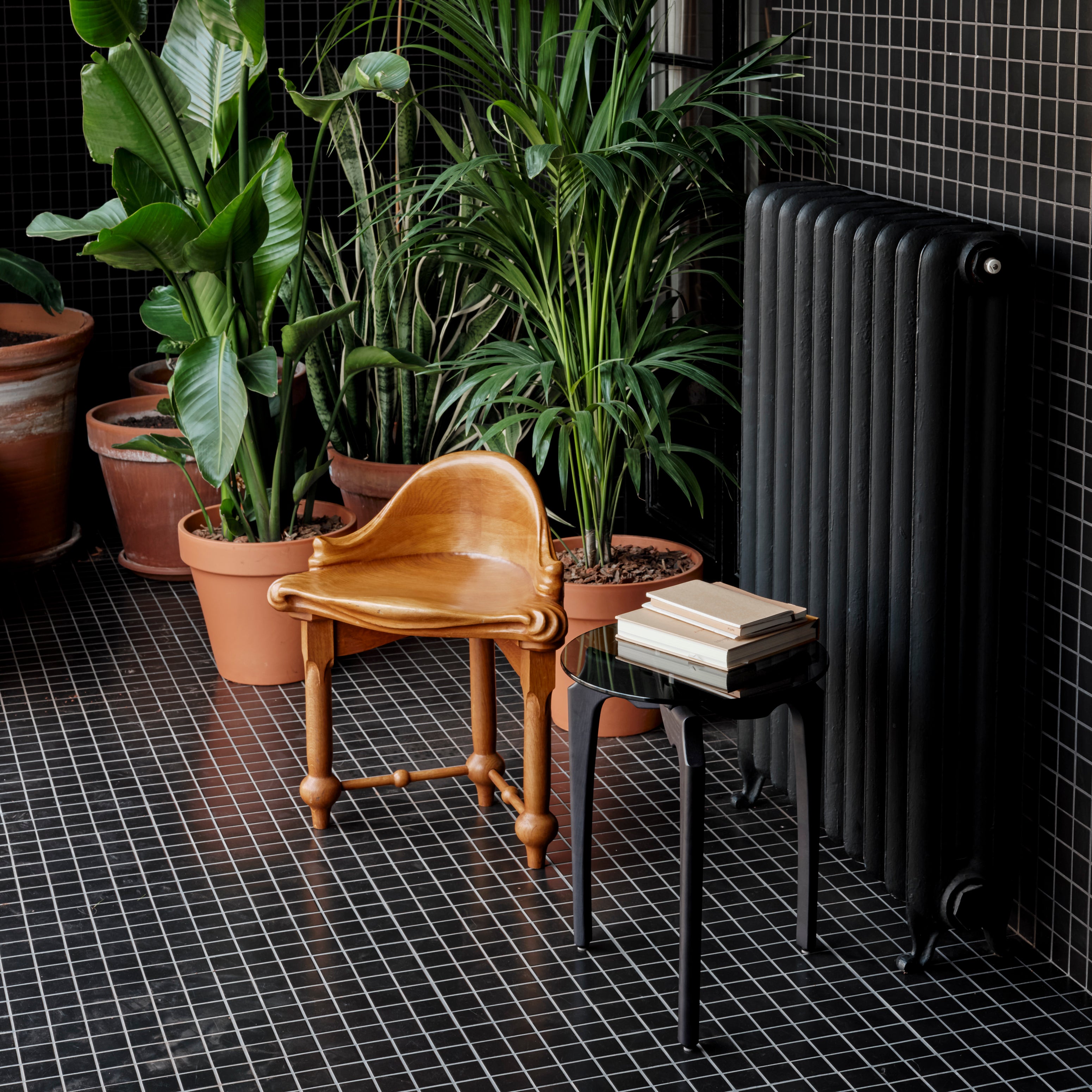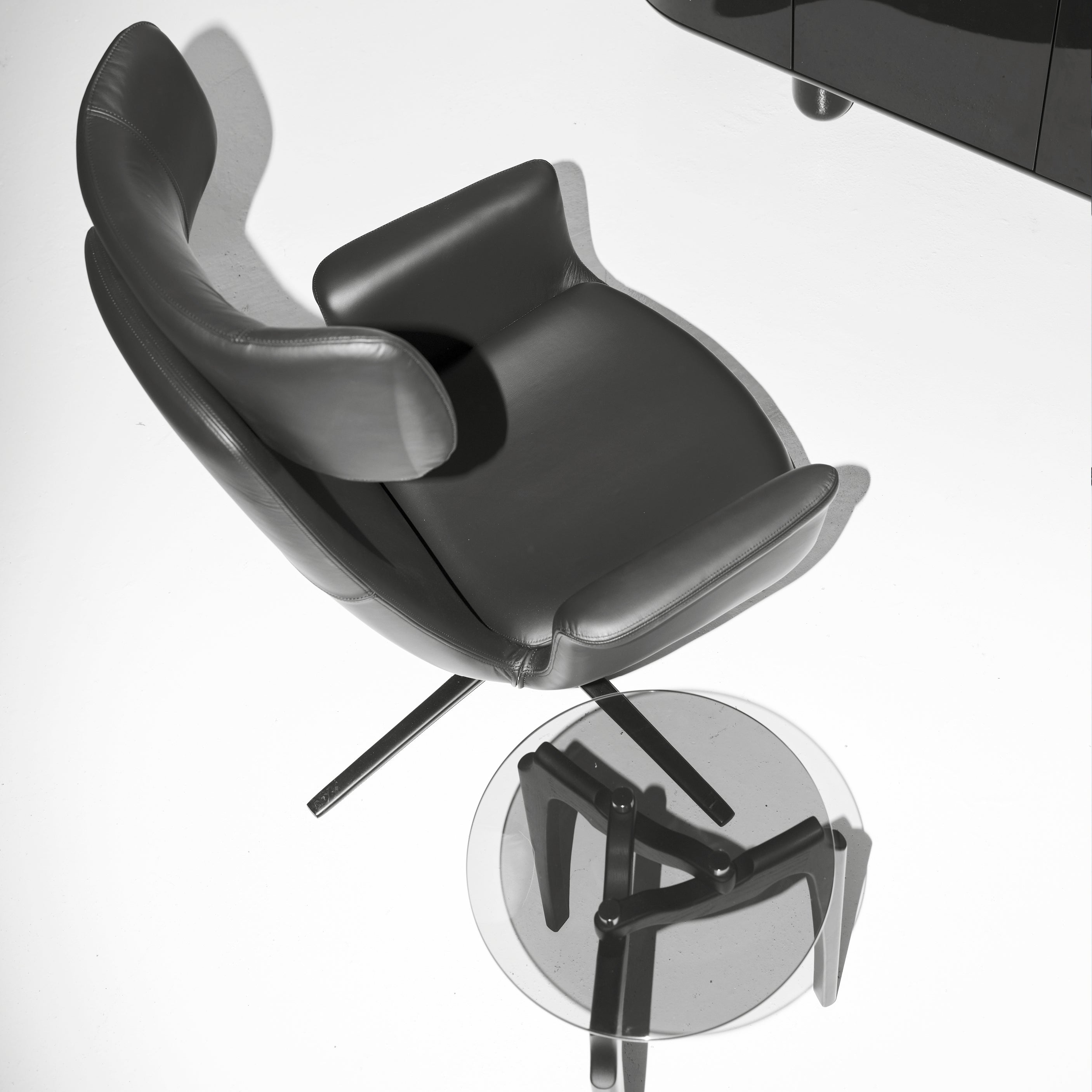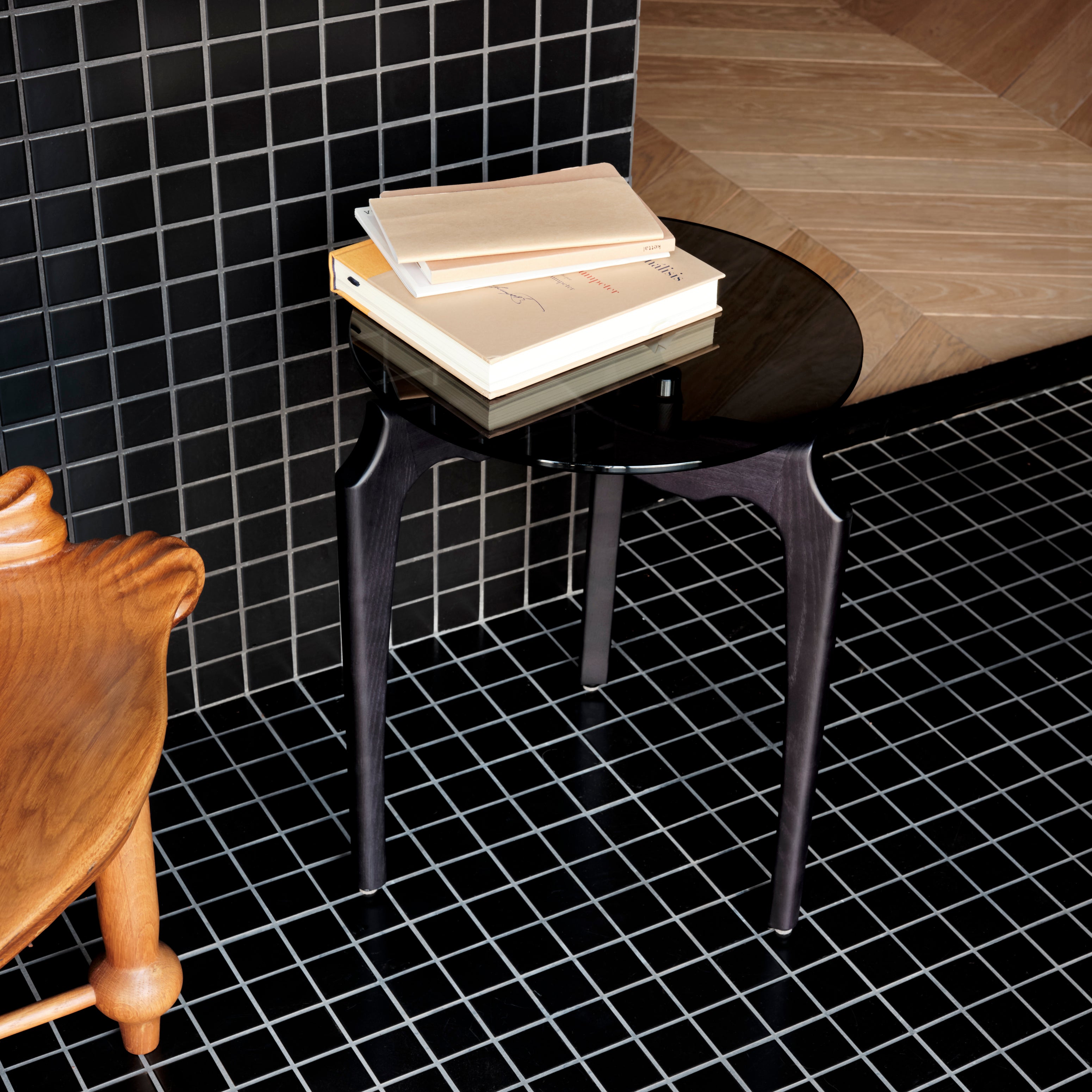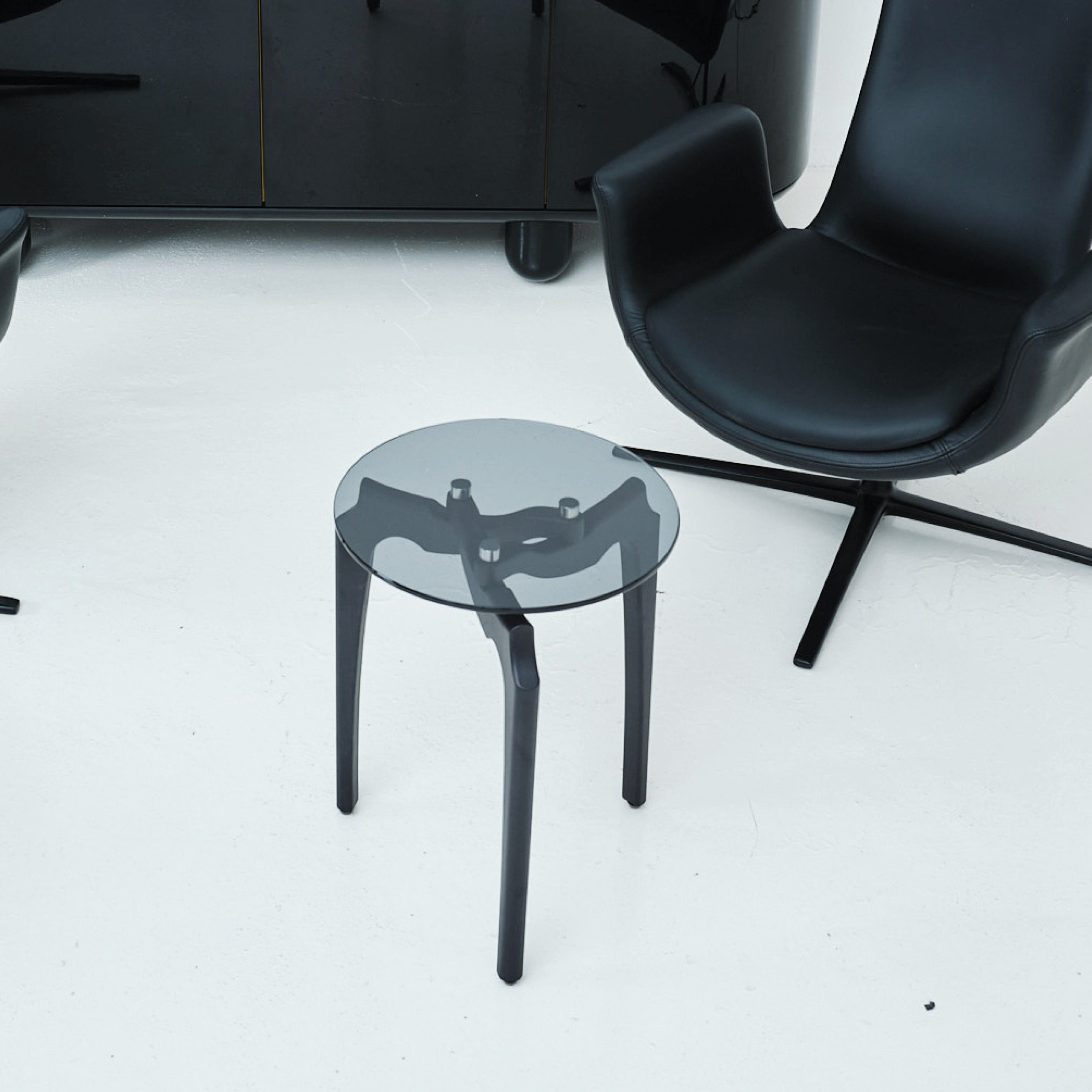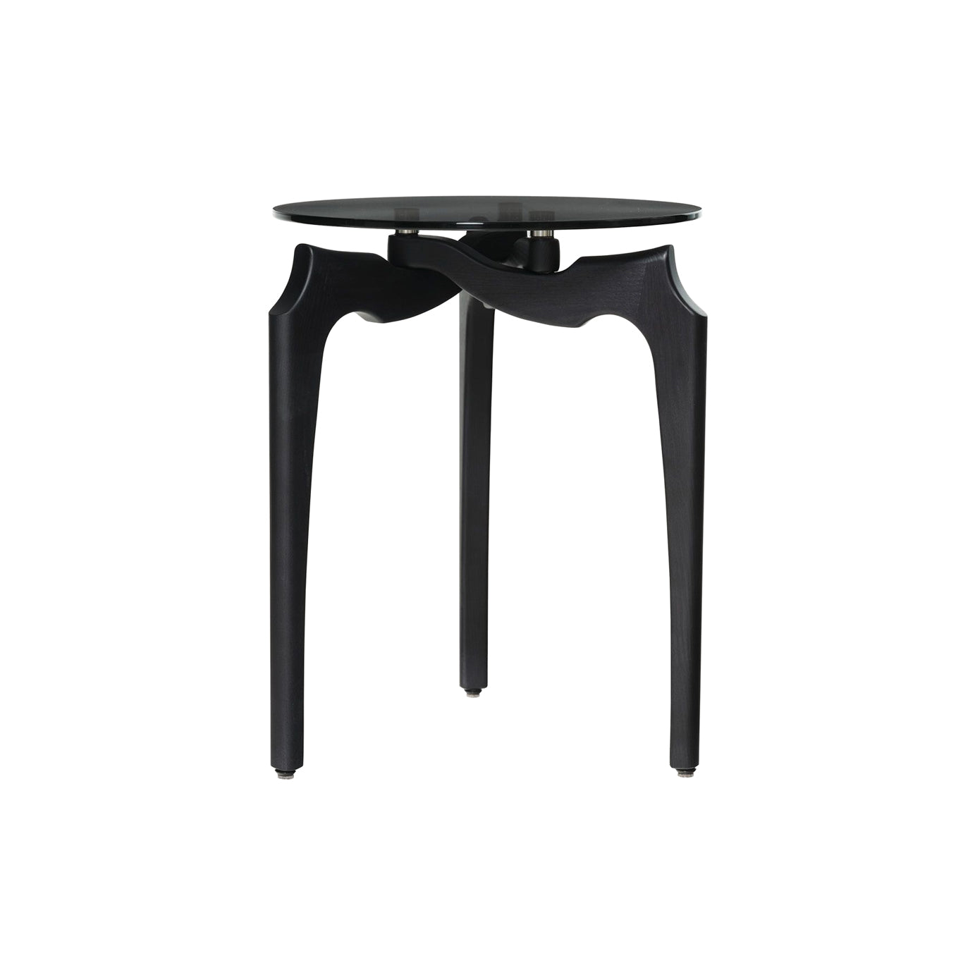 Verging on the surreal, designer designer Oscar Tusquets’ side table derives its graphic 3-legged structure from an abstraction of nature’s twisting tree branches, rendered in dark solid ash. Inspired by noted 20th century Italian architect Carlo Mollino’s similarly organic vision, the biomorphic wood legs triangulate at Carlino’s base, supporting the moodily tinted transparency of the smoked-glass tabletop.