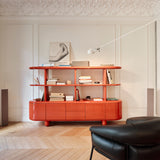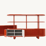 Playful wunderkind Jaime Halon adds a striking tall storage cabinet to his Explorer series, with open shelves atop a base unit that features both cabinets and drawers. A glossy lacquered finish heightens the curves of his organic design and contrasting matte colors on the interior surfaces add to the visual delight that comes straight from Hayon’s own cosmos.