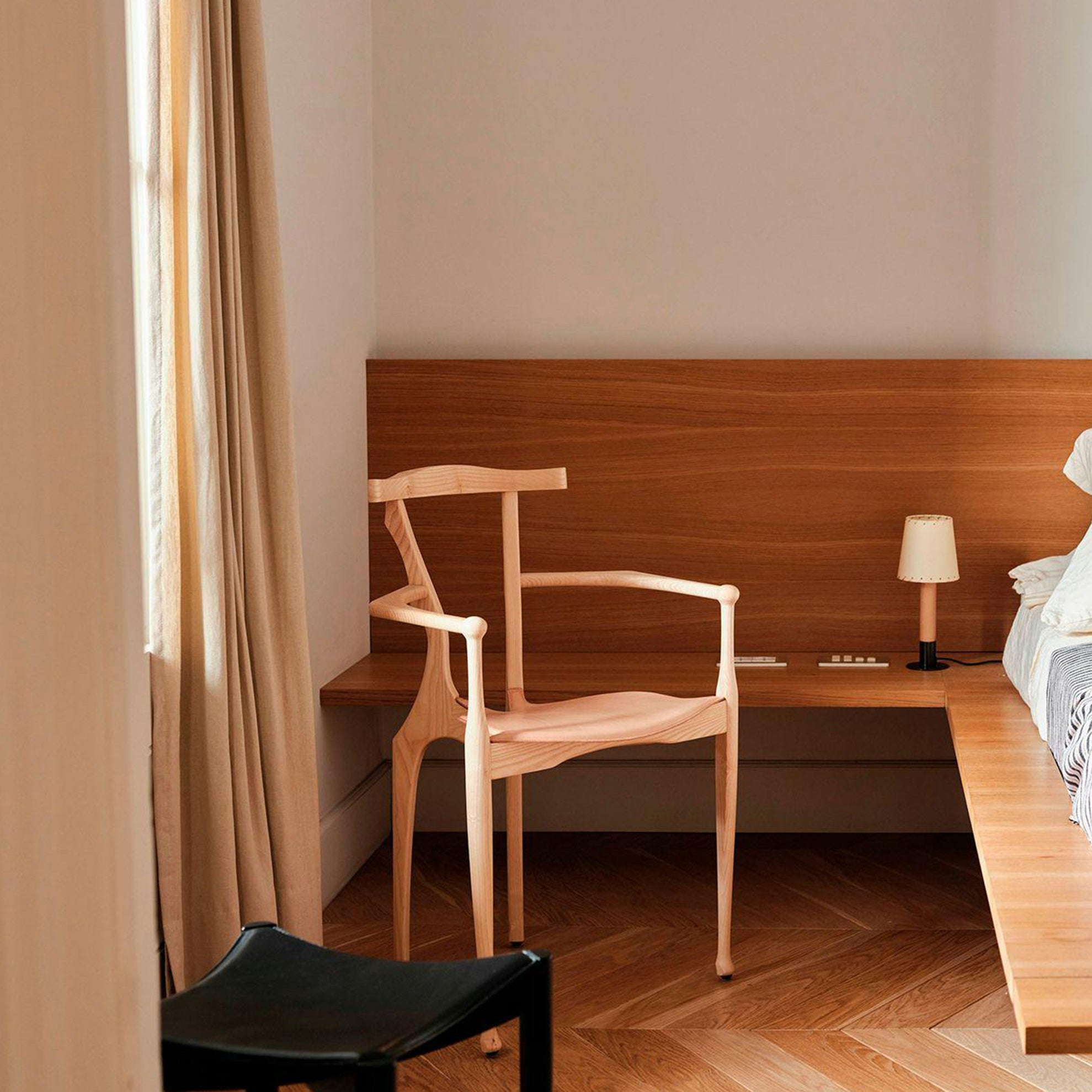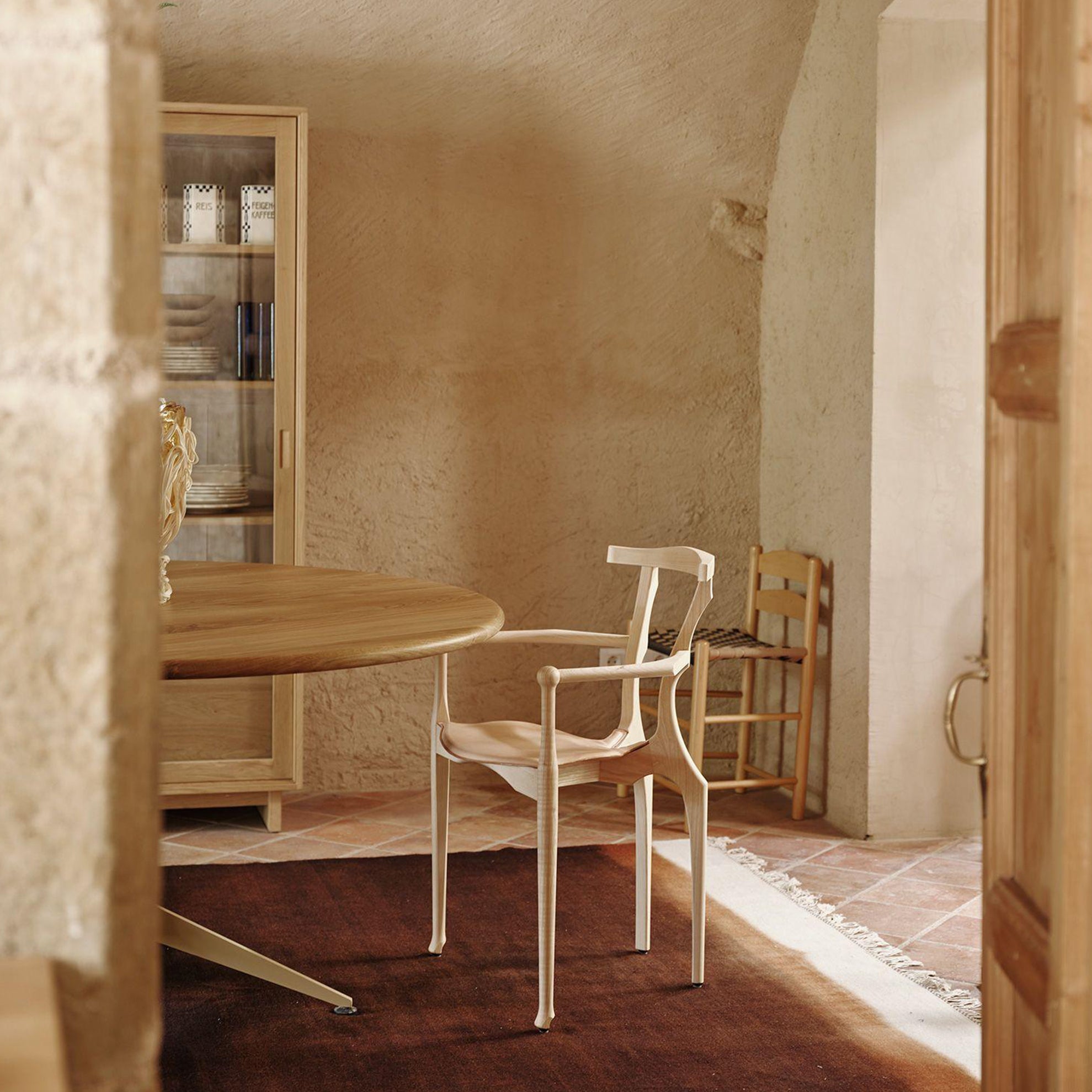 Inspired by Antonio Gaudi and Carlo Mollino, Oscar Tusquets devised his artisanal chair in 1987, with a distinctive wooden frame and slender tapering legs. A paragon of 20th-century design, Gaulino features a hand-crafted frame in FSC-certified ash with a choice of finishes, complemented by a smooth hide seat.