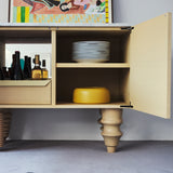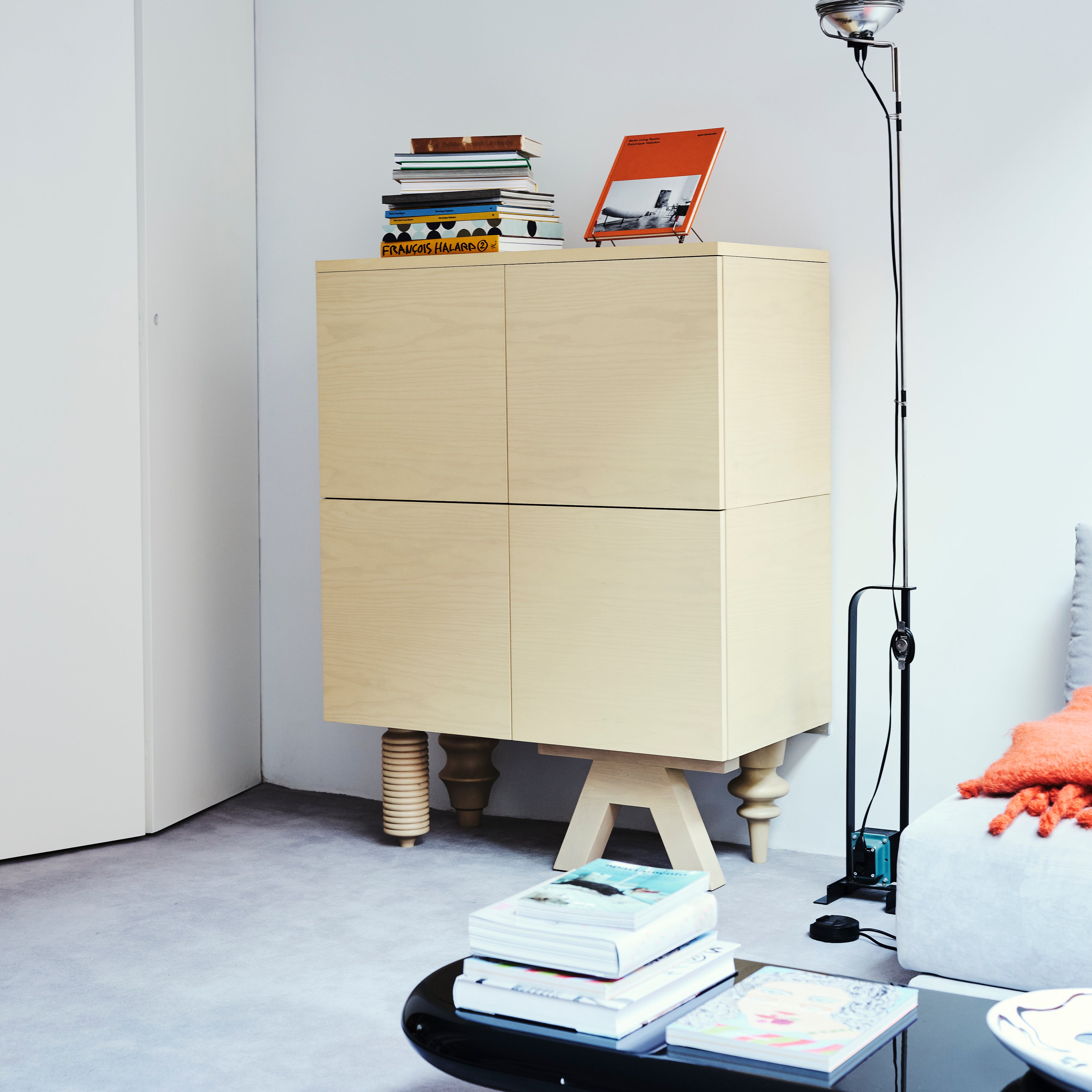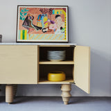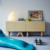 Jaime Hayon gets a leg up—actually up to a dozen of them—with his streamlined low storage cabinet, warmly veneered in a varnished Ash finish with matte veneer on the interior. Multileg lives up to its name, resting on 4 to 12 individual supports depending on the unit’s size, each bearing a different shape, in solid turned alder wood stained in a matching Ash color that also matches the cabinet’s cleanly handsome doors and drawer-fronts.