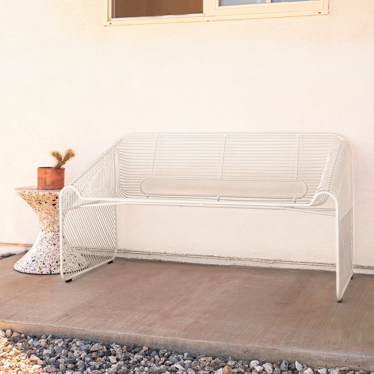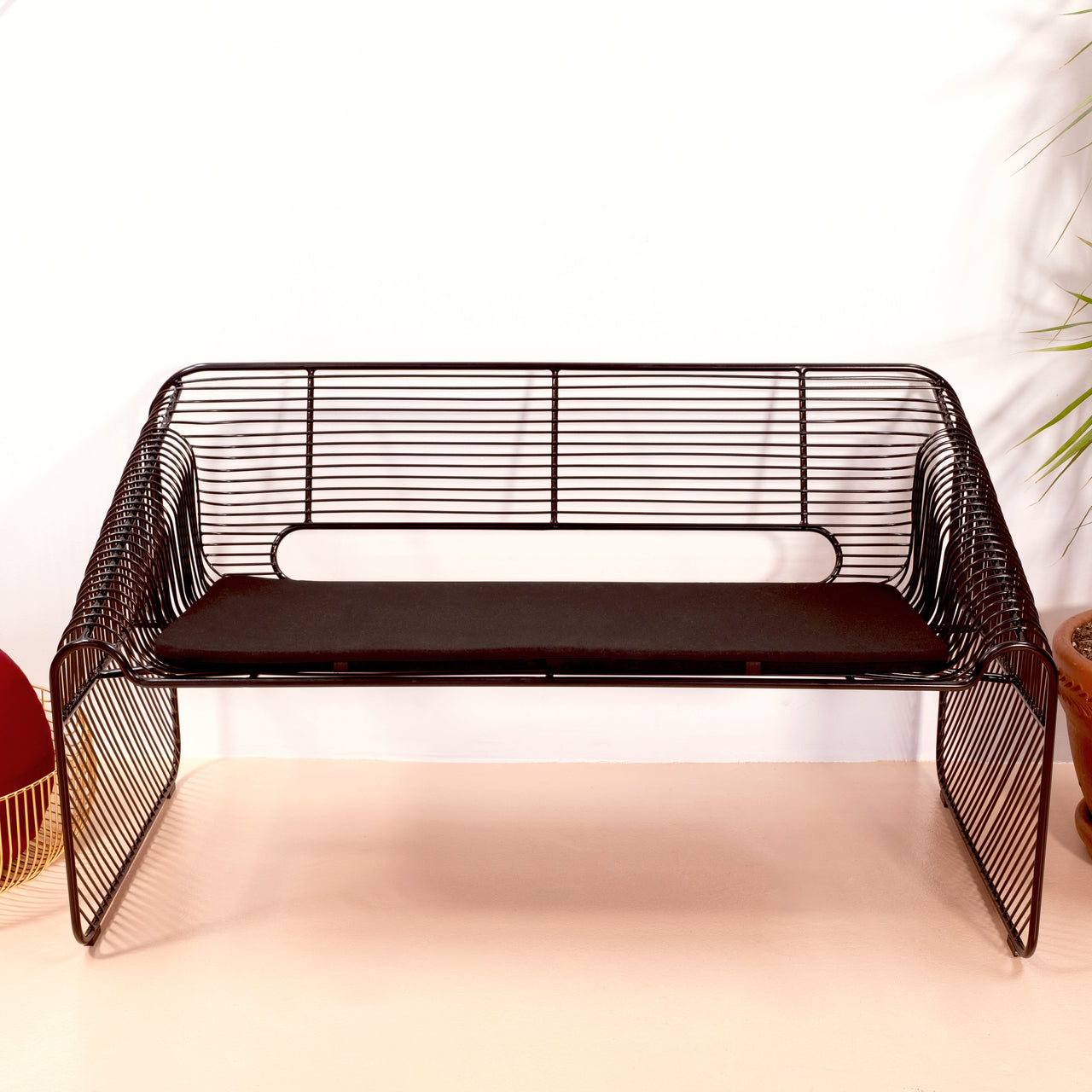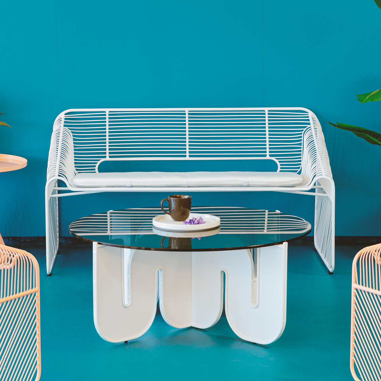With plenty of room for 2 but a light, airy presence, Bend Love Seat works beautifully inside or outdoors. Los Angeles designer Gaurav Nanda's signature hand-crafted wire construction employs hot-dip galvanized iron to prevent rust and then is finished with a sturdy powder-coat. And the sleekly modernist shape is an attention-getter in both residential and commercial settings.