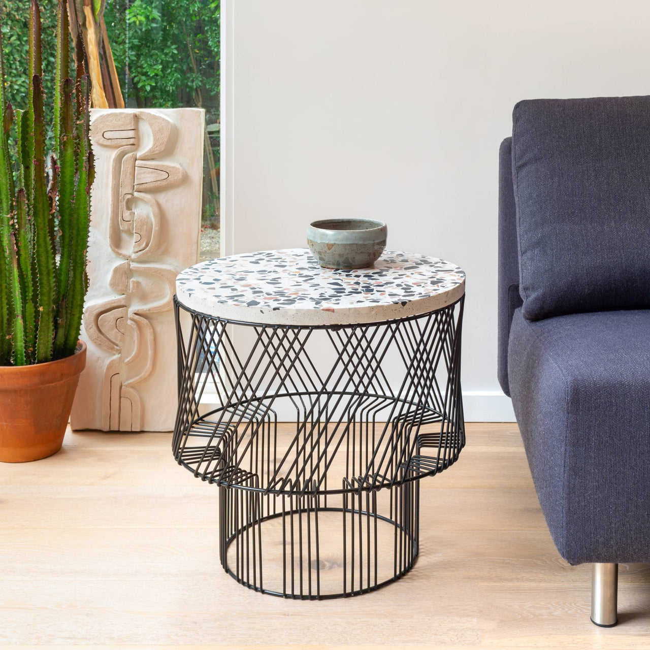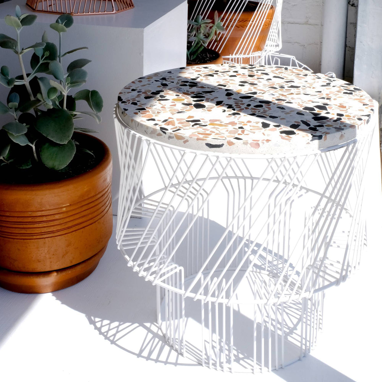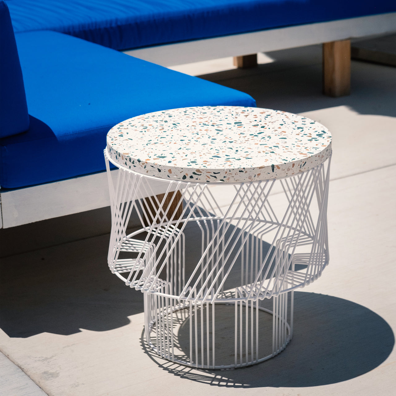 A multihued terrazzo tabletop brings a fresh dimension to Bend Goods designer-founder Gaurav Nanda’s signature metal wire. Teaming up with Concrete Collaborative produces a standout piece with a bit of retro flair that is both versatile and environmentally sustainable. For indoor and outdoor use, the side table’s wire base is hot-dip galvanized to prevent rust and powder-coated in a choice of colors.