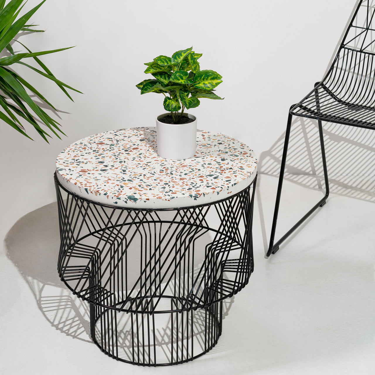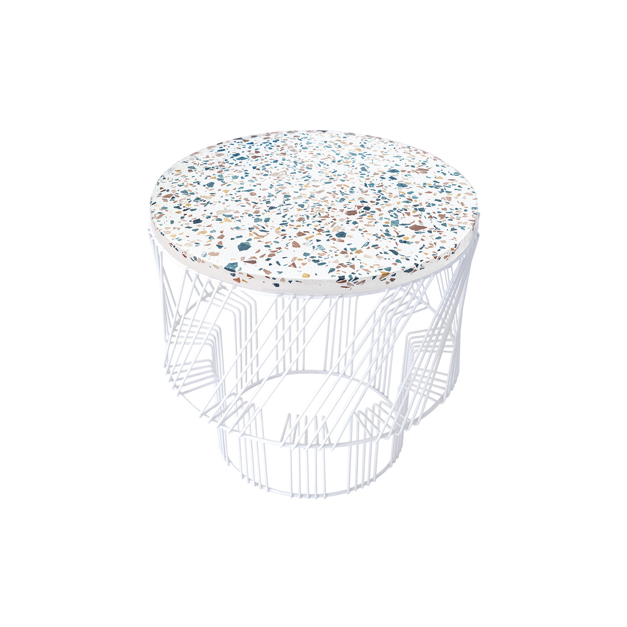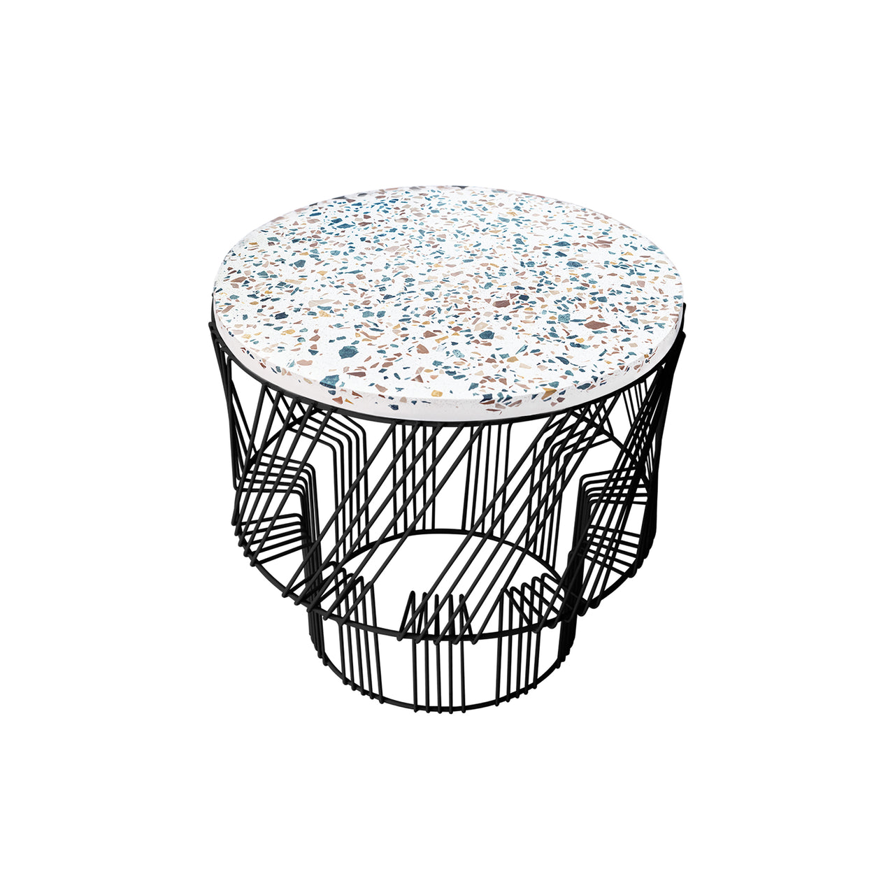 A multihued terrazzo tabletop brings a fresh dimension to Bend Goods designer-founder Gaurav Nanda’s signature metal wire. Teaming up with Concrete Collaborative produces a standout piece with a bit of retro flair that is both versatile and environmentally sustainable. For indoor and outdoor use, the side table’s wire base is hot-dip galvanized to prevent rust and powder-coated in a choice of colors.