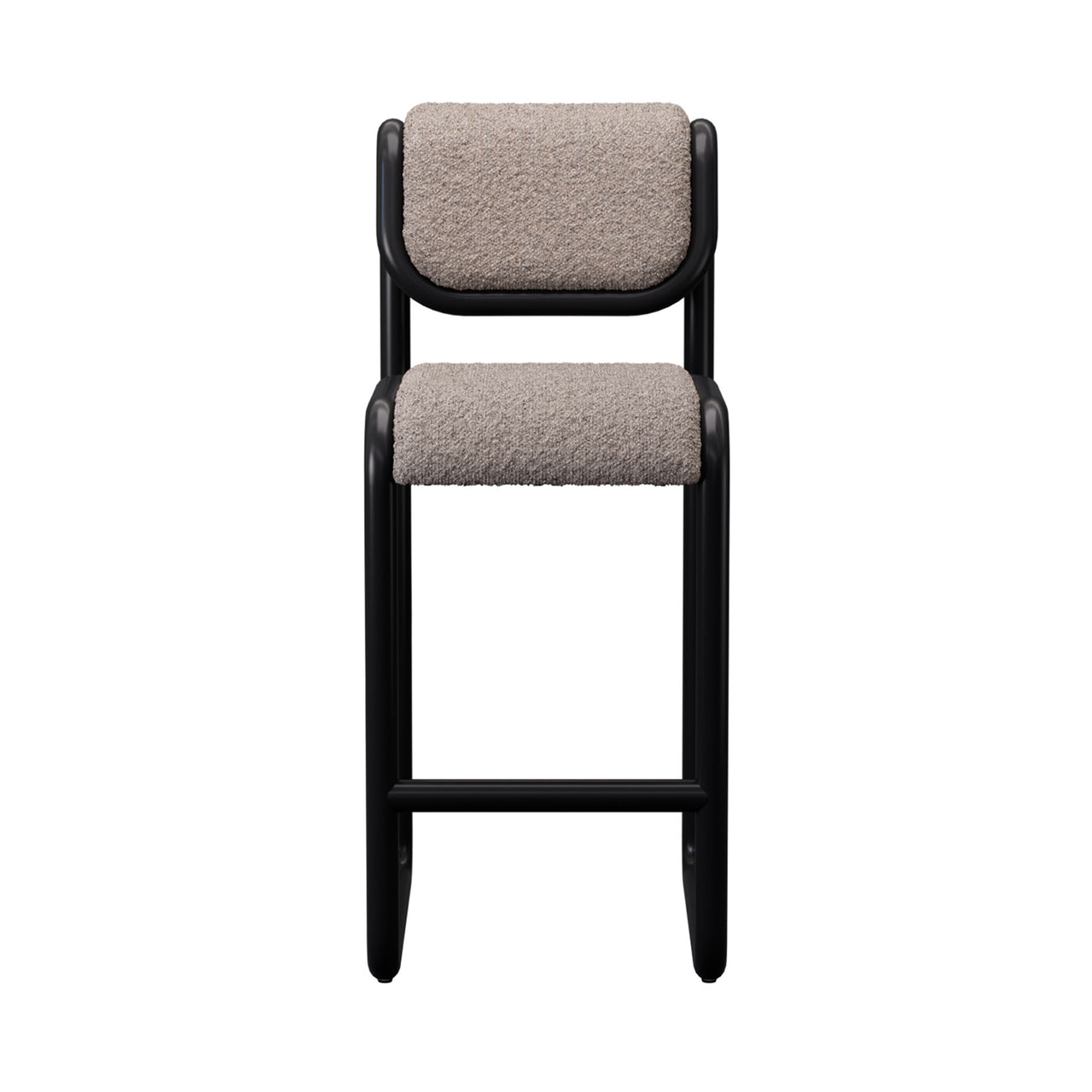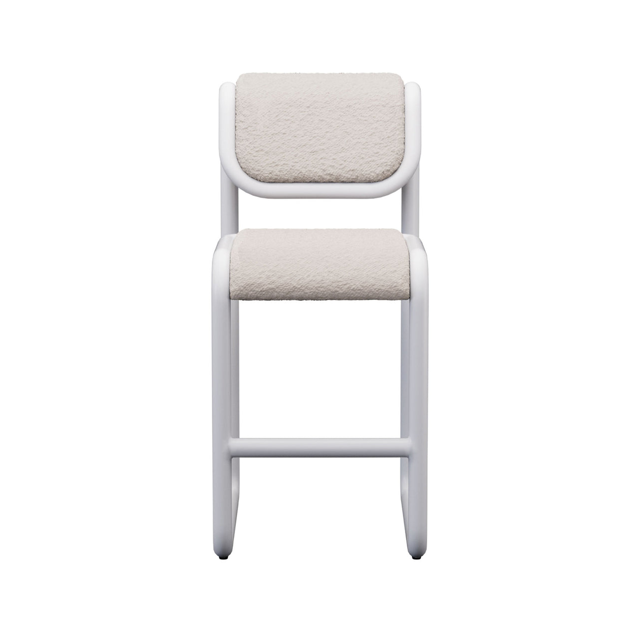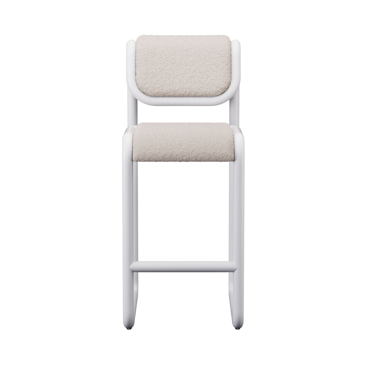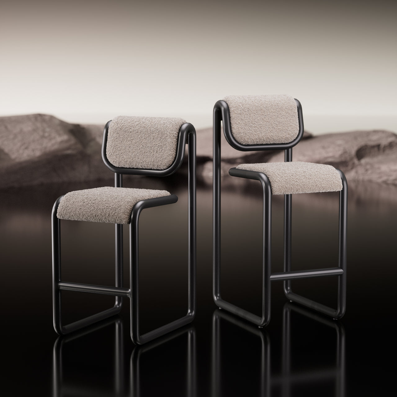 Elevating style in more ways than one, Bend Goods' captivating cantilever design includes a bar and counter stool with a padded seat and backrest featuring nubby bouclé or rich vegan leather upholstery. Tube collection’s signature bold frame is fashioned from sleek aluminum in complementary powder-coated hues.