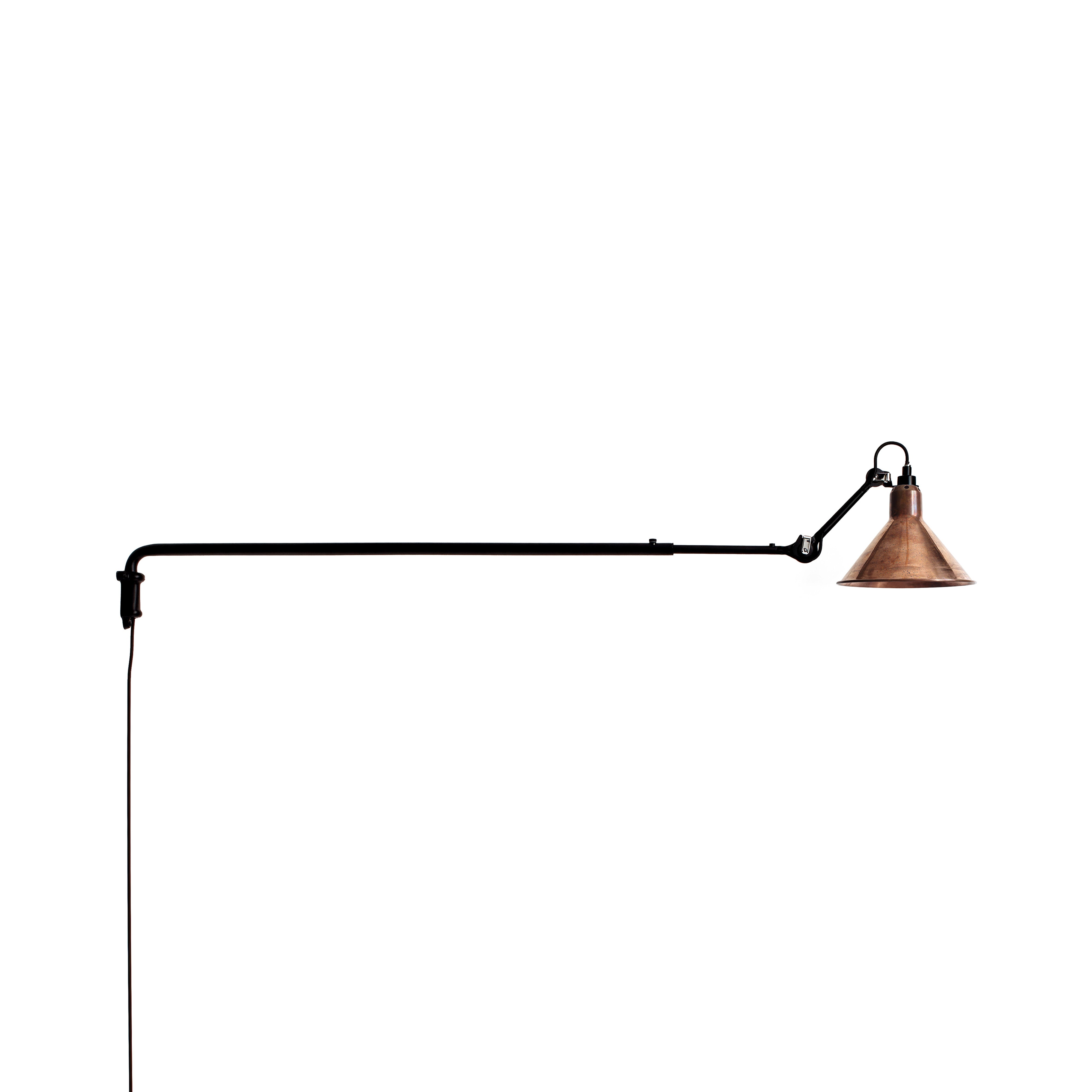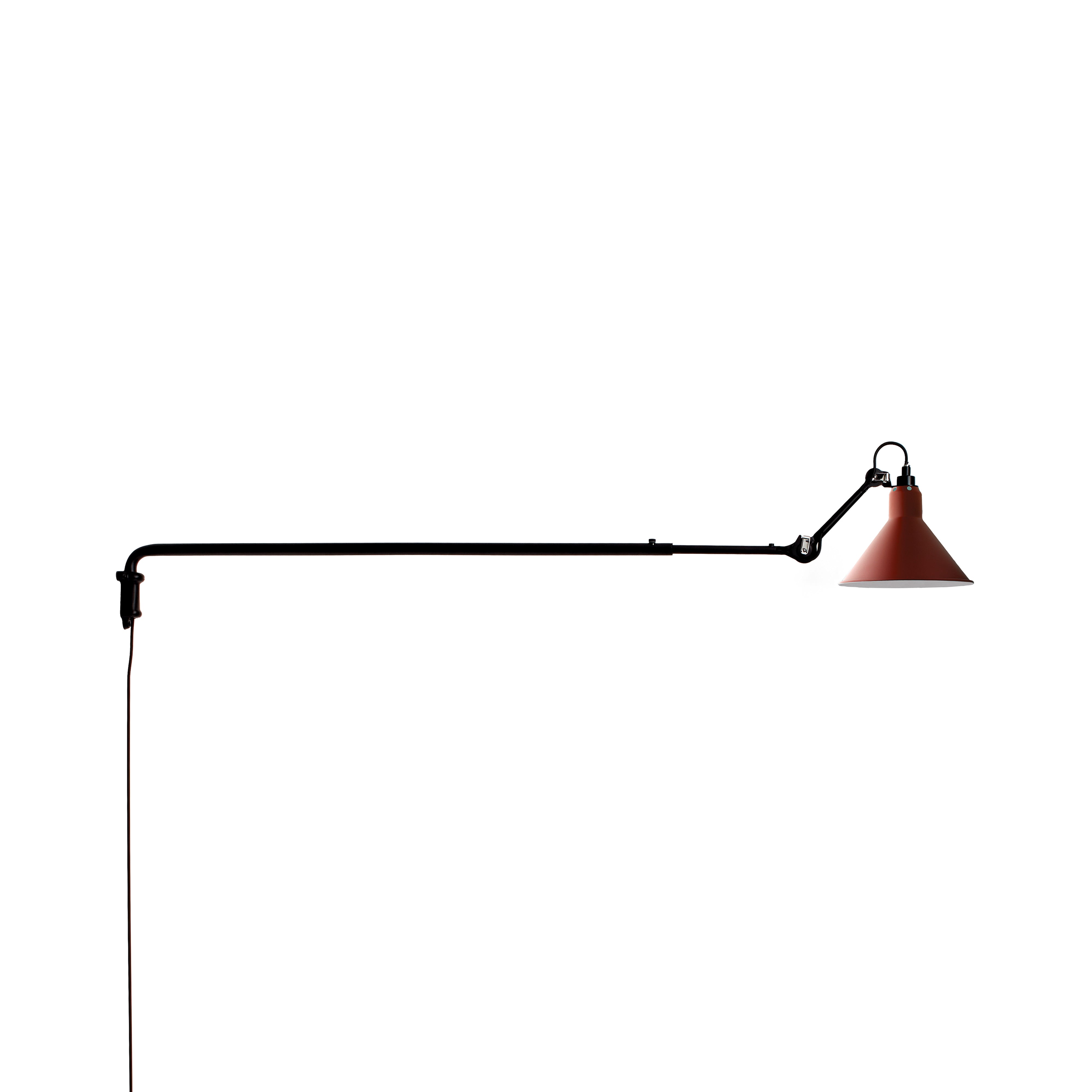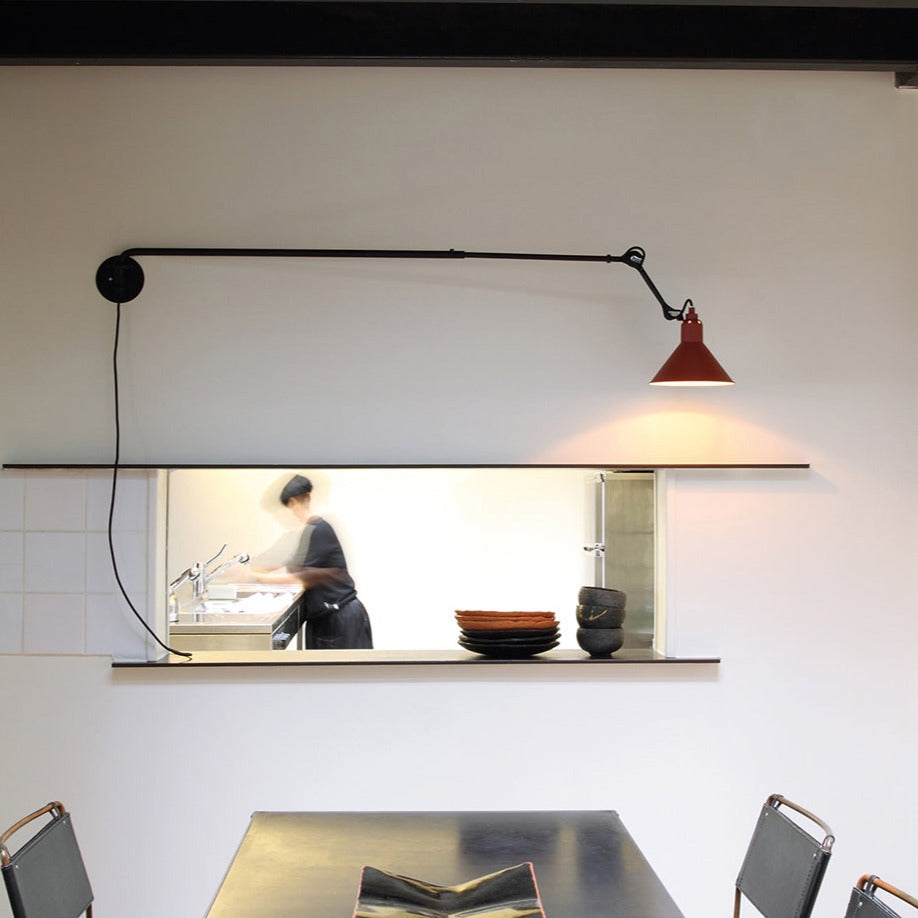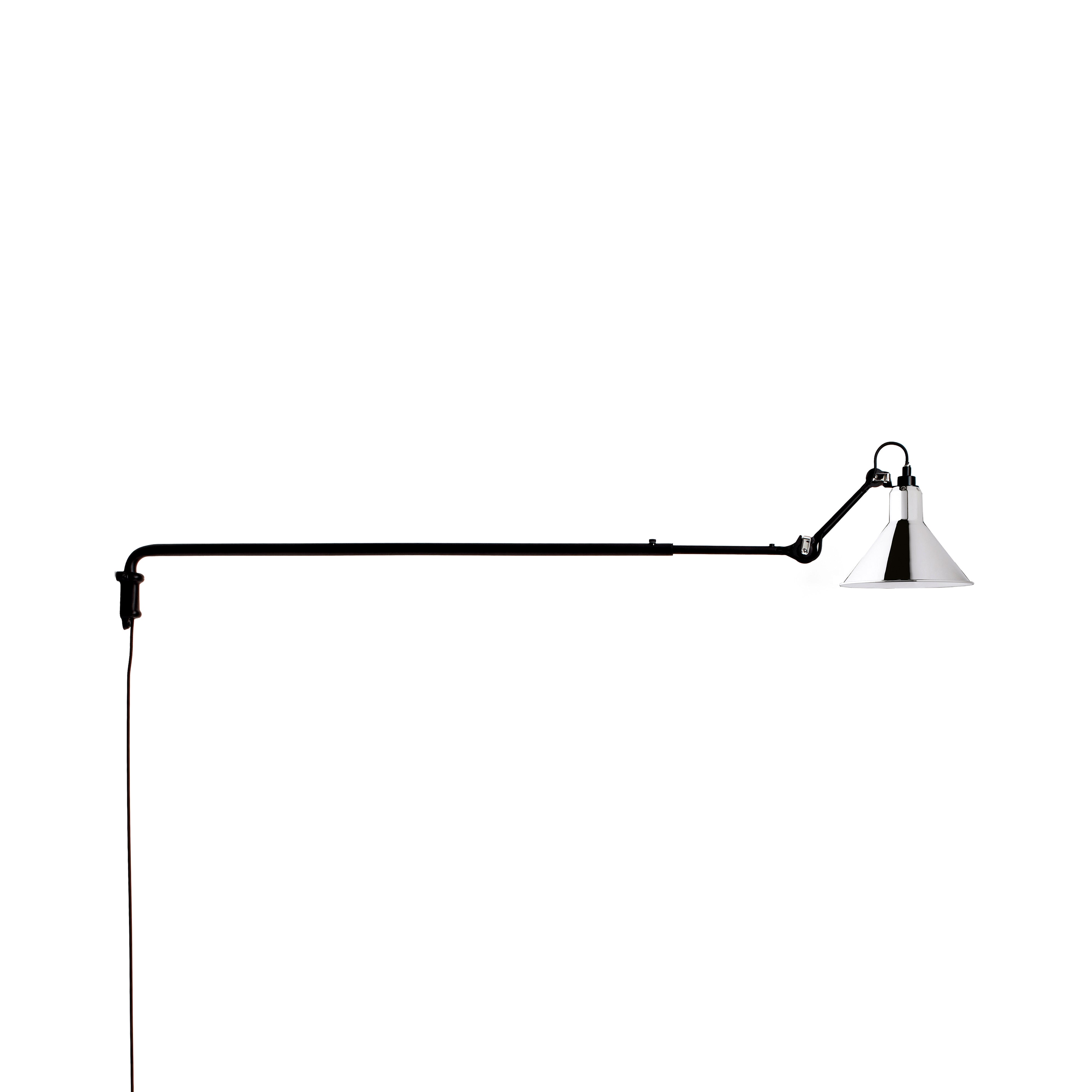 Surprisingly, the long arm of N°213 works both in smaller spaces to save floor space as well as in larger areas, where it might spotlight a desk, conversational grouping, dining table or even a piano. This variant in French designer Bernard-Albon Gras' 1921 series brings a dramatic visual sweep to his pioneering articulated lighting scheme with its usefulness in directing illumination exactly where it is needed most. With a timeless steel structure in black satin-finish, the wall-mounted lamp offers a choice of conic or round shade in a range of colors as well as chrome, copper or brass.
