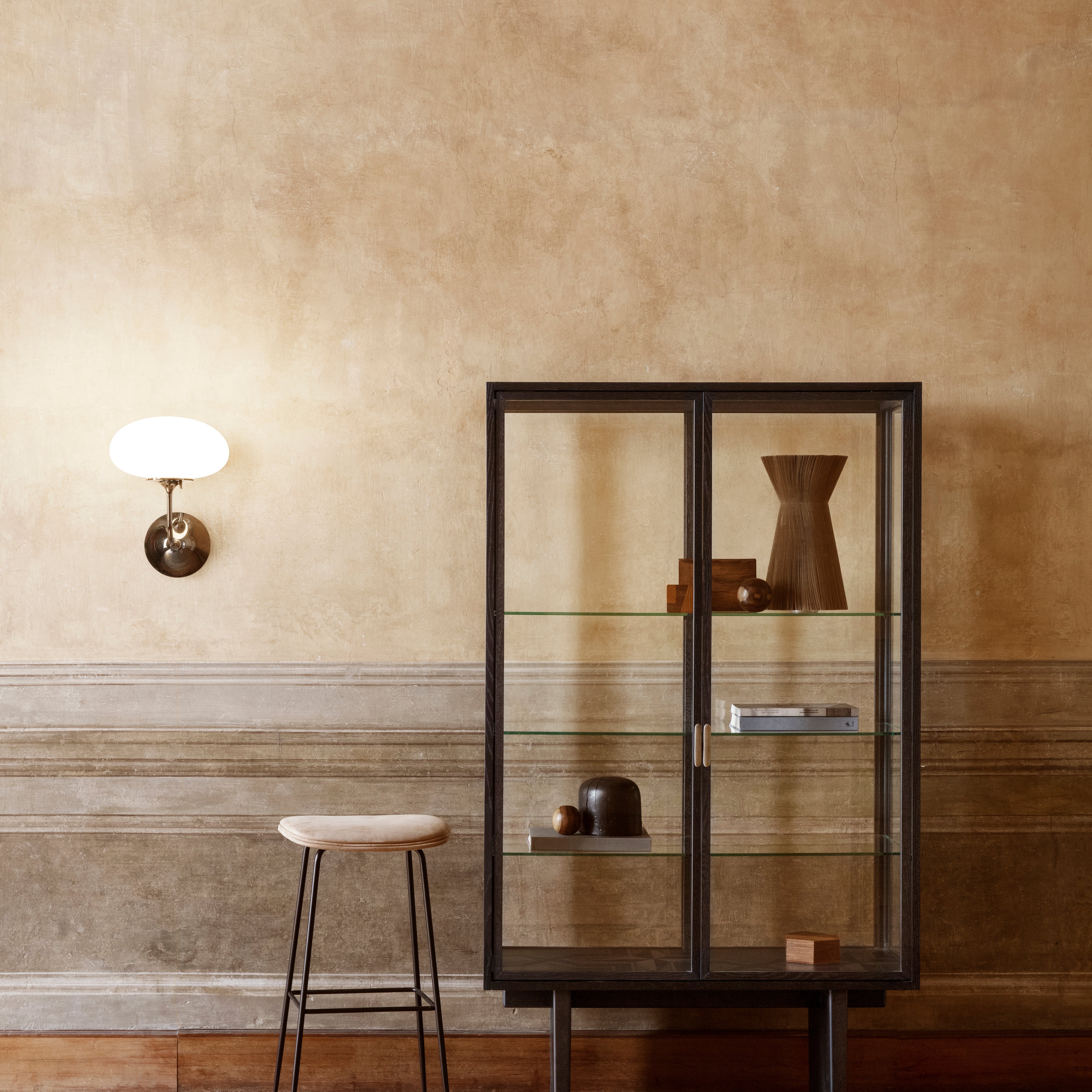 Stemlite's wall version appears to grow organically out of the wall, with a steel arm that turns up 90 degrees and is topped with a bulbous frosted glass shade. Pioneered by Cali midcentury designer Bill Curry, the 1962 lighting series is considered the first "total look" lamp—– a single piece that combines die-cast metal base, bulb and mouth-blown glass globe as a self-contained unit. The wall lamp also includes a dimmer function via a simple cylinder-shaped rotary switch underneath that gently rolls between the fingers from “on” through “off.”