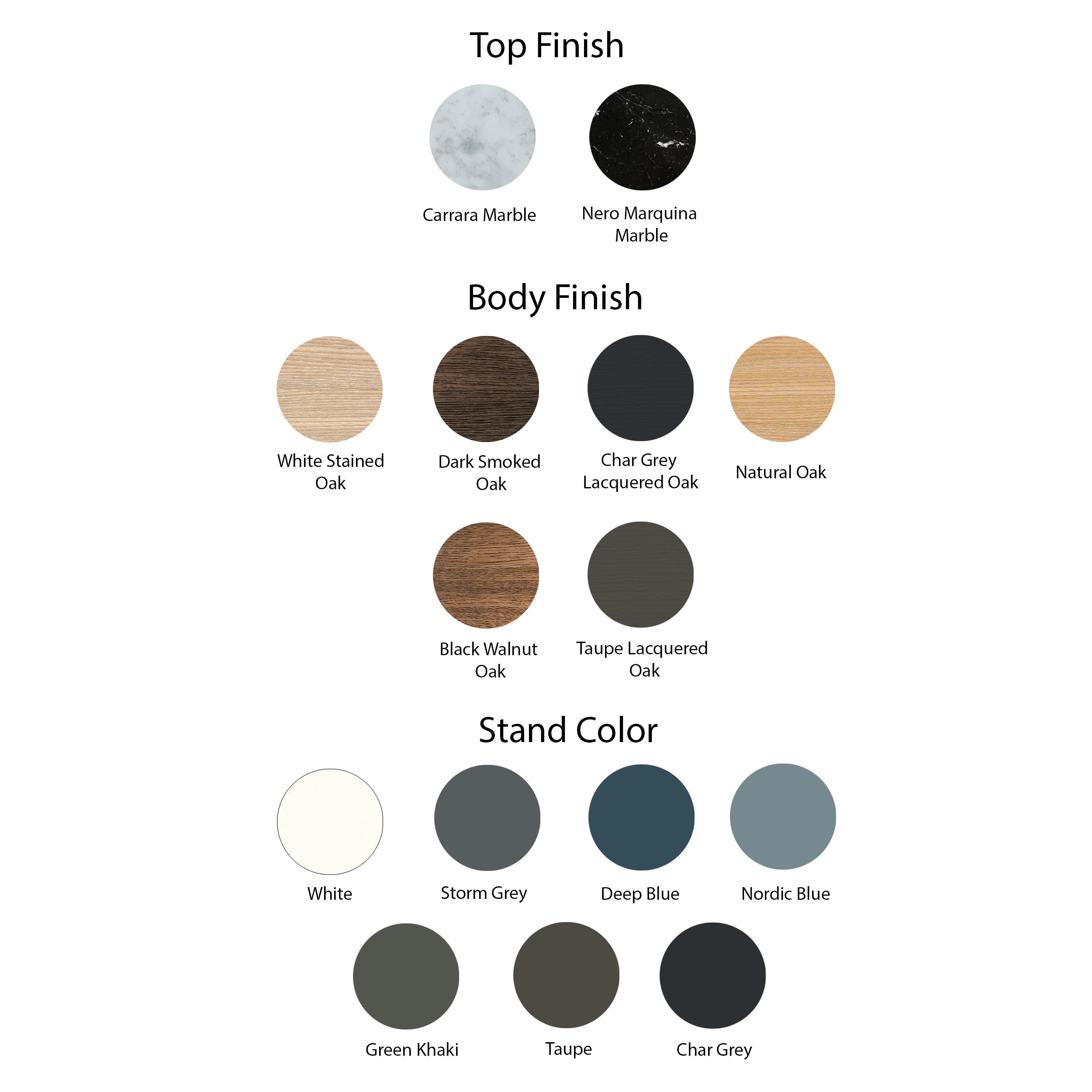 As this Luc 100 Cabinet handsomely illustrates, minimalism in design doesn't mean a lack of choices. With its appealing spare lines, this storage cabinet is topped with either clear glass with a shallow shelf below to display curios and collectibles or luxuriously creamy Carrara marble. In carefully chosen oak offered in 3 finishes with a lacquered metal base in a range of colors. Yet another statement piece from designers Mats Broberg and Johan Ridderstråle for Swedish modernist firm Asplund.