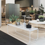 A longer, lower model completes the pair of Tati lounge tables from Swedish designers Mats Broberg and Johan Ridderstråle. Hewing to the range's signature curved profile and airy metal framework, it can be deployed on its own or in unison with its higher, smaller sister table. Asplund offers a variety of surface options in transparent and lacquered glass as well as genuine limestone and marble selections to pair with the array of lacquered frame hues.