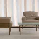 Here in a majestic but spare coffee table version, Tomoyuki Sakakida plays on Suki’s meaning as "to like," which the designer interprets as a tightly edited use of materials. A simple steel frame, in a choice of brass-plate or black powder-coat finish, grasps its respective slab tabletop in variegated Towada stone or an inky Urushi lacquer finish. In a pleasing nearly square shape, the table updates the Japanese idiom of eloquent simplicity to complement any seating area.
