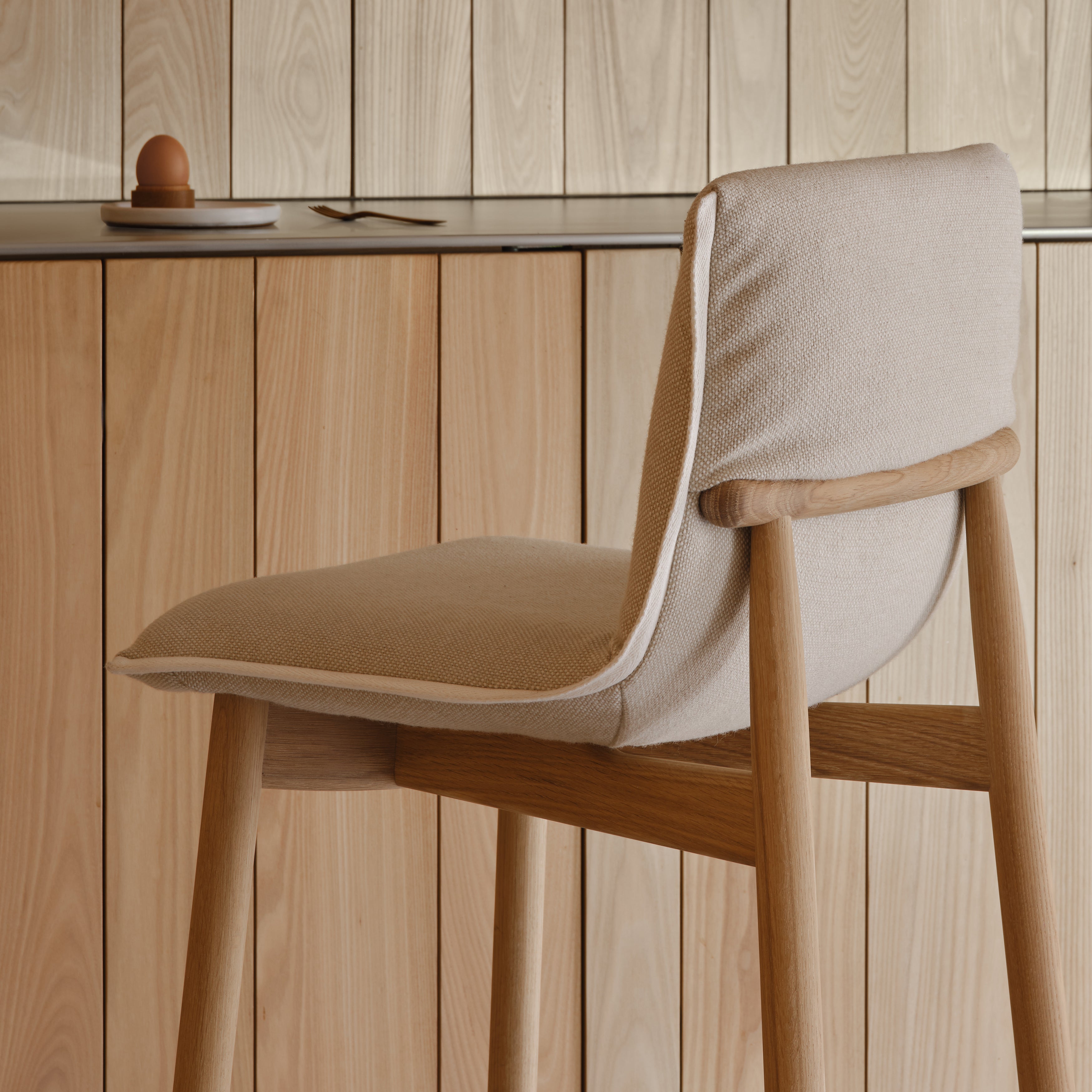 Bordered in a natural hue, the Embrace series adds a handsome counter stool with its signature folded-cushion seat that combines optimal comfort with an offhand elegance. Designed by Austrian studio EOOS for Carl Hansen & Søn, E007 is structured in solid oak or walnut with an array of available finishes and a brushed stainless steel footrest. Upholstery in a choice of a premium textile or buttery leather offers further customization to suit its intended surroundings.