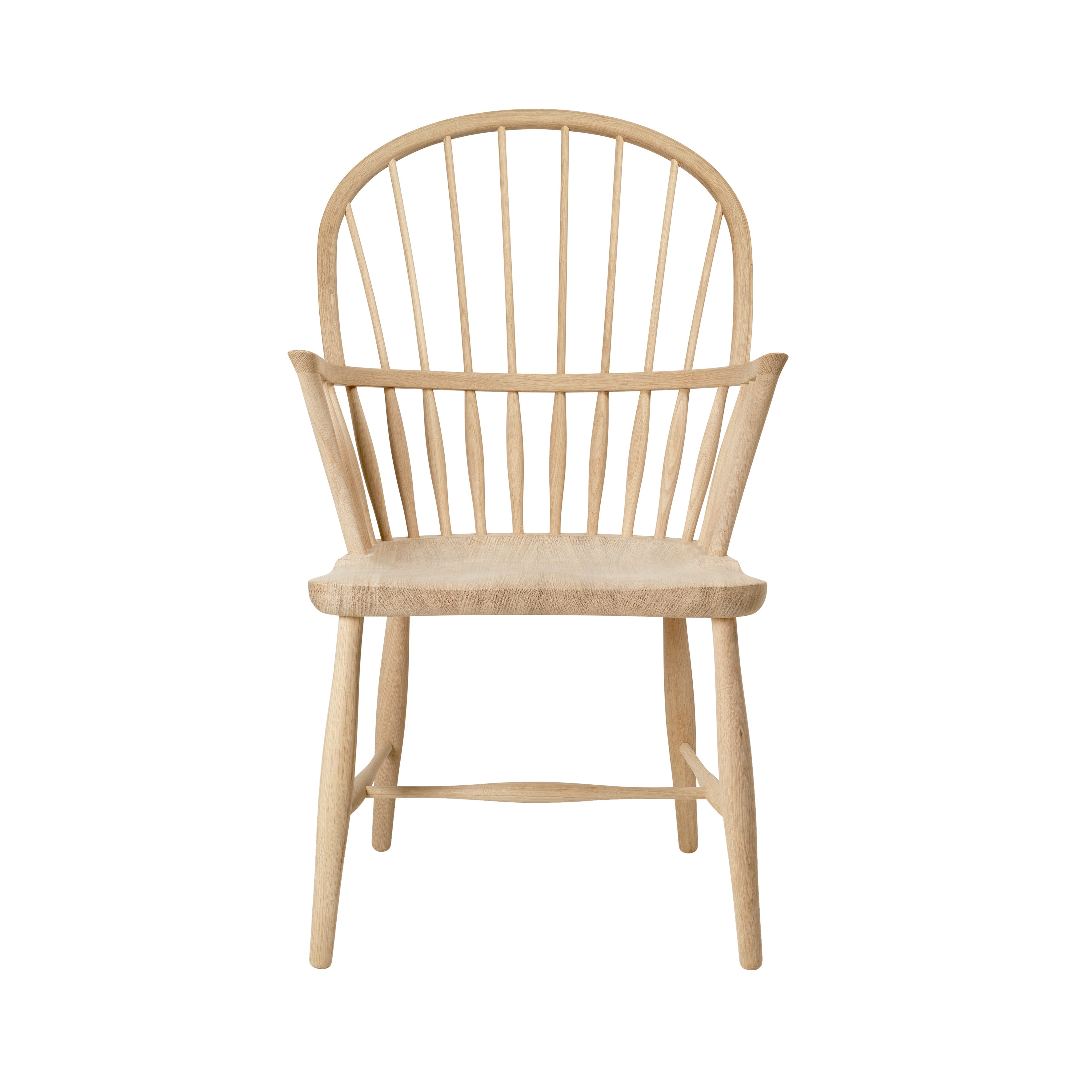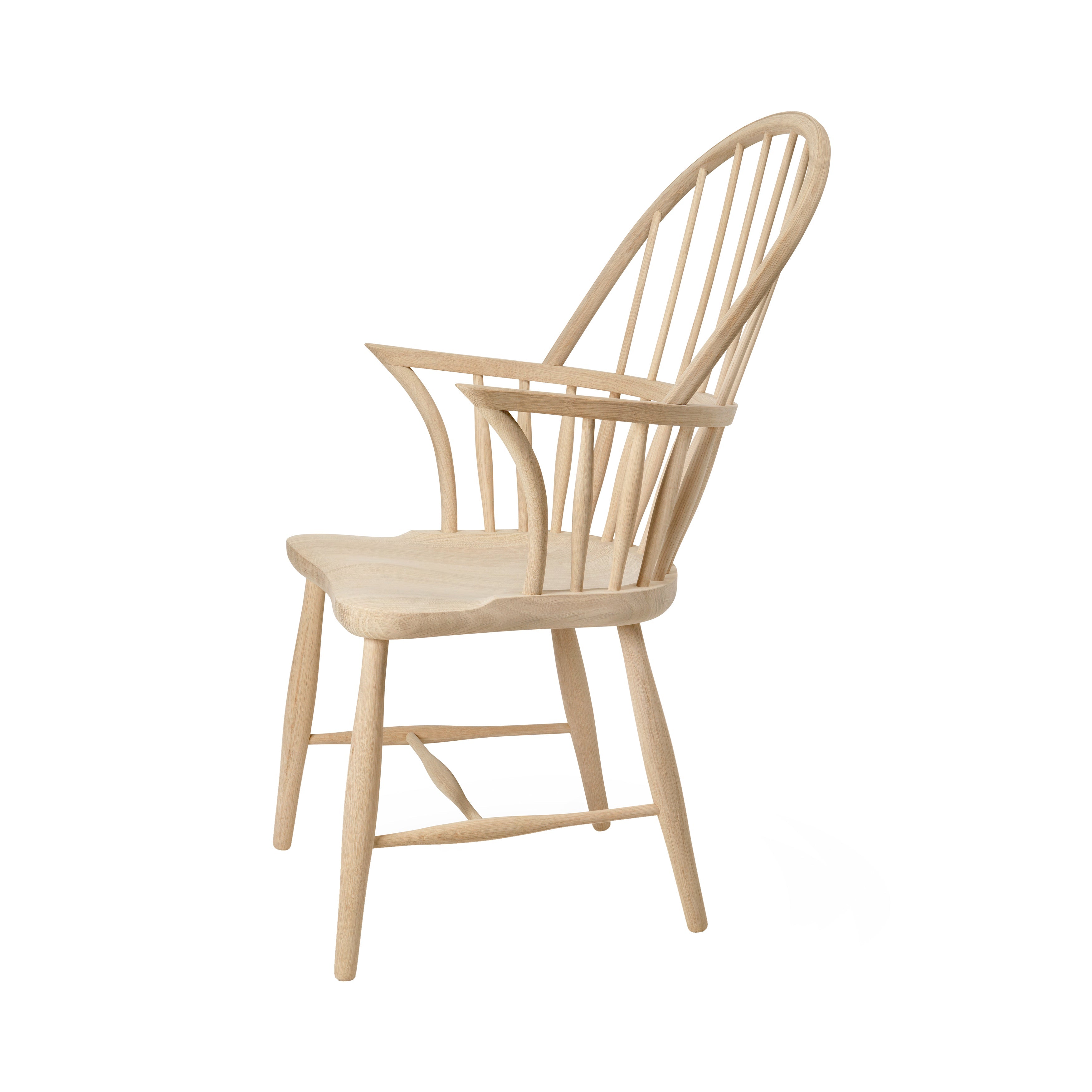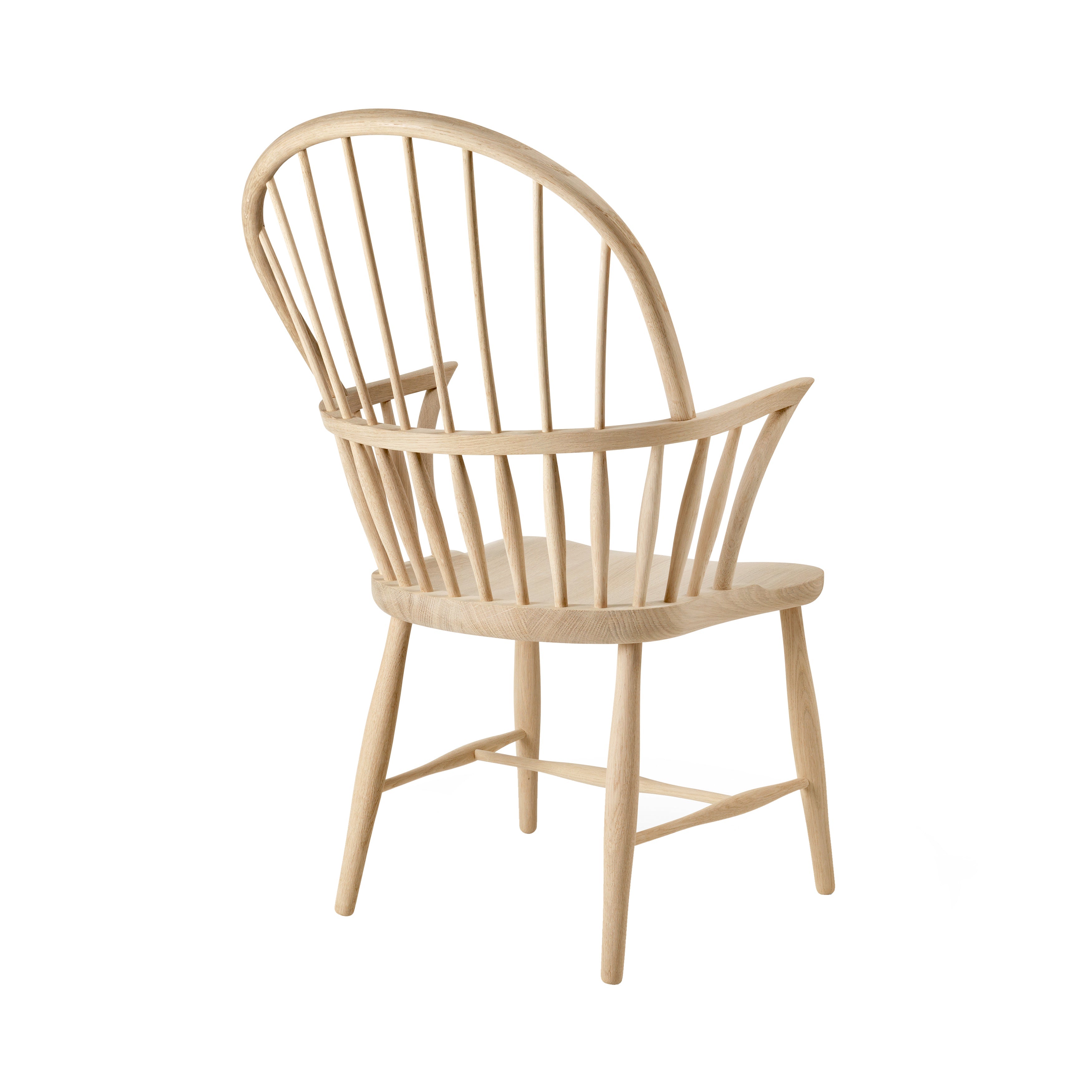 Originally designed in 1938 by Danish architect and cabinetmaker Frits Henningsen and in continuous production at Carl Hansen & Søn until 2003, Windsor Chair is now reissued with modern comfort in mind. Characterized by a carved wooden seat on which the base and the backrest are directly fixed, thin spindles are fitted into a top curved piece of wood, forming its familiar profile. A cross between a dining chair and a lounge chair, the Henningsen version requires the skills of an experienced carpenter and is precision-shaped from solid FSC-certified oak and sanded by hand, a distinguished example of traditional craftsmanship refined over centuries.