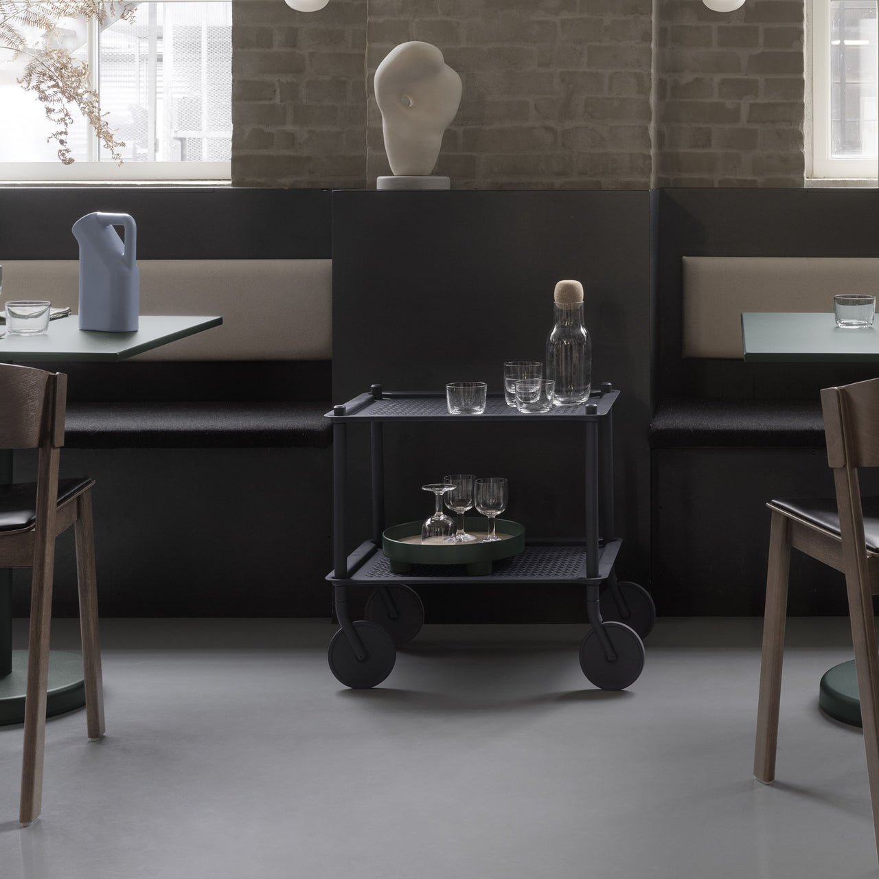 Flow shifts the elements of the usual rolling trolley with its slim frame, embossed metal tray shelves and oversized wheels. Paris’ Normal Studio adds a monochrome look for its modern storage piece suited to the home, workplace or hospitality setting. With movable room-to-room flexibility, it comes in 2 or 3 shelf versions in a choice of powder-coated hues.