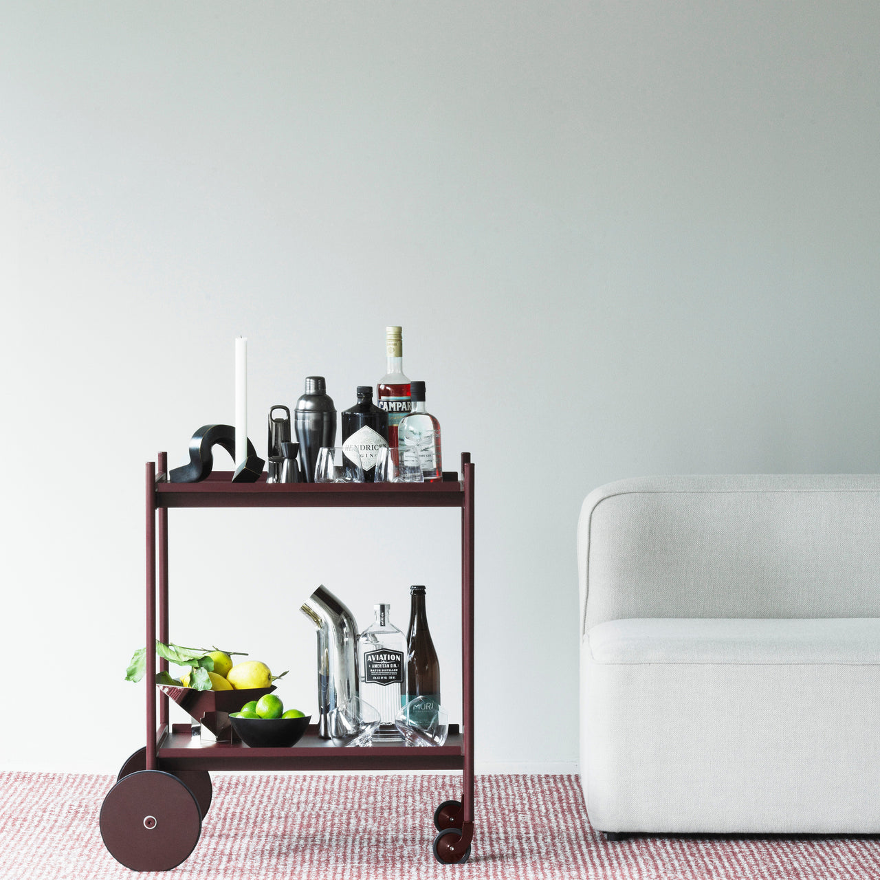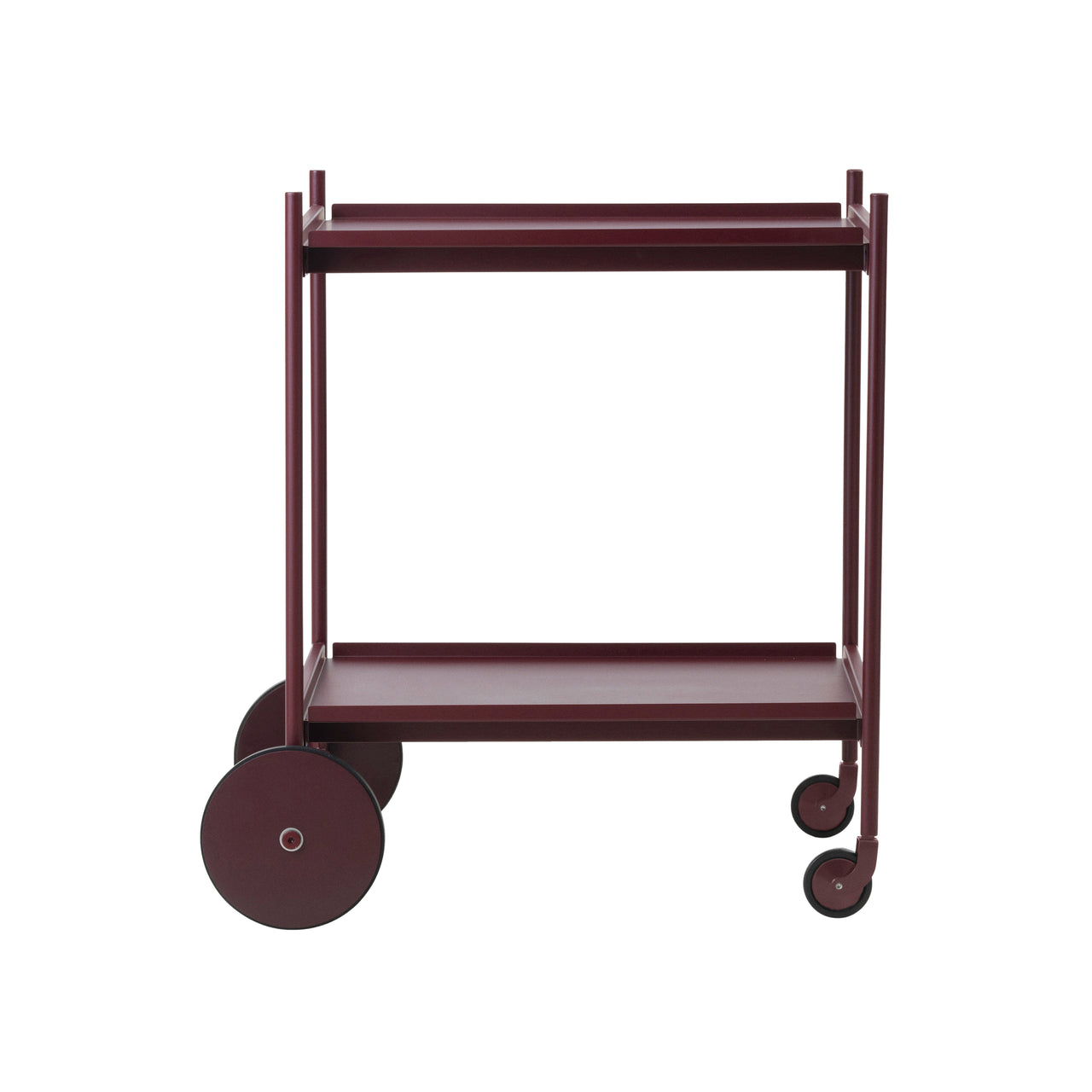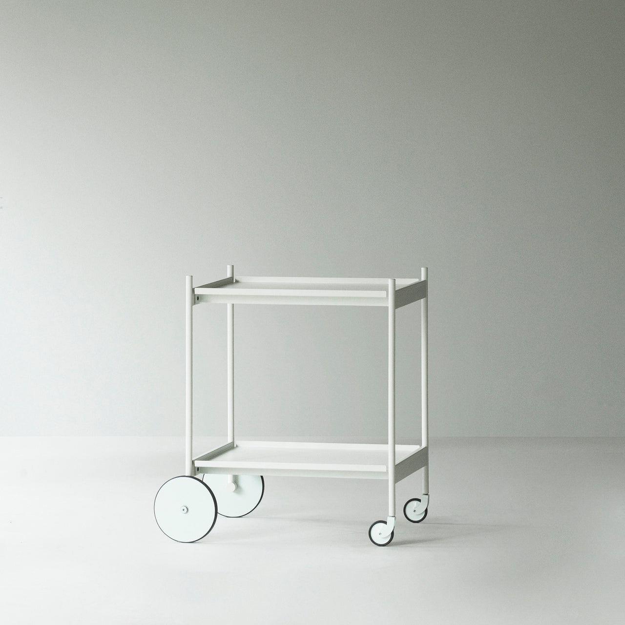 The Block Trolley serves as a side table, serving cart, or storage unit. It features two steel trays supported by ash wood legs, with integrated handles for easy movement. Four wheels allow it to glide smoothly between spaces, making it useful as a tea trolley in the dining room, a coffee table in the living room, or a nightstand in the bedroom. Available in 3 colors.