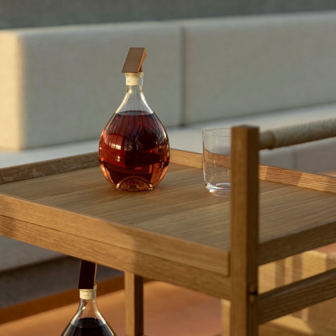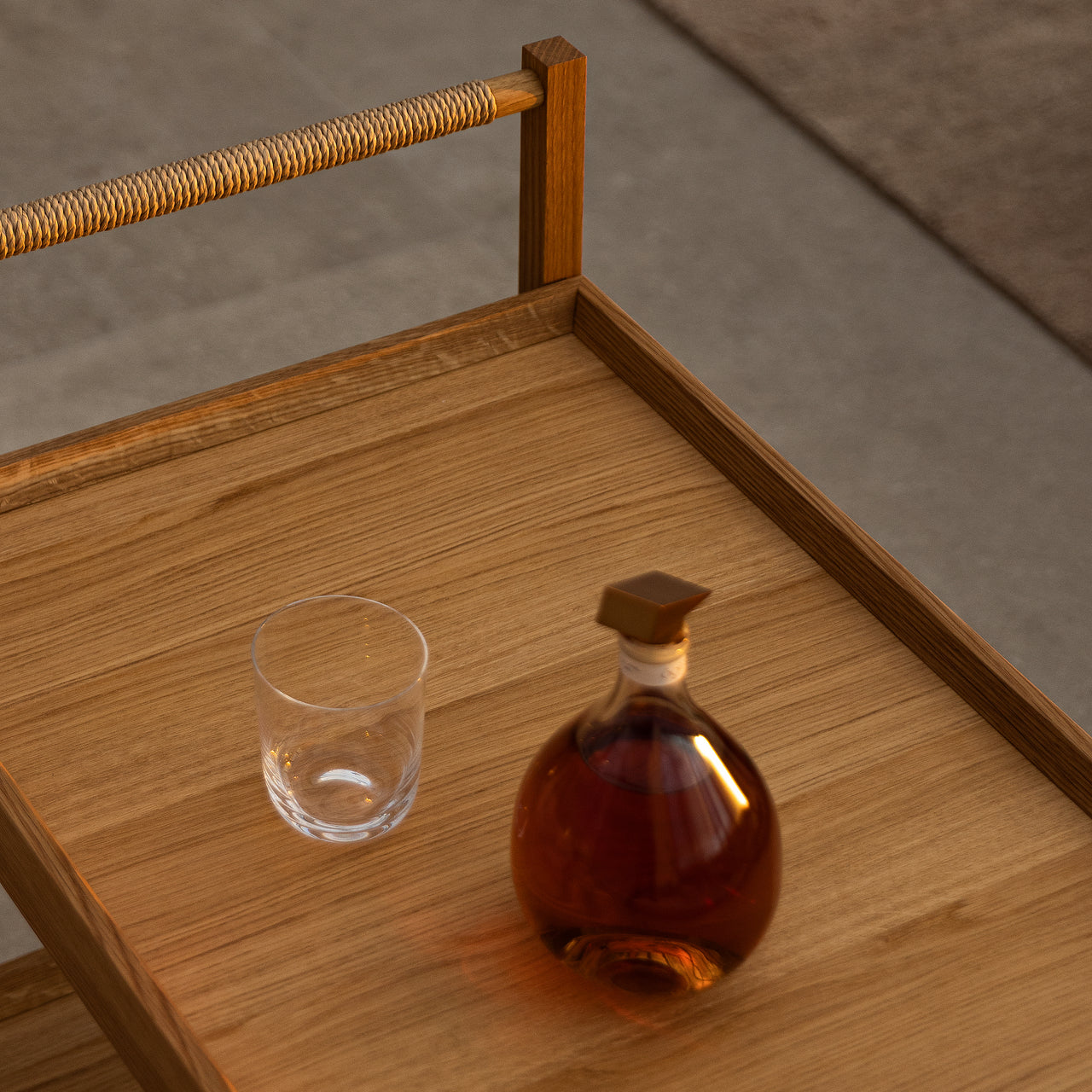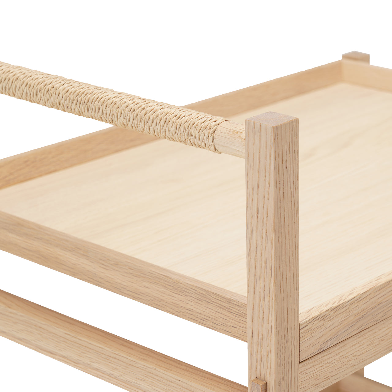 Exploring the similarities between Eastern and Scandinavian aesthetic expression, Norm Architect’s rolling oak cart was partially inspired by umbrella and shoe racks seen by the entrance of Japanese temples and shrines. With construction that resembles those shelving systems and joinery detail in a contrast wood hue, Karimoku Case's double-shelf N-T01 also features a handle covered in paper braid for a tactile fillip.