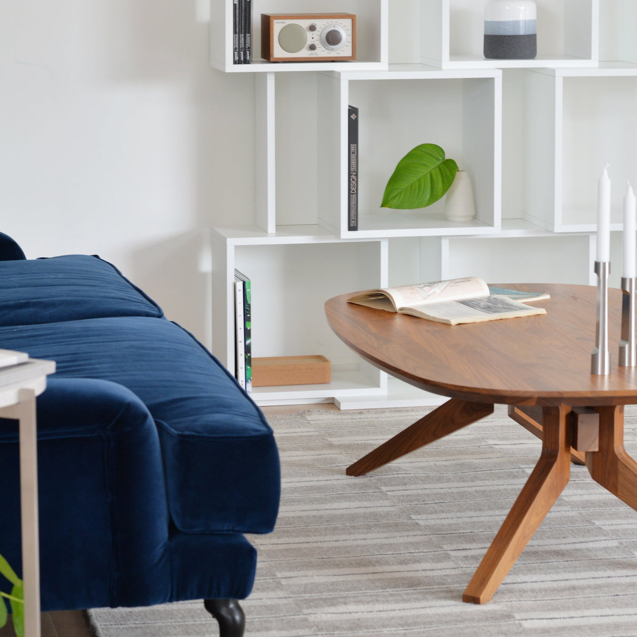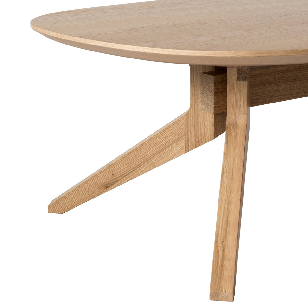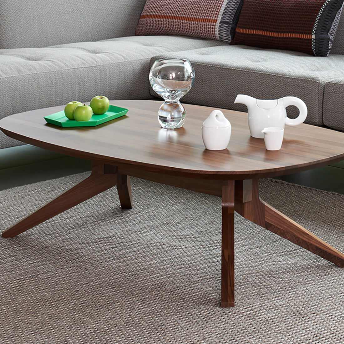 With an elongated rounded surface, Matthew Hilton augments his Cross series with an oval coffee table with a distinctive trestle-style base and angled legs. Fashioned in solid oak or walnut with a veneered top, the clear lacquer finish enhances the warmth of the wood while assuring low-maintenance care for this timeless piece.