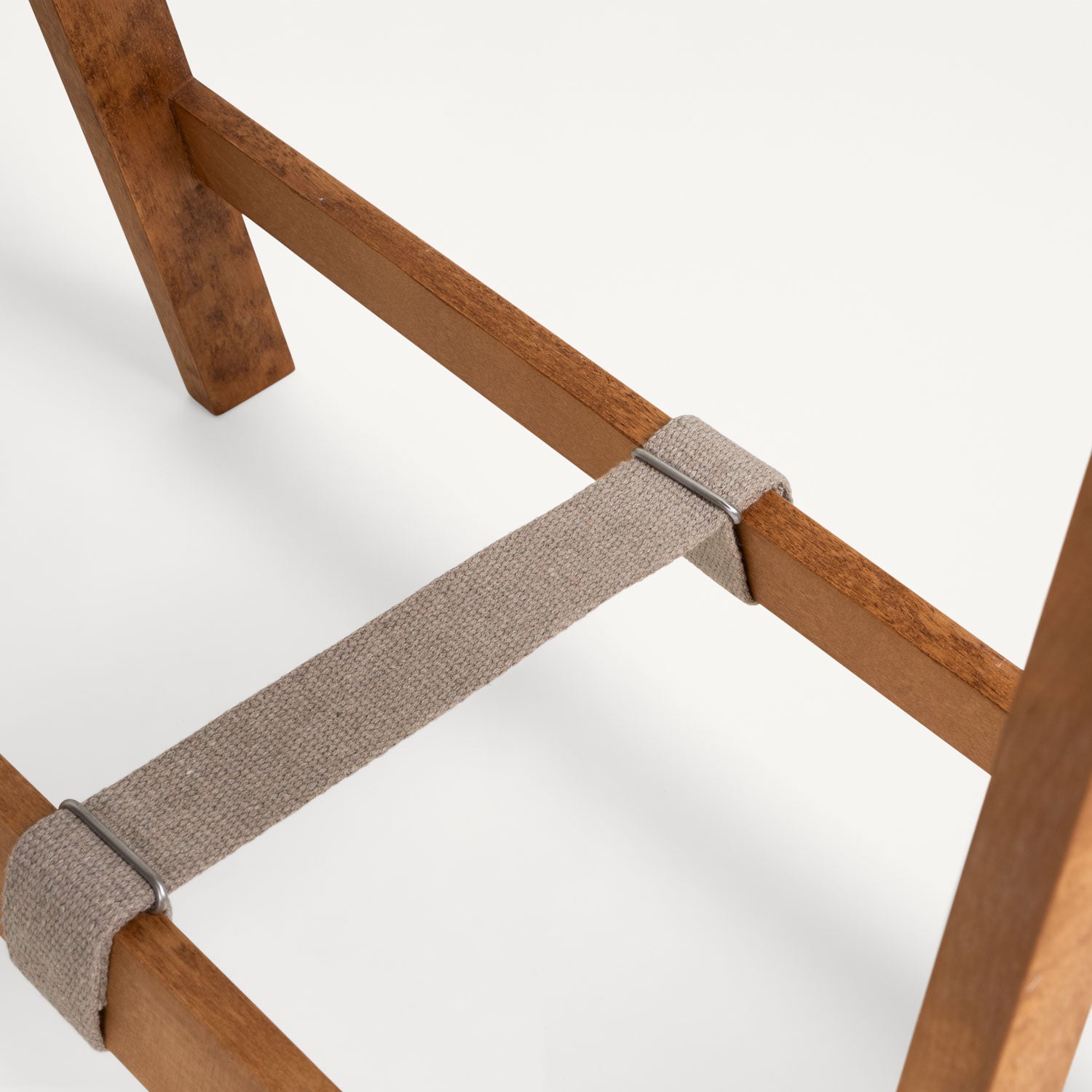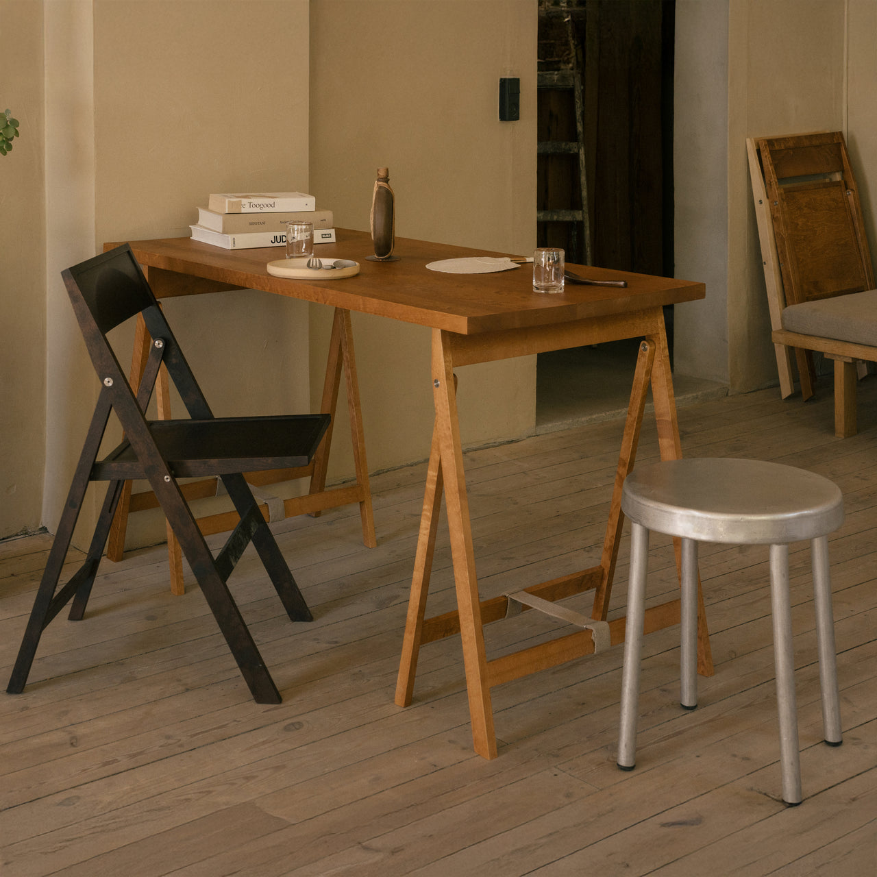 This folding trestle table provides a practical surface for various spaces. It consists of two separate components: folding trestles and a tabletop, making it easy to move and store. The trestles can be paired with different tabletops and are stabilized by non-slip gel pads and recycled cotton webbing. Made from brown birch wood, the table is both durable and lightweight.