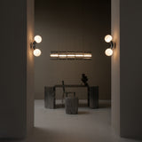 In a 5-module version, like its sister horizontal variations, Column 300 scales up Lukas Peet’s column-like light fixture suggested by Grecian architecture. Lending definition and ambiance to an interior space, the fluted pendant glows with gently diffused LED illumination. The individual machine mold-blown glass segments are available in either a clear carbon color or a stone-like powdered ivory, both with aluminum fittings, and the light comes in a choice of color temperature options.