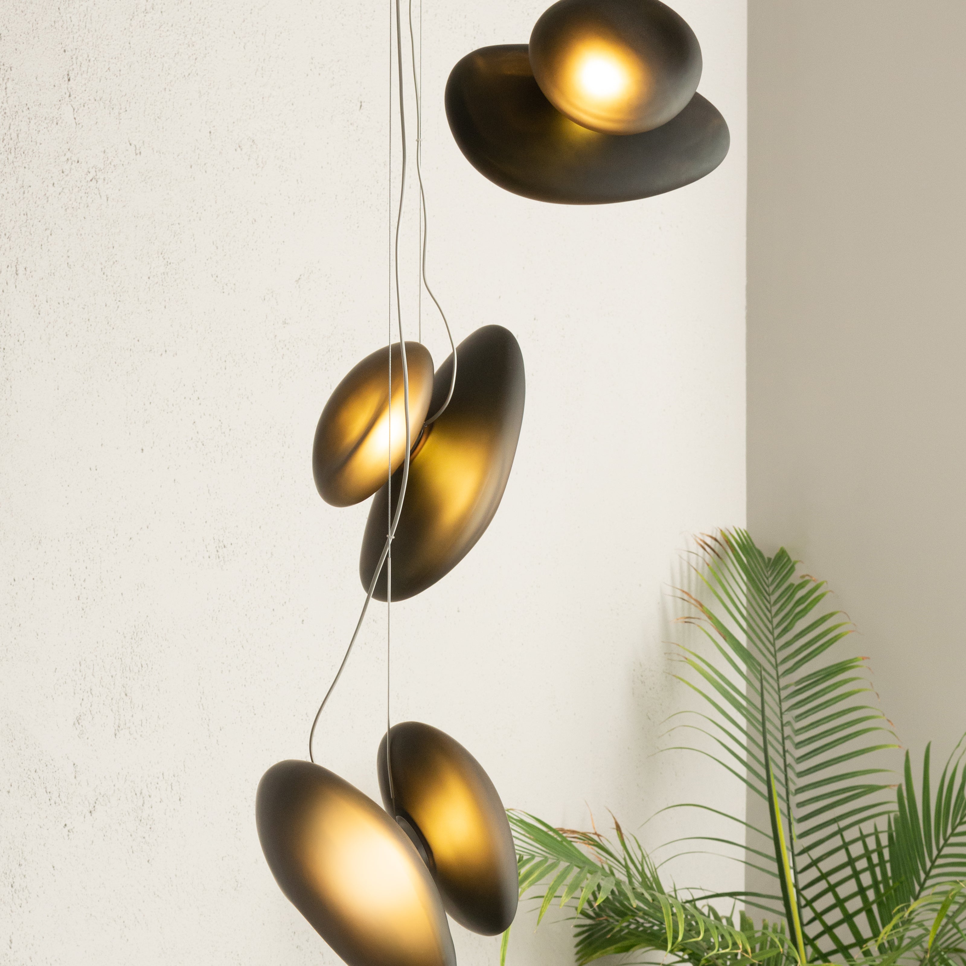 Chandelier 3 is a triple play of Pebble pendant lights that create a radiant arrangement at staggered heights. From a round canopy, the chandelier features the individual double-form lights, each joined by a machined-aluminum connector and powered by an integrated LED. Designer Lukas Peet was inspired by the natural formation of river rocks and his blown-glass interpretation comes in a glowing range of single or mixed hues.