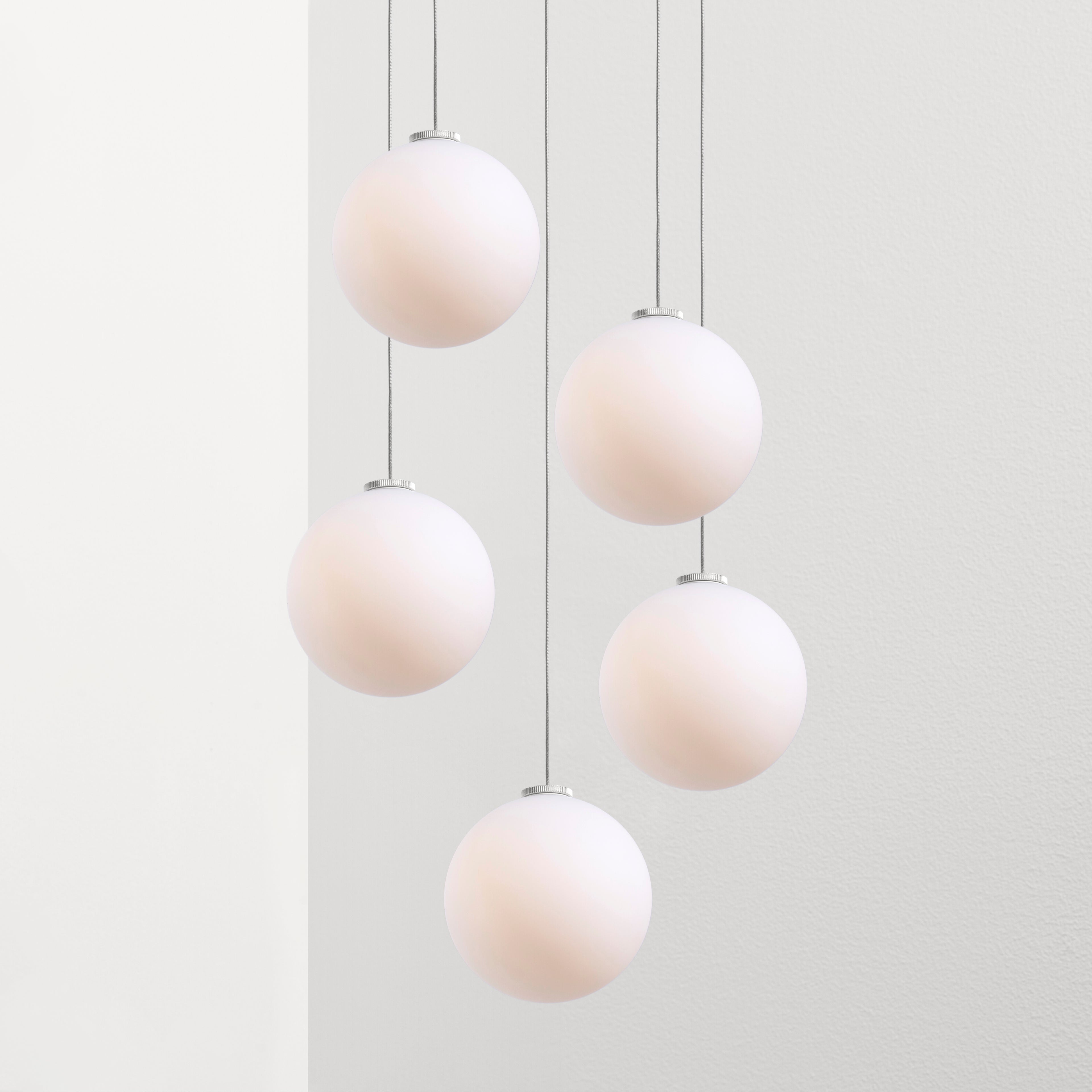 A staggered array with 5 of its namesake 120 millimeter globe pendants in shimmering acid-etched glass brings a striking mid-size option to the Glass series. Along with the enduring power of beautifully crafted simplicity, Toronto-based Anony adds precise local manufacturing and the latest technology. With versions offered in brushed aluminum or brass, the chandelier also comes in 3 illumination selections with candlelight, warm white or soft white LED color temperatures.