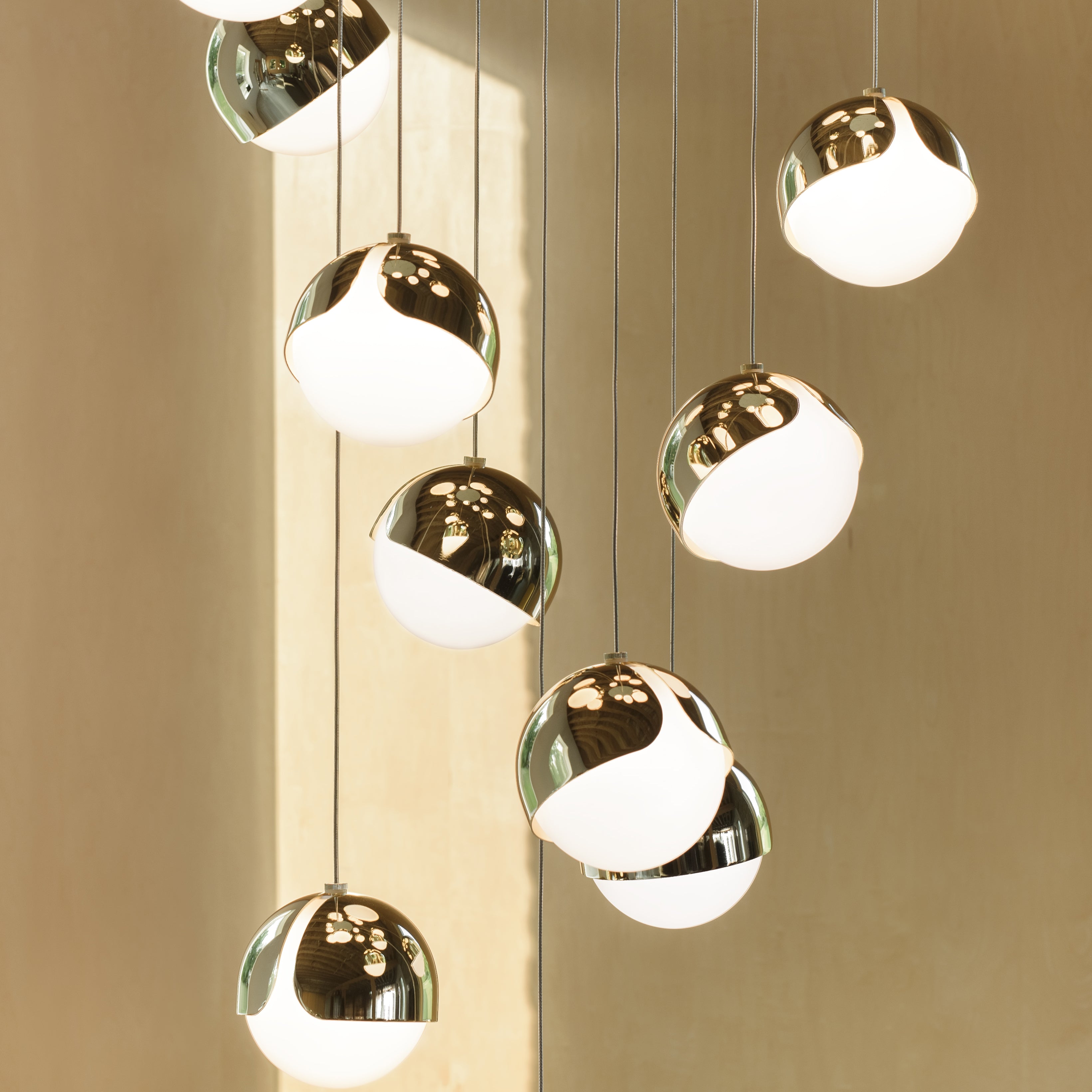 In a spectacular staggered array, Ohm’s blockbuster chandelier numbers 19 individual opal globe lights embraced by the series’ distinctive curvy metal shades. Canadian designer Darryl Agawin and Toronto studio Anony devise their play on a conventional glass sphere by adding the orbiting shade that can be adjusted to modulate the radiant LED glow. Offering a choice of color temperatures for candlelight, warm white or soft white illumination, this statement-maker is available in gleaming chrome, copper or brass metallics or equally chic matte black or white.