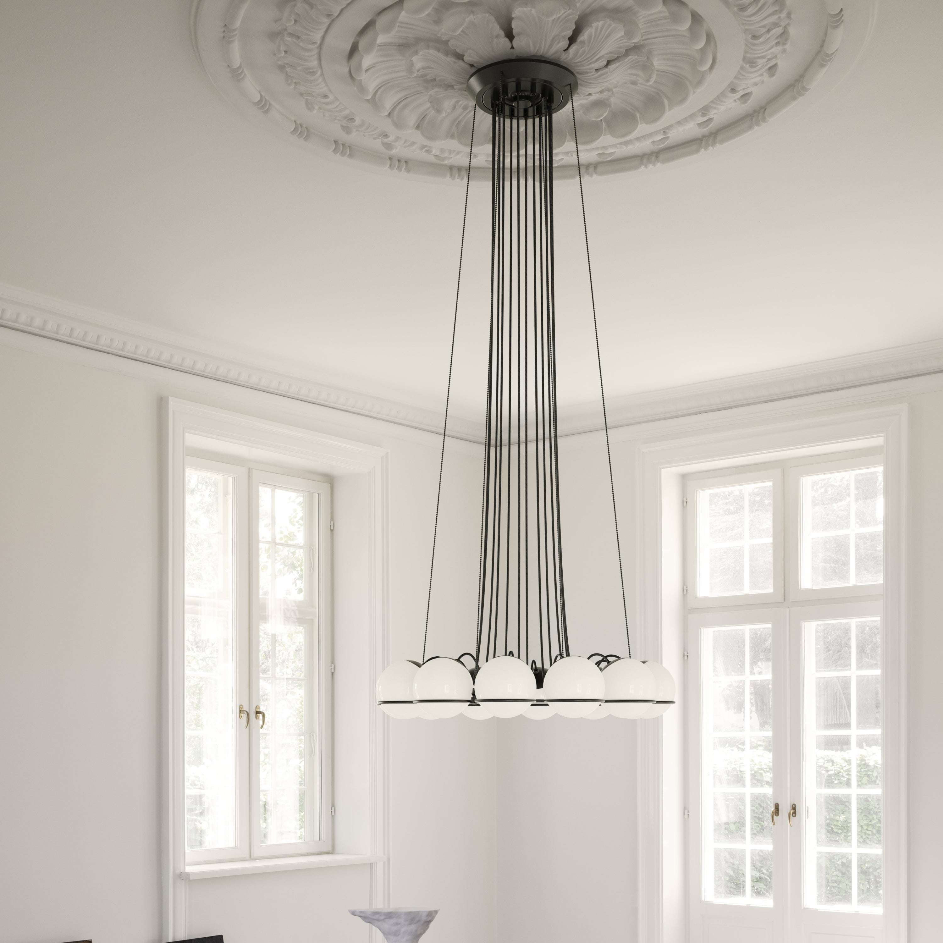 Midcentury lighting master Gino Sarfatti took inspiration from the moon itself for his 1959 chandelier Le Sfere. A soaring armature suspends the circle of the mouth-brown opaline glass spheres held in place by individual aluminum rings with the lyrical framework offered in a choice of graphic black or gilded champagne finish. Astep, founded in Copenhagen by Sarfatti's grandson Allessandro, reissues Model 2019 in a choice of 16 large or small spheres or the breathtaking marvel of 24 small spheres, under license with its original producer Flos and handcrafted in Italy.