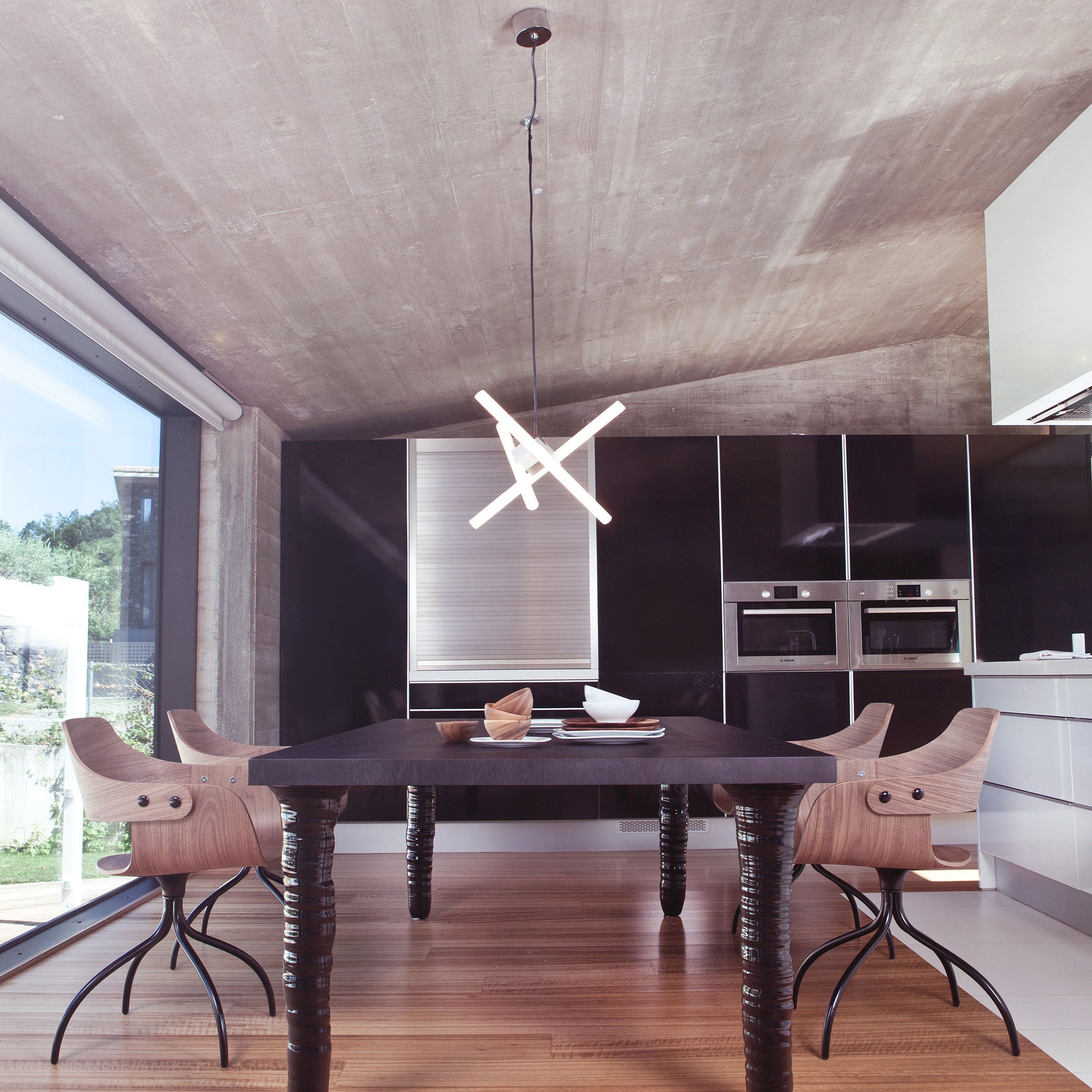 Stashed away in a drawer, Pepe Cortés' geometric 1976 Olvidada (its very name means “forgotten”) was finally rediscovered and put it into production in 1984, becoming a Spanish design classic. Now rejuvenated with LED technology, its iconic burst of bulbs makes a striking statement solo or in multiples, with a choice of black, brass or copper suspension rod.
