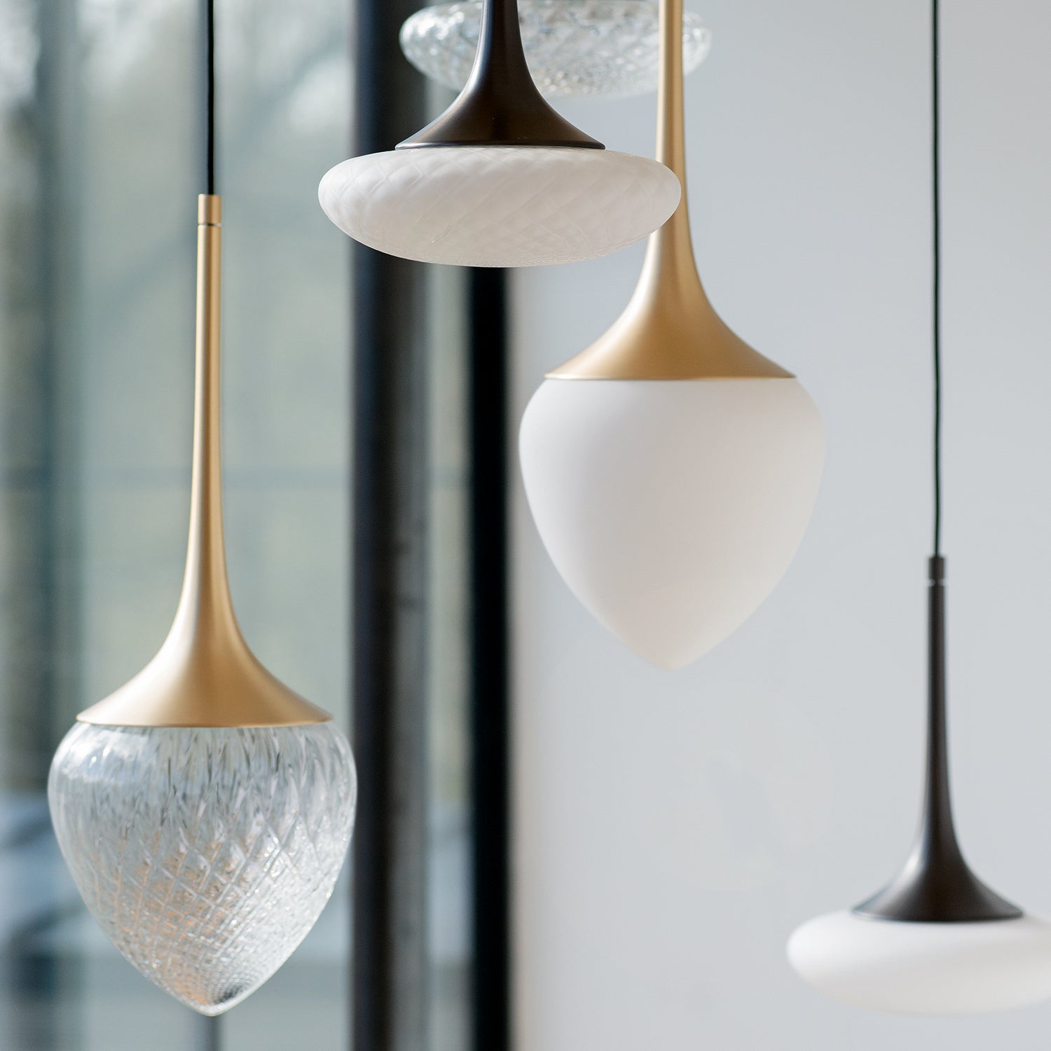 Like its smaller Louis brother pendant, the larger version recalls the age of jazz with its trumpet shape. Chose from a range of chic metal finishes for the solid-brass fixture, with an elegant mouth-blown diffuser in a choice of clear or opal patterned glass. A standout alone or lovely in a combo when mixed with the smaller Louis or CVL's complementary Flèa lighting range.