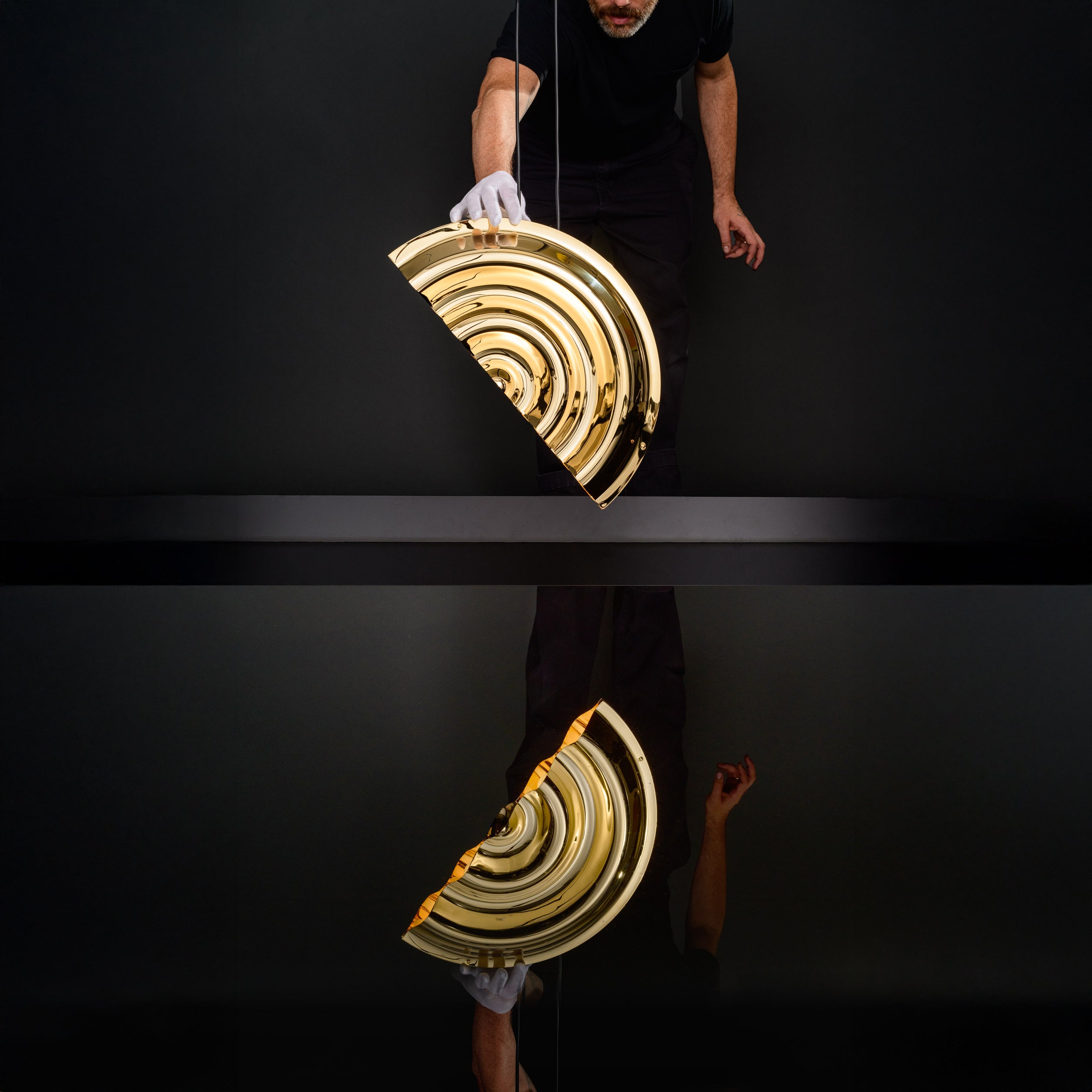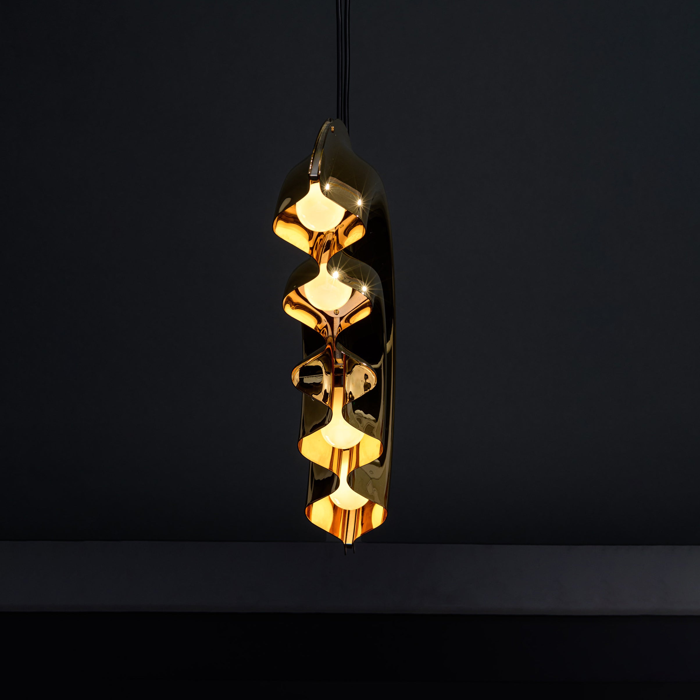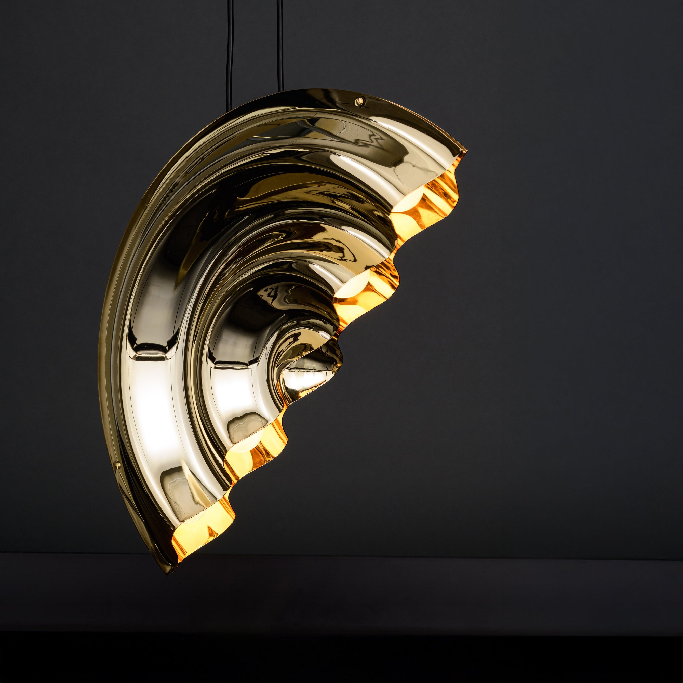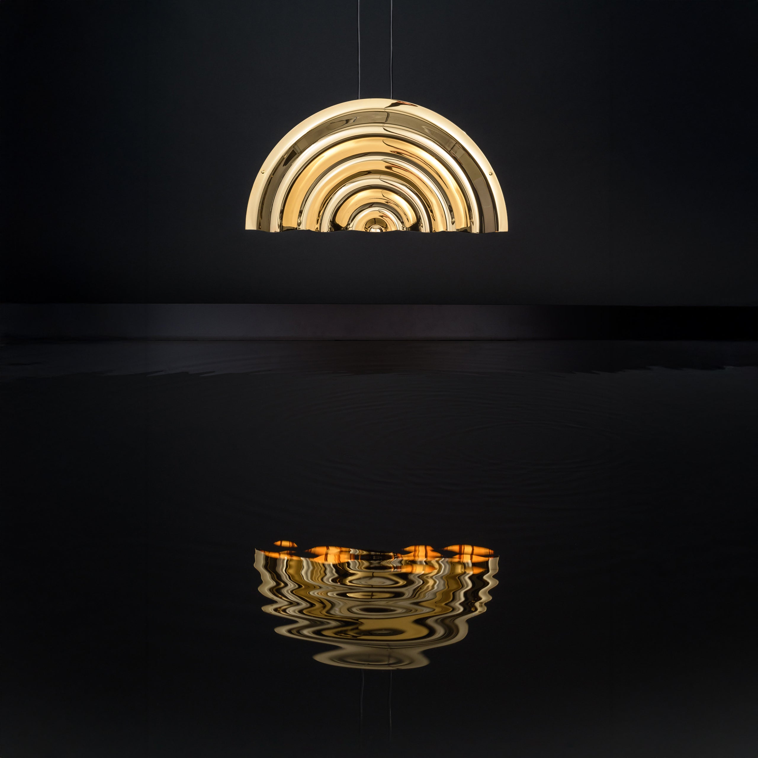Inspired by the Doppler effect, the Doppler Pendant features a glossy finish reflecting light strikingly. Available in Ivory, Black, Chrome, and Gold, it complements different spaces. It uses a replaceable LED bulb that emits warm white light and is dimmable for adjustable brightness.