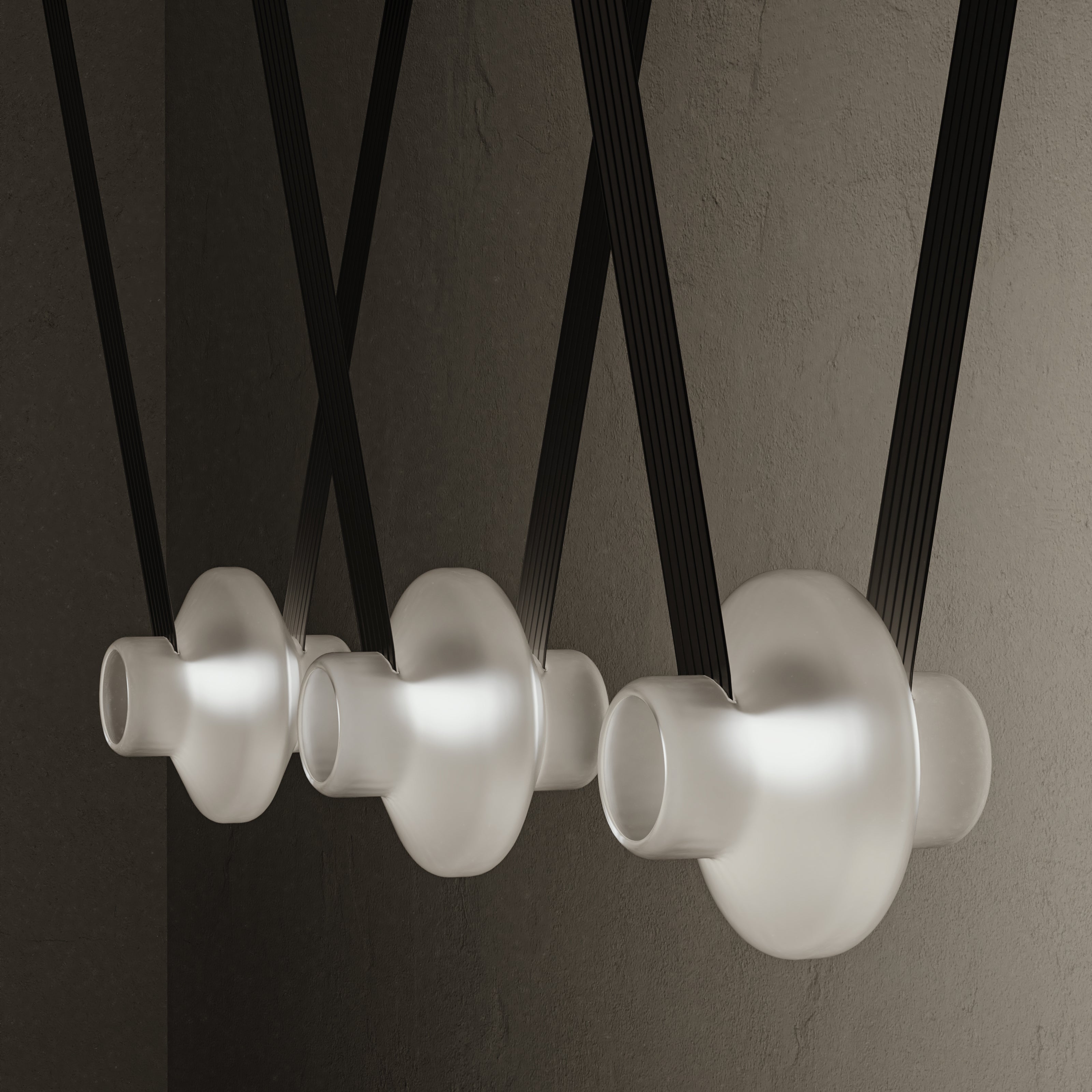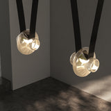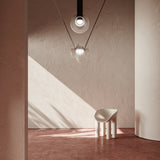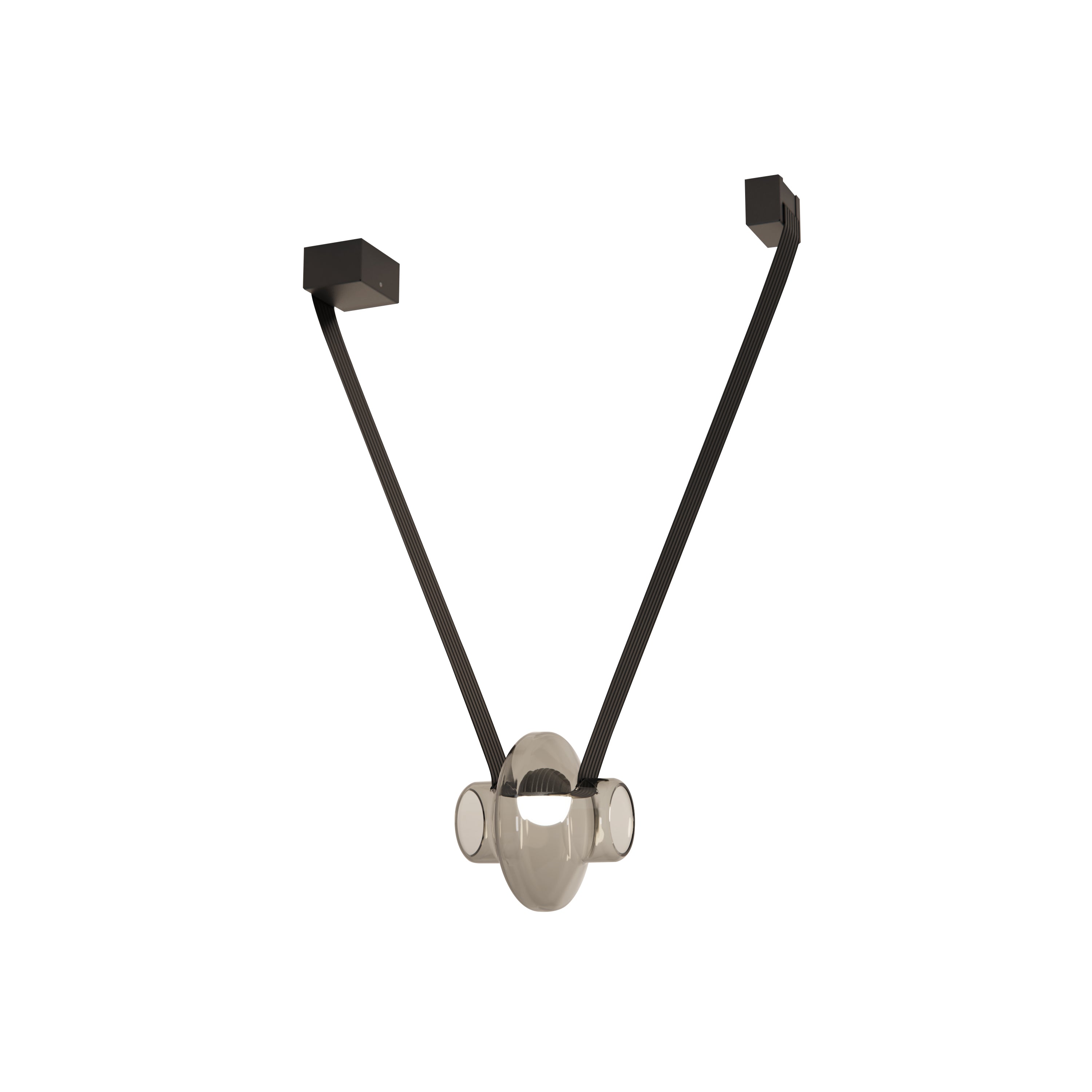 A contemporary lighting system inspired by scenic mountain landscapes and their reflections. It features a wide, flexible, conductive cable that supports and powers the light modules, allowing for versatile configurations. The cable is finished in matte black and designed for creating various geometric and tension-based setups. The lamp includes hand-blown glass globes available in transparent, pink, gray, and amber, with options for clear or frosted finishes. The anodized aluminum and frosted glass light module can direct light either downward or upward.