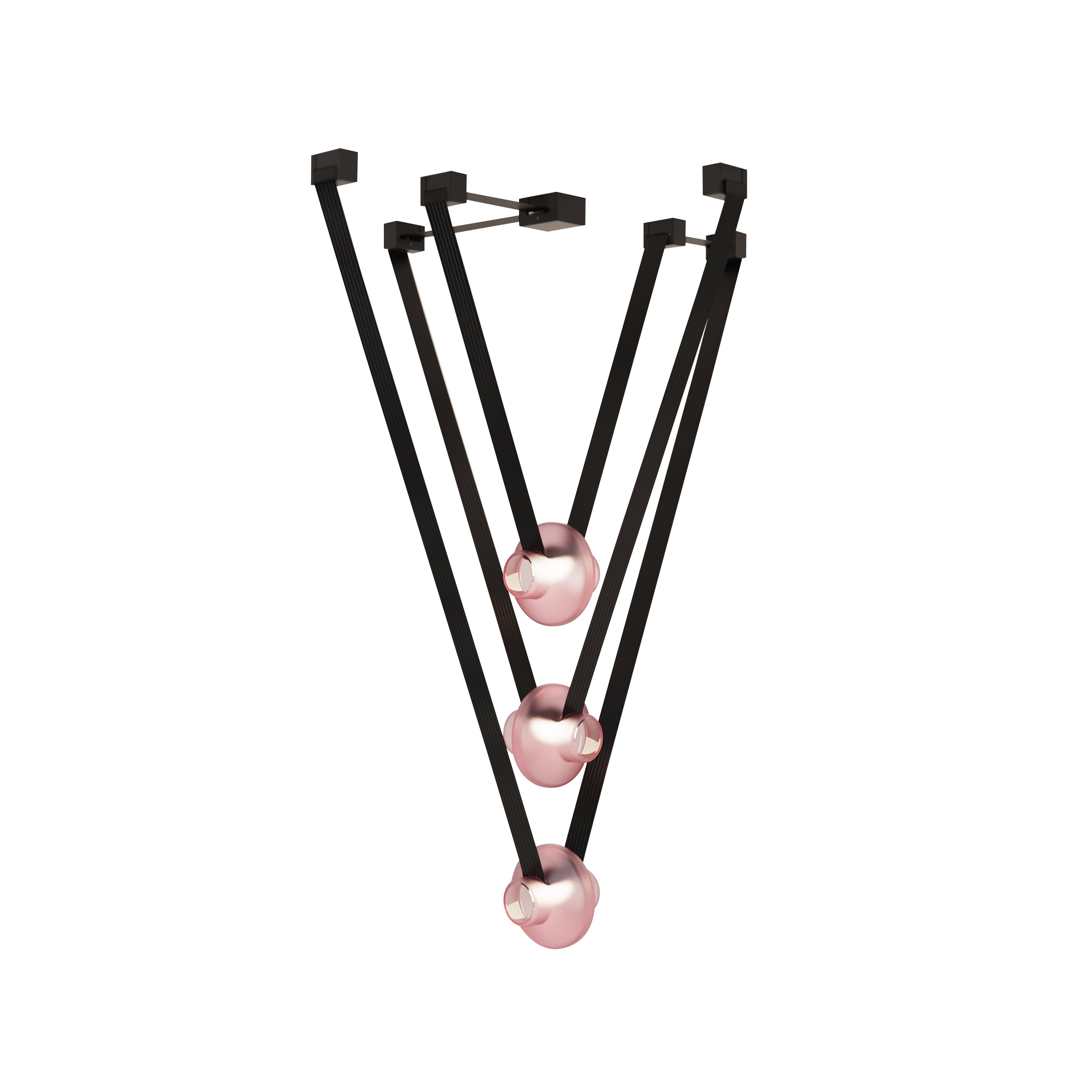 A contemporary lighting system inspired by scenic mountain landscapes and their reflections. It features a wide, flexible, conductive cable that supports and powers the light modules, allowing for versatile configurations. The cable is finished in matte black and designed for creating various geometric and tension-based setups. The lamp includes hand-blown glass globes available in transparent, pink, gray, and amber, with options for clear or frosted finishes. The anodized aluminum and frosted glass light module can direct light either downward or upward.