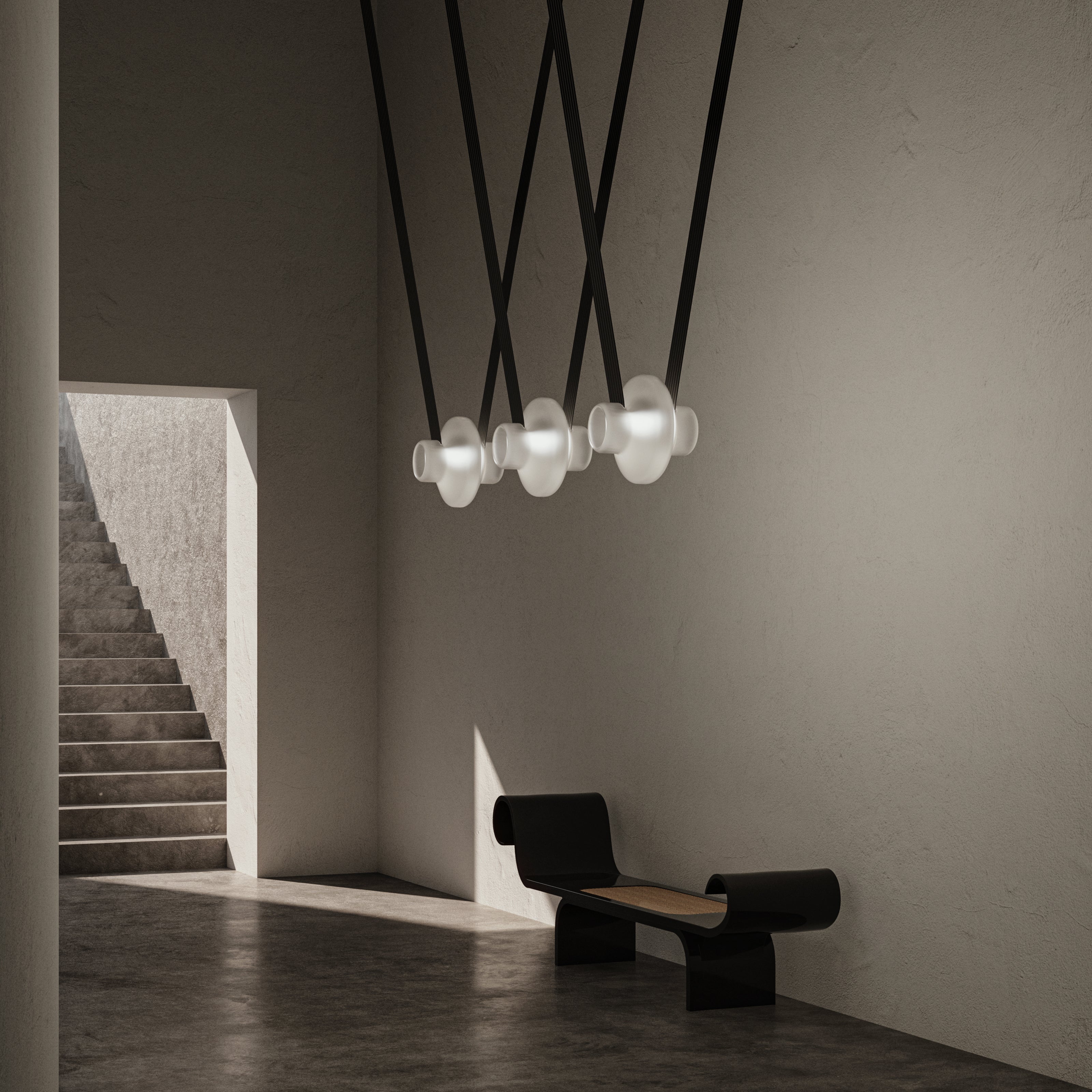 A contemporary lighting system inspired by scenic mountain landscapes and their reflections. It features a wide, flexible, conductive cable that supports and powers the light modules, allowing for versatile configurations. The cable is finished in matte black and designed for creating various geometric and tension-based setups. The lamp includes hand-blown glass globes available in transparent, pink, gray, and amber, with options for clear or frosted finishes. The anodized aluminum and frosted glass light module can direct light either downward or upward.