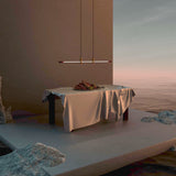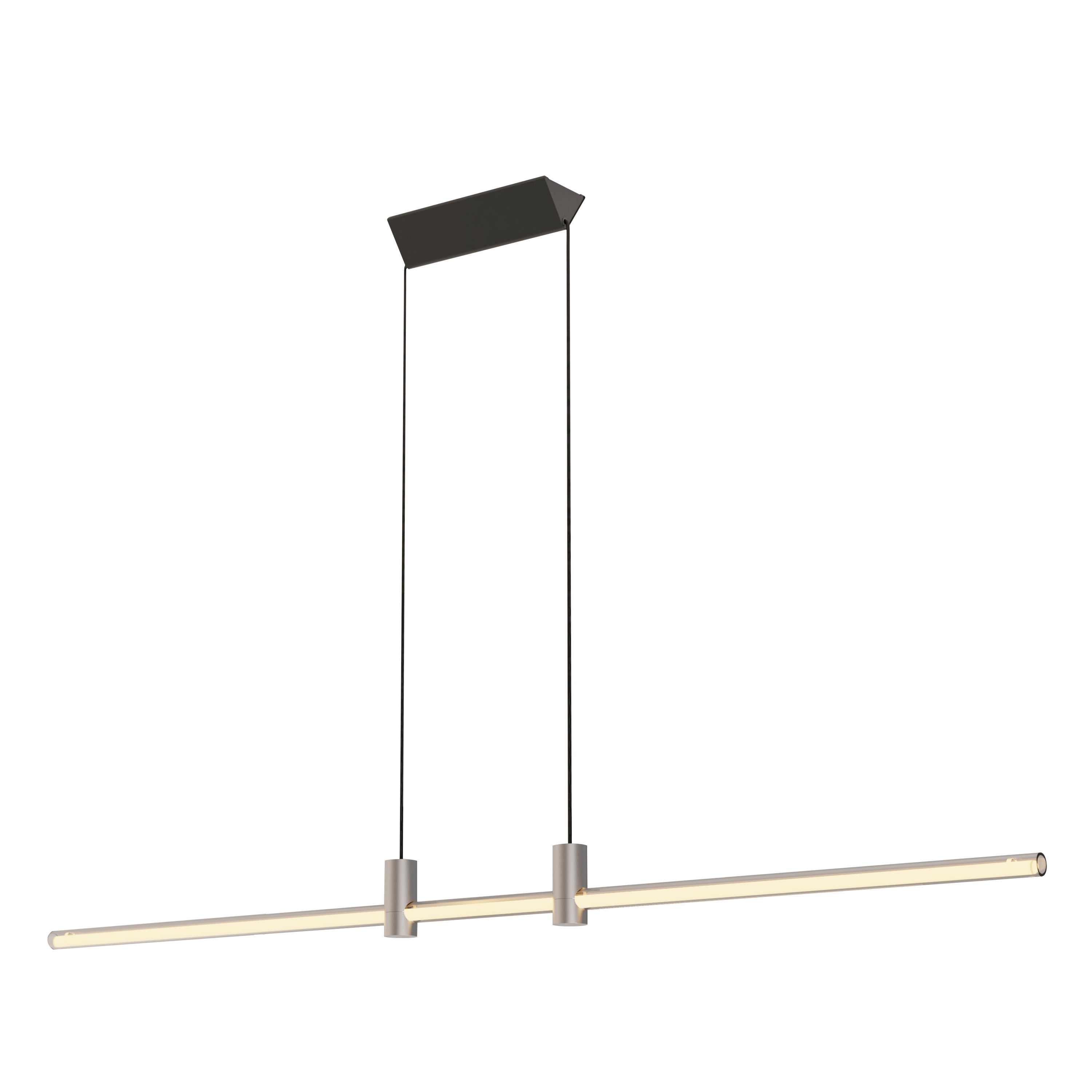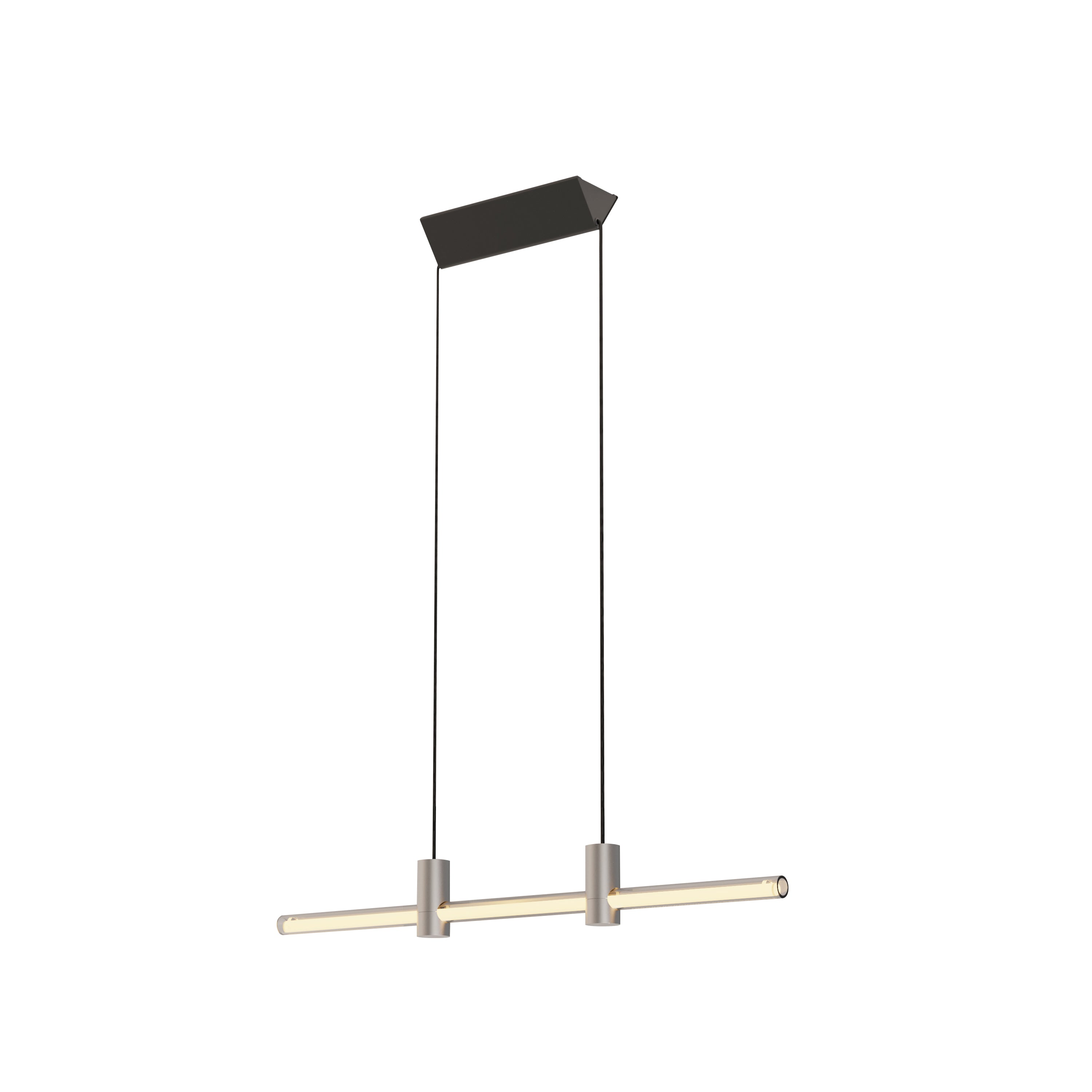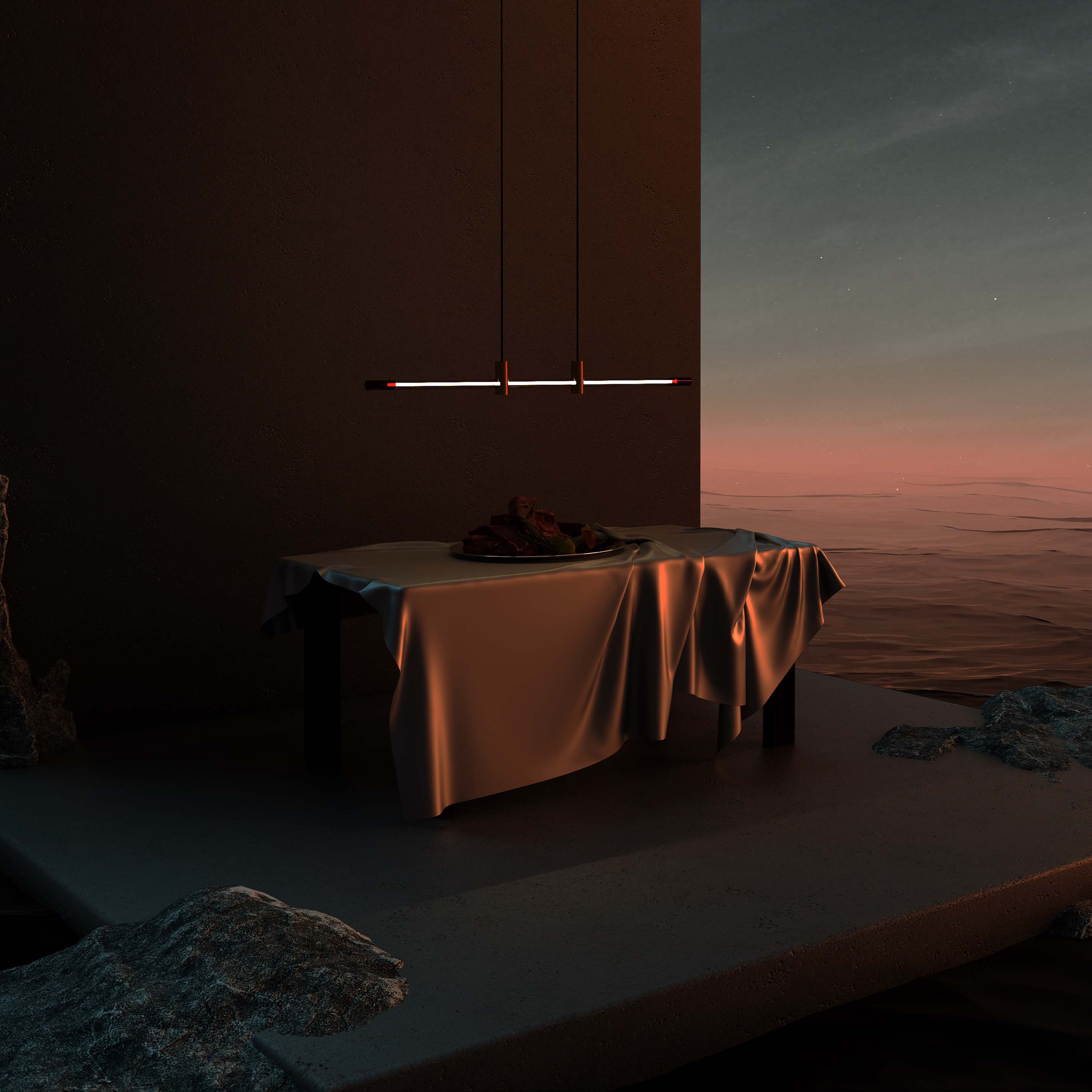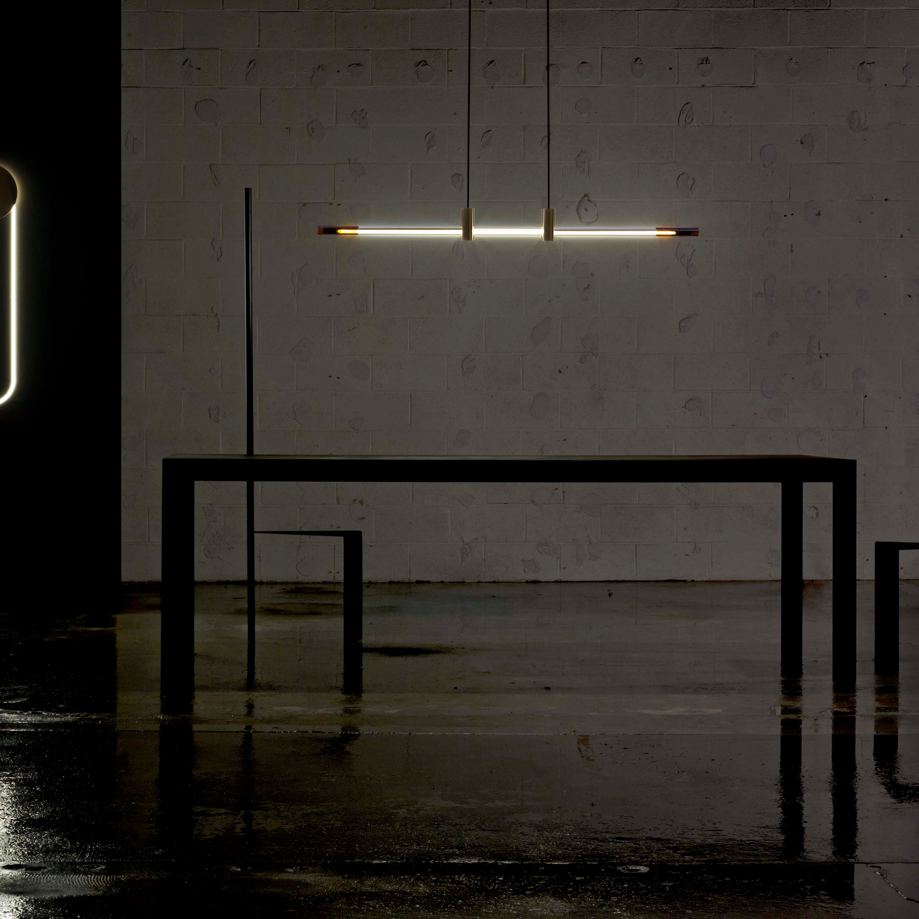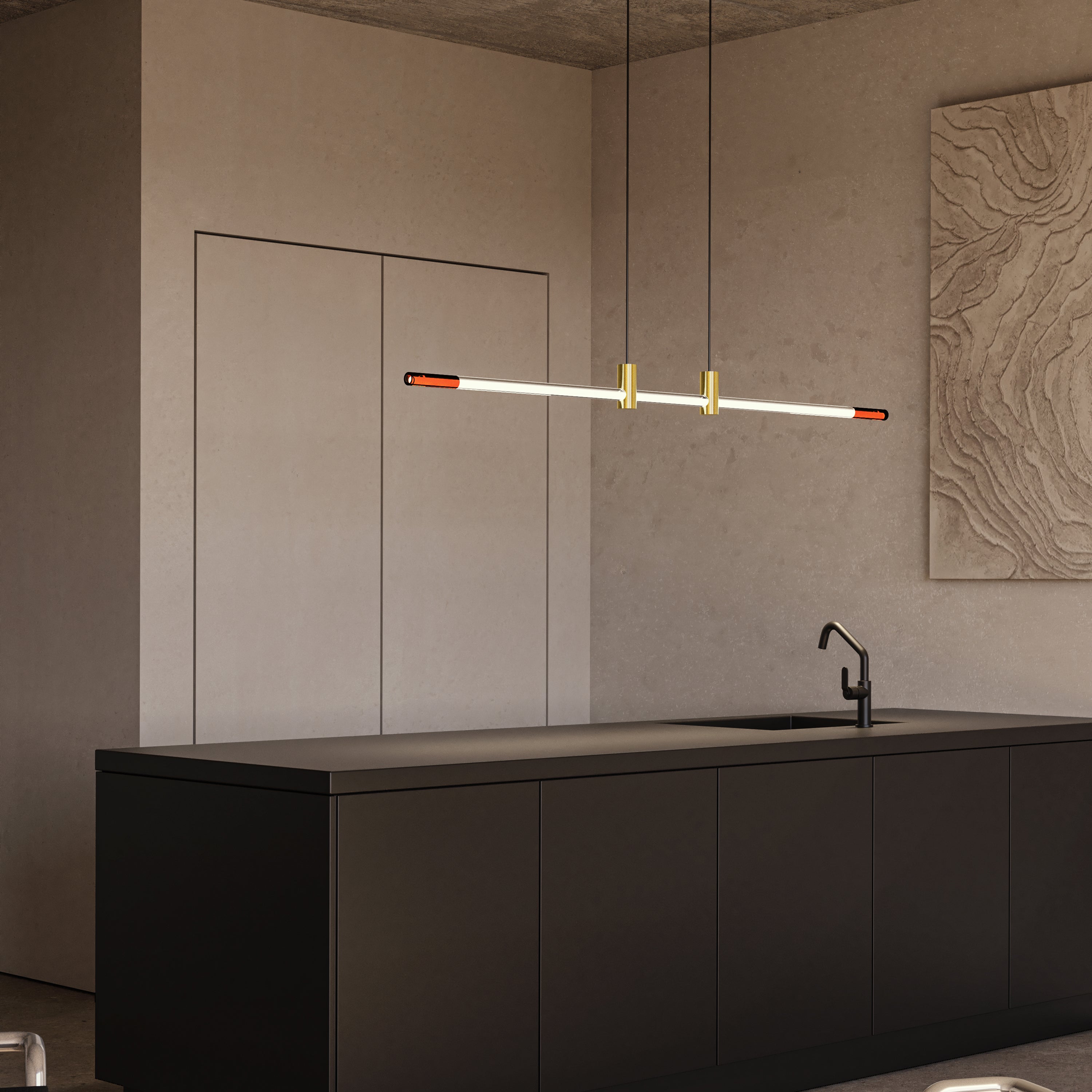 The lamp features a borosilicate glass tube and metal supports, creating a visual interplay between solidity and transparency. Originally inspired by neon lighting, the Ra Line reimagines this medium into a centerpiece of warm, luxurious illumination and also offers practical features like dim-to-warm lighting, which adjusts from bright to a more intimate, warmer glow.
