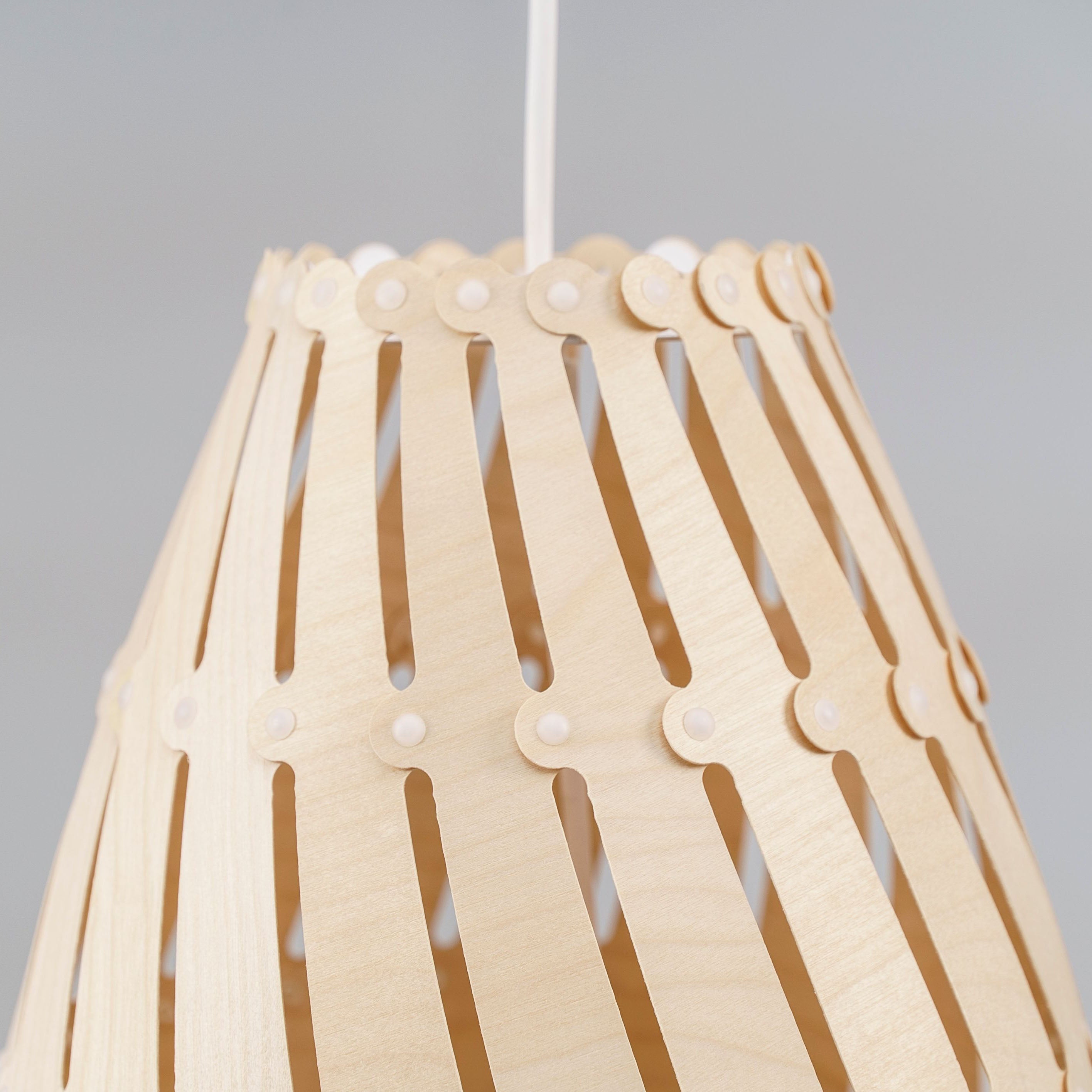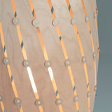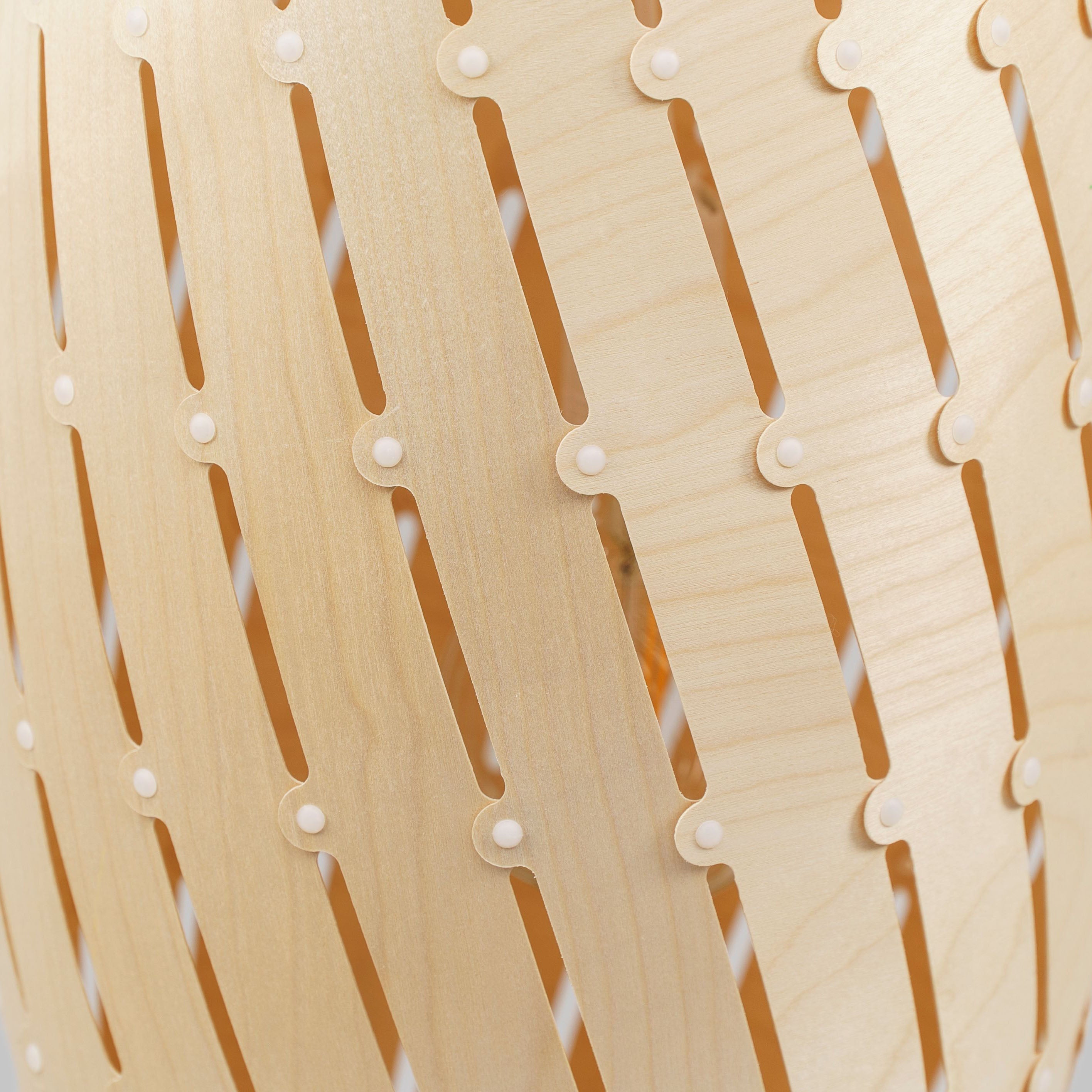A twisting swirl of wave-like pattern, the vertically oriented Roll brings another option to David Trubridge's lantern-like Ebb series. The environmentally conscious designer has reworked the pendant in ultra-thin Finnish birch plywood held together with nylon clips for a magical light that also favors the natural woodgrain. Shipped in environmentally friendly packaging, the flat "kitset" is easily assembled and includes the cord-bulb holder and a ceiling canopy.