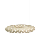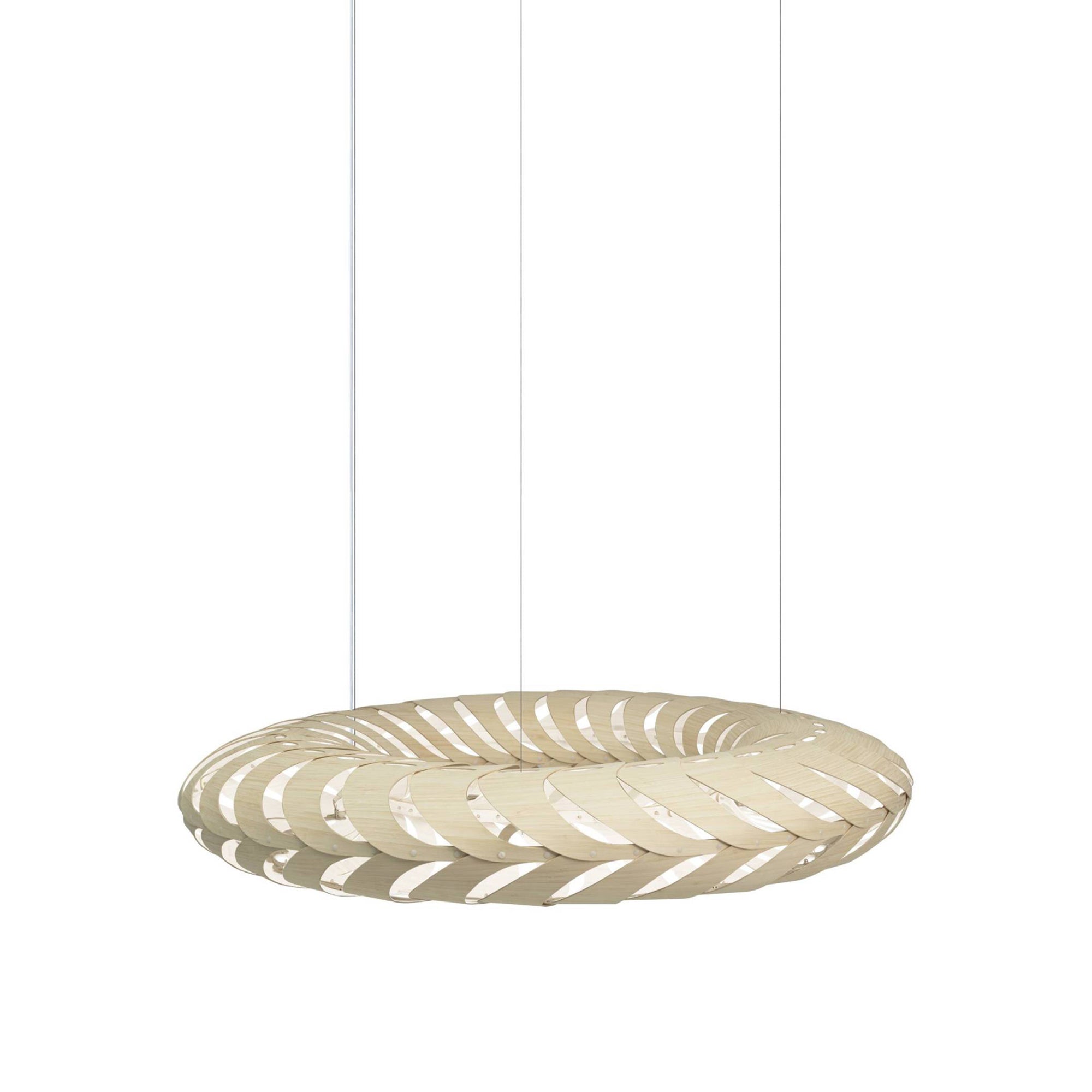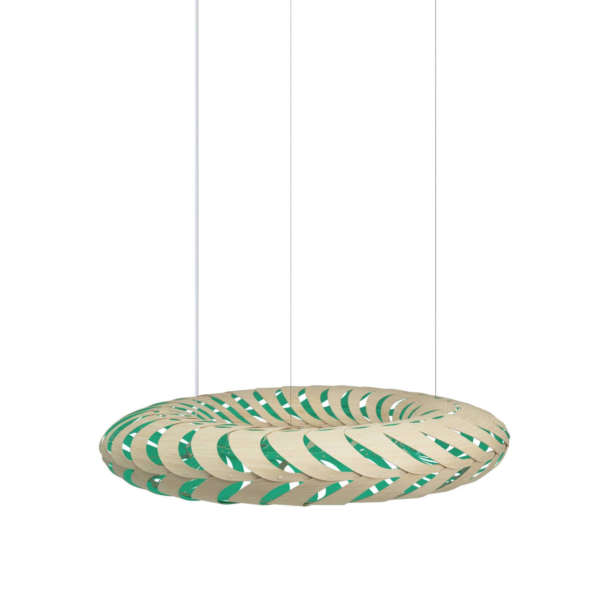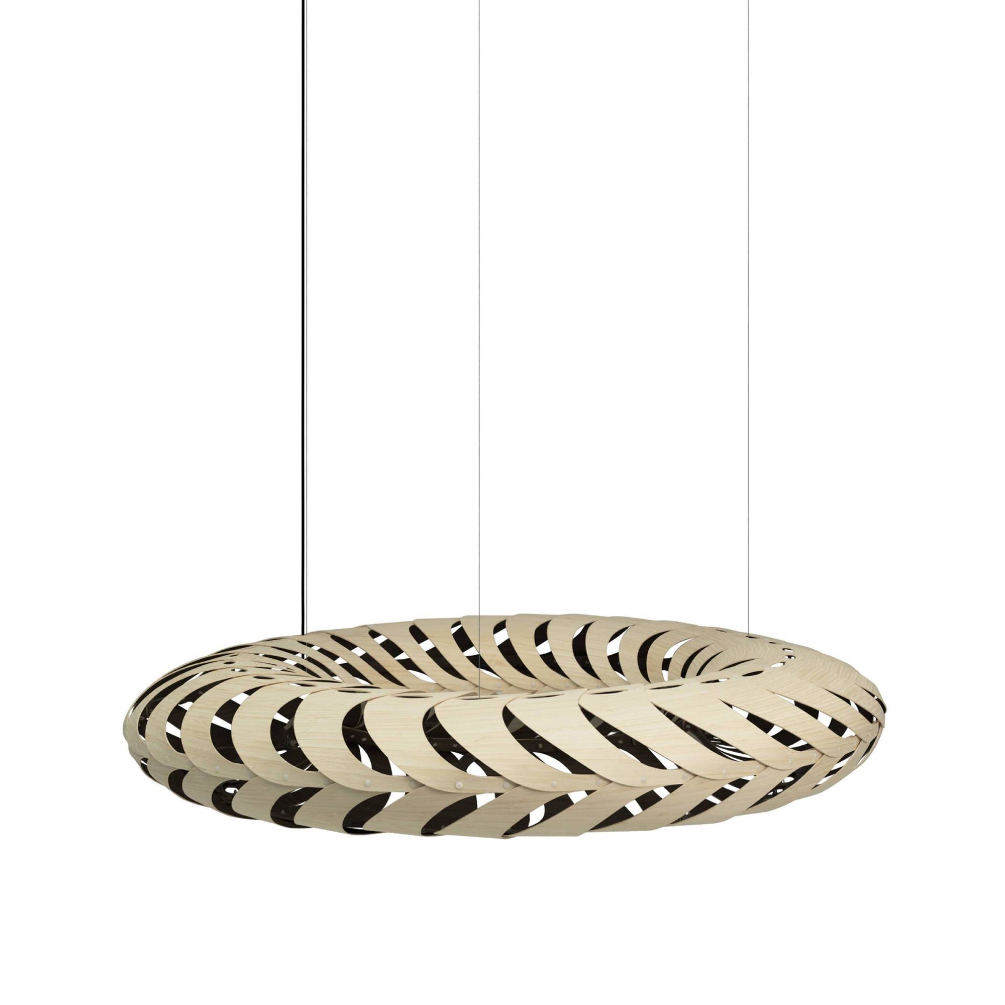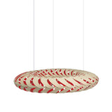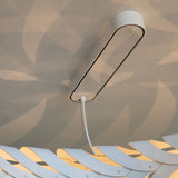Lit internally by low-energy LED modules, Maru's curving panels of sustainably managed bamboo plywood swirl around its round form. The circular construction also references the cycle of life in the name Maru, found in both New Zealand Mãori and Japanese languages. Casting kaleidoscopic shadows on the surrounding walls and ceiling, the suspended light makes a dramatic addition to any setting, in natural or a range of mistily tinted colorways.