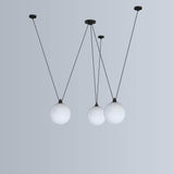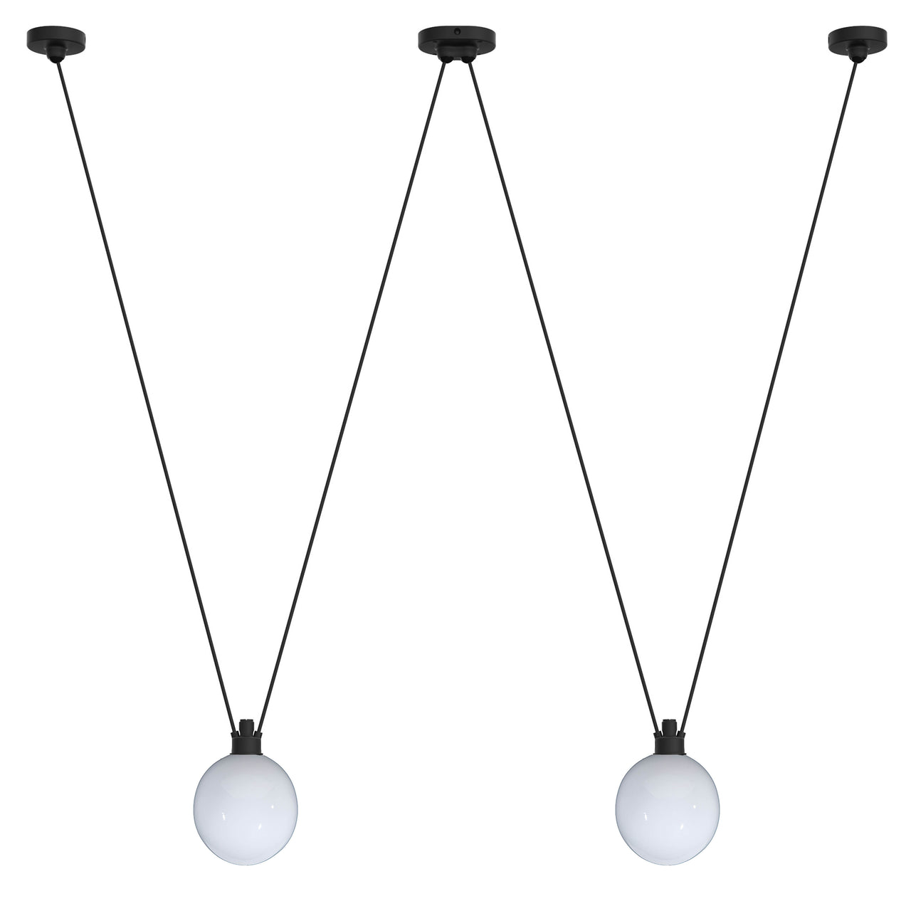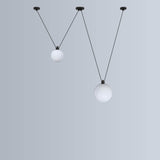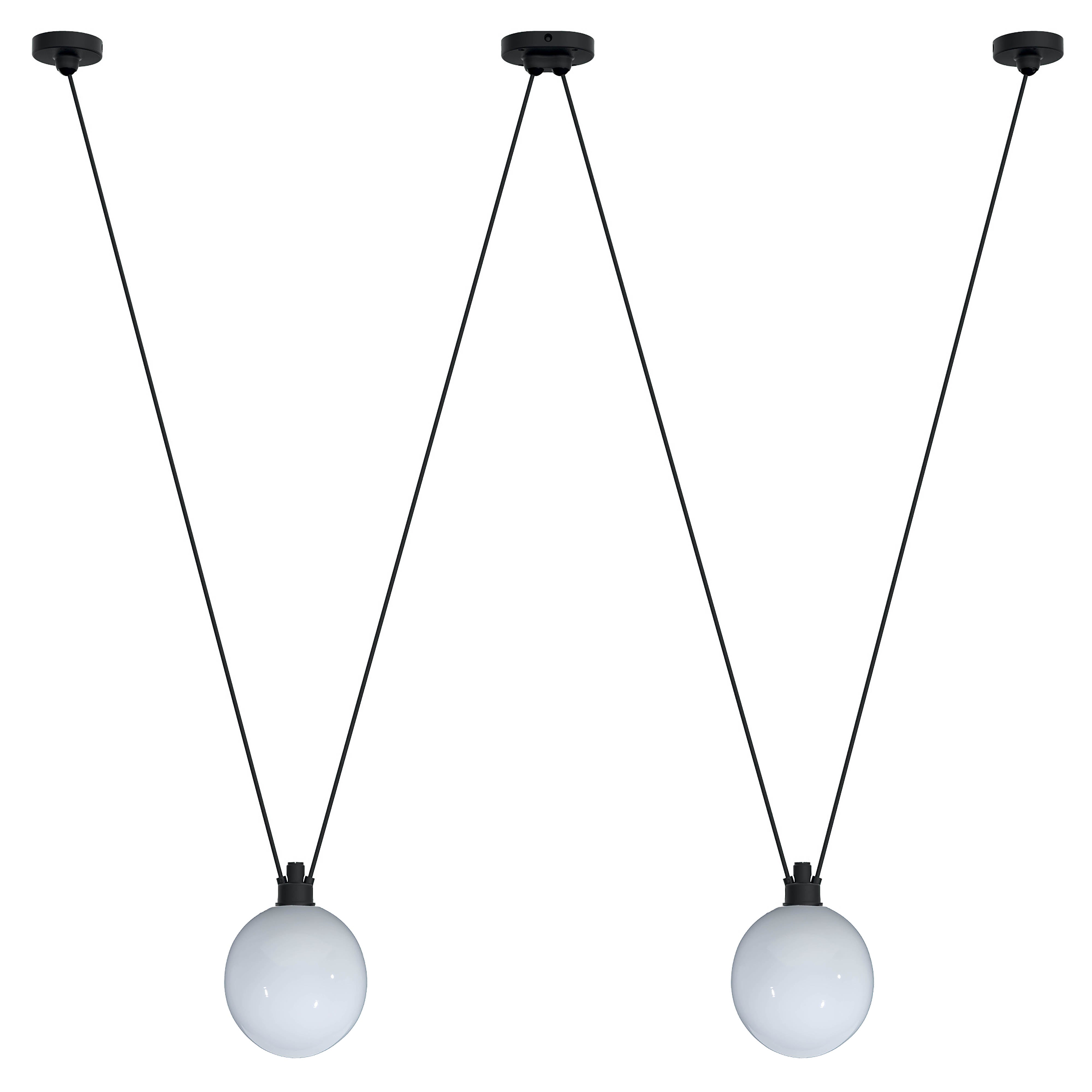 The Les Acrobates N°324 Pendant Lamp features a spherical opal glass shade suspended by four adjustable cables. Its adaptable design allows it to be installed individually or arranged with other fixtures for customized lighting compositions. The pendant is available in finishes such as black and raw copper, providing options to complement various interiors. With its clean design and versatile mounting possibilities, this lamp enhances the character and functionality of spaces.