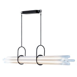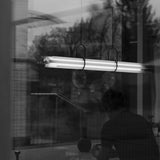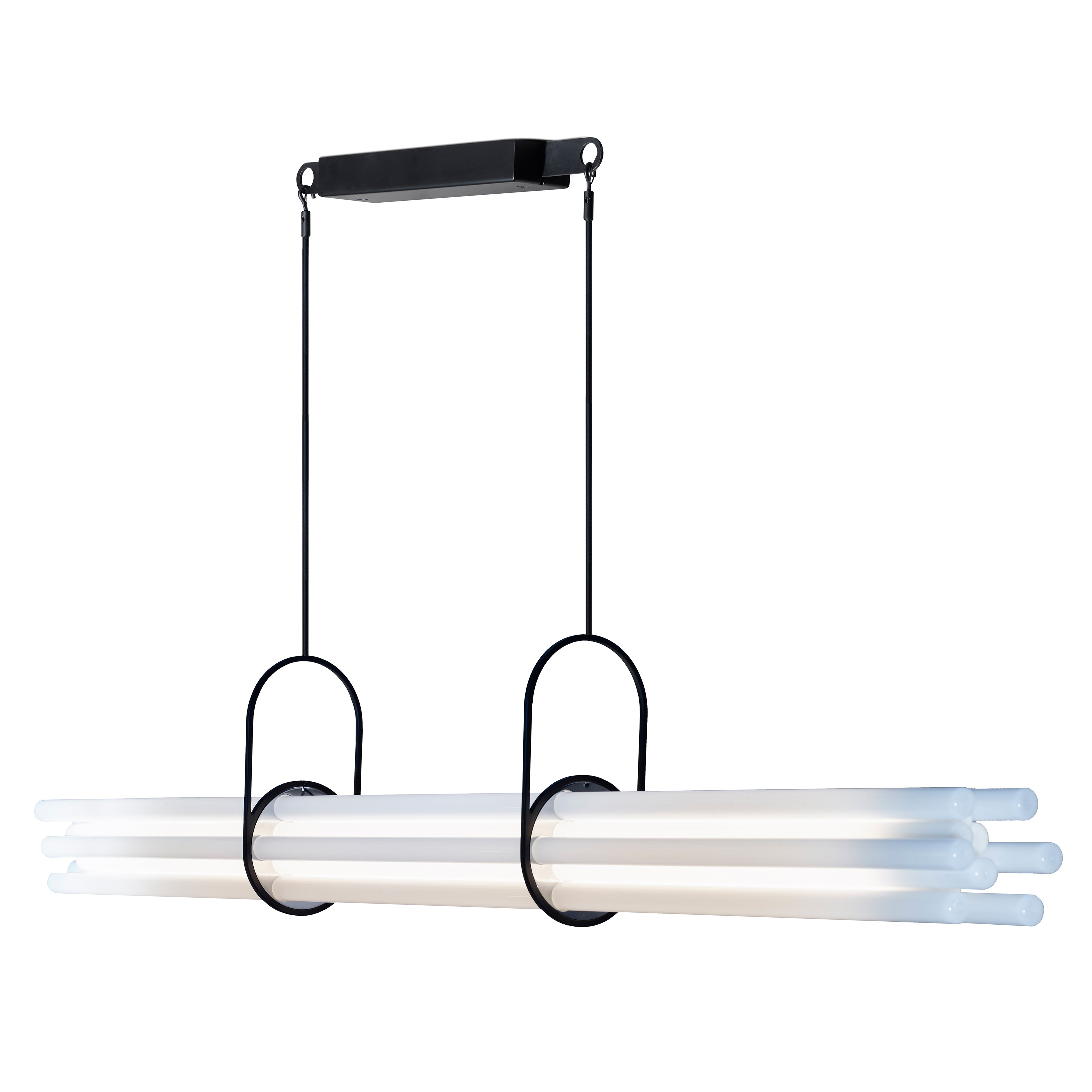 Designed to illuminate a large dining room table, Berlin designer Sebastian Summa’s tour-de-force pendant cleverly toys with visual perception. Composed of 12 borosilicate glass tubes, only the one at the center functions as NL12’s light source while the other tubes act as diffusers via refraction and prism. Without any visible wire or discernable LEDs, the sole structure seems to come from the pair of brackets resembling gymnastics clamps that balance the bundle of tubes perfectly.