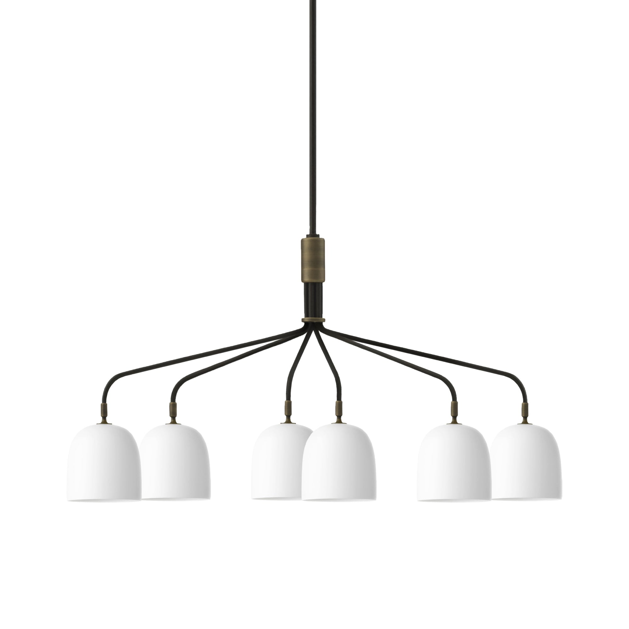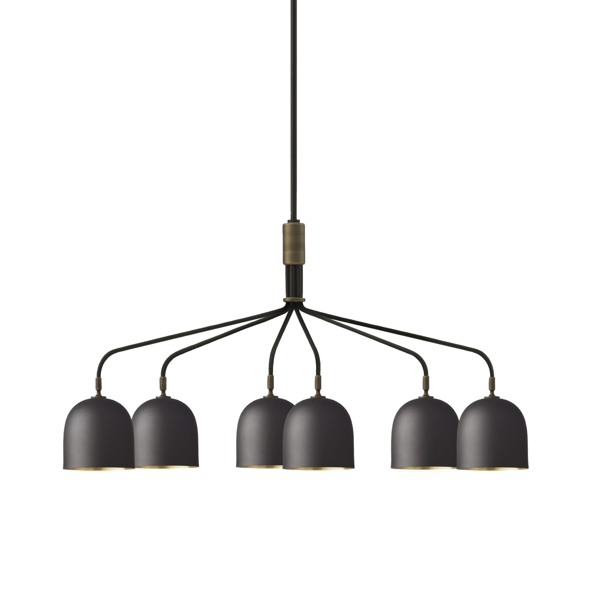 Gubi, along with studio Space Copenhagen, caps their Howard collection with a grand gesture that is also a piece of engineering ingenuity: a statement chandelier with 4 or 6 adjustable spreading arms. With the industrial patina of New York City seen through Scandinavian eyes, the fixture offers a choice of finishes for differing atmospherics. The enclosed gunmetal shades with a brushed brass interior have a tactile feel and a warm and directed light while the translucent bone china option yields a softer ambient glow.