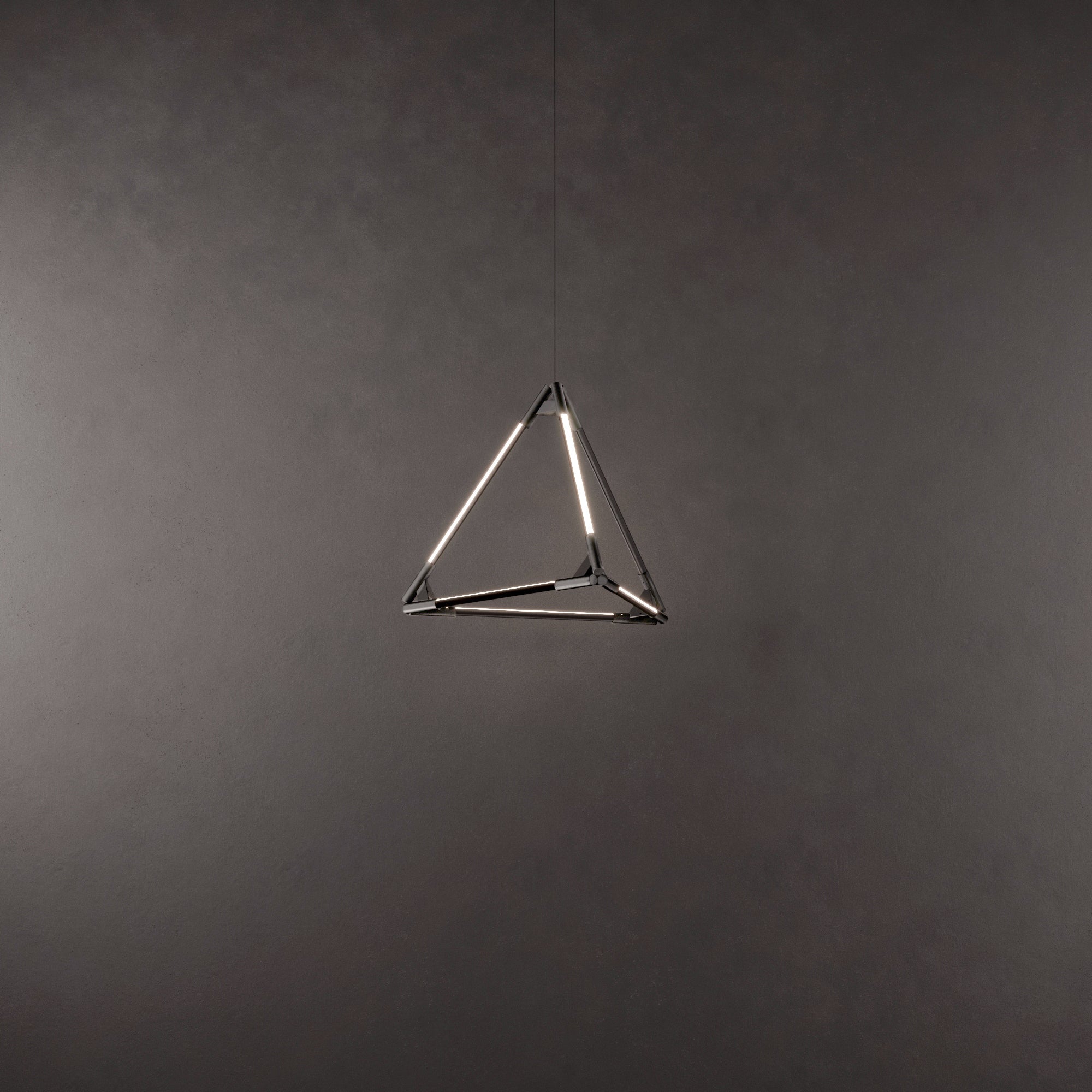 Solids Tetrahedron joins the almost inexhaustible lineup of inventive hanging variations in the Thin series. Suspended from its solid-brass corner point or hung from a side, the fixture's 1/2-inch LED segments can rotate into their form for a concentrated illumination or face outward for an ambient glow. Dazzling as a single pendant in any of 3 sizes, it can also extend and interlock in multiples for larger awe-inspiring installations.