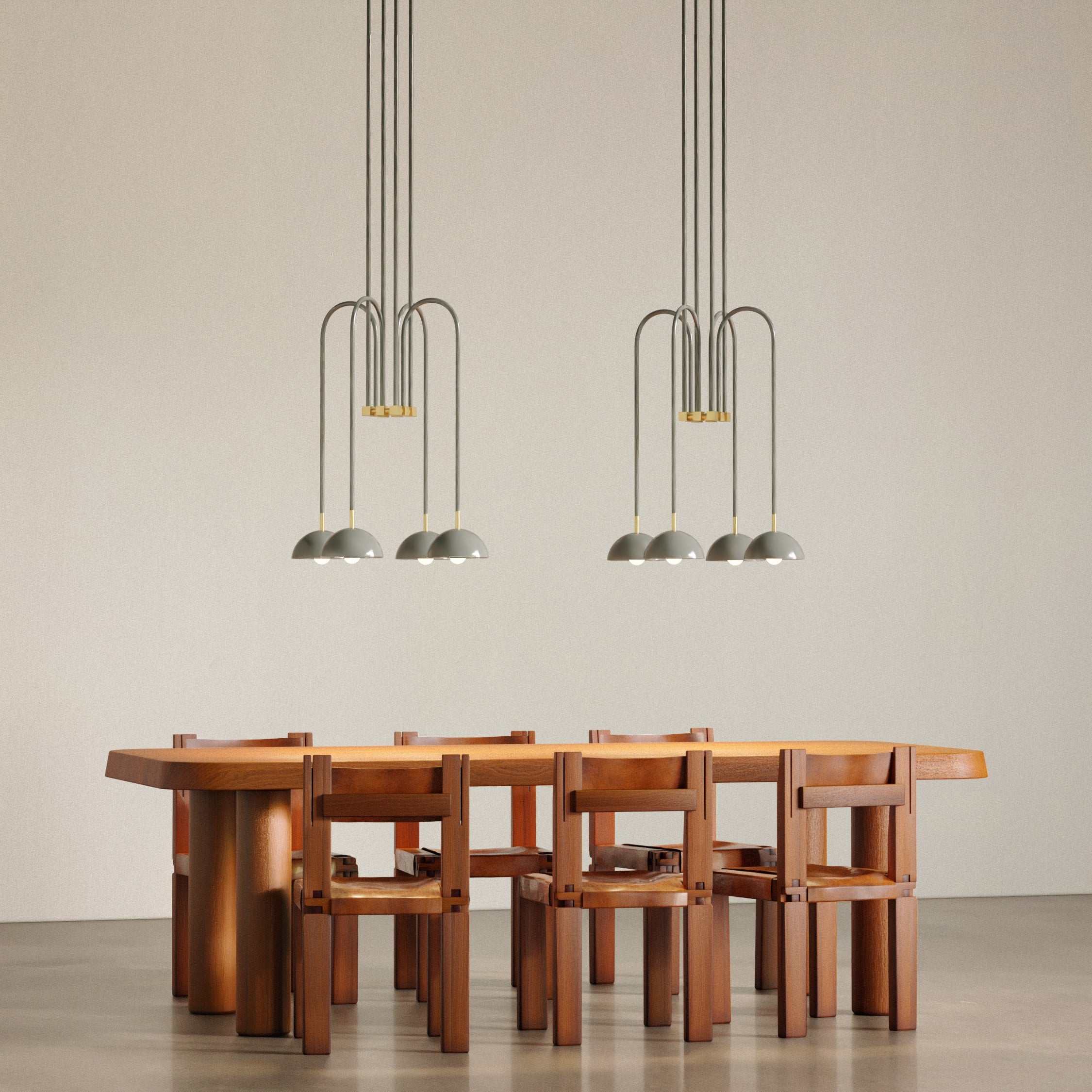 In the small 03 version, like its siblings in the series, Beaubien Atelier mingles a host of influences from the romance of Art Deco to a hint of industrial spirit to arrive at a bold, ornamental suspension lamp. Fashioned in powder-coated aluminum, the structure and shades are complemented by brass hardware and milk glass globes that gently diffuse the LED illumination.