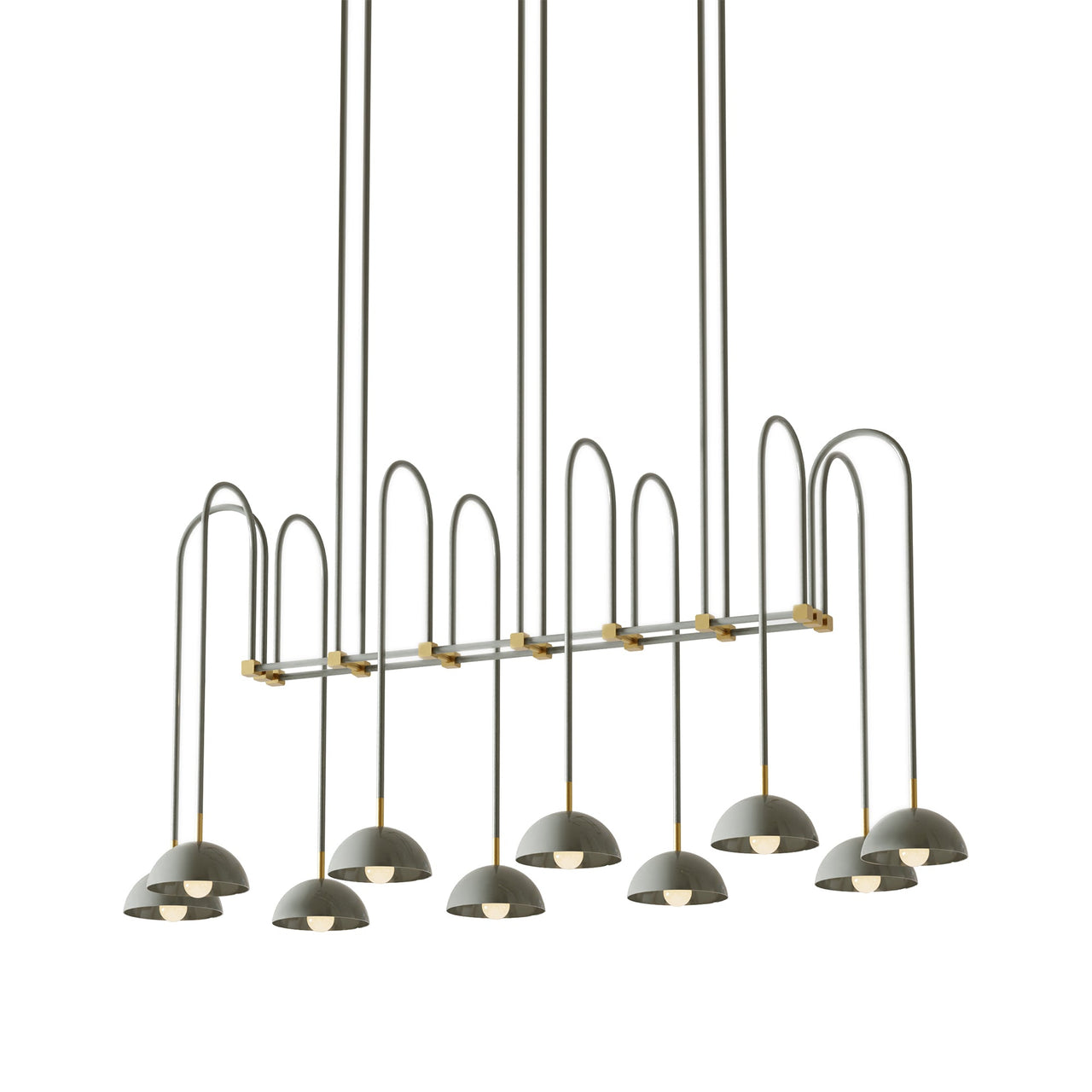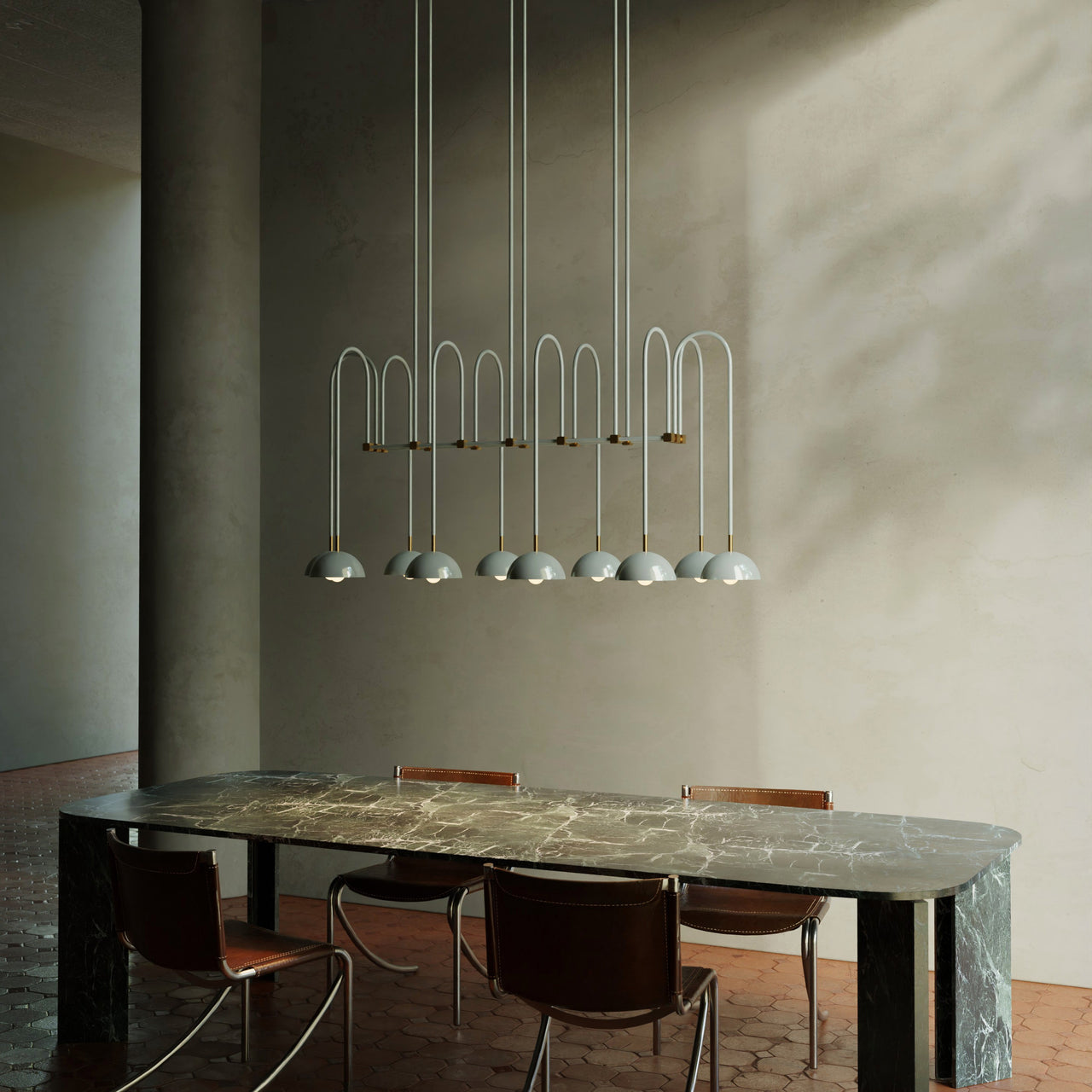 In the grand 06 version, like its siblings in the series, Beaubien Atelier mingles a host of influences from the romance of Art Deco to a hint of industrial spirit to arrive at a bold, ornamental suspension lamp. Fashioned in powder-coated aluminum, the structure and shades are complemented by brass hardware and milk glass globes that gently diffuse the LED illumination.