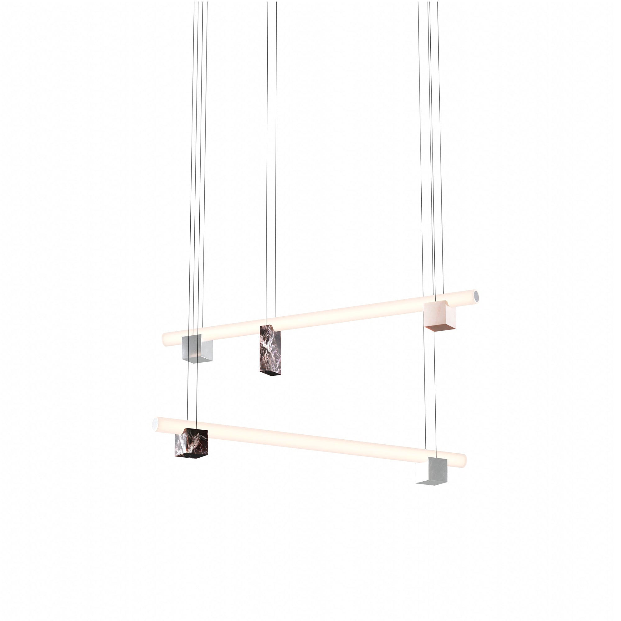 The Isle 11 Suspension Lamp is composed of frosted glass tubes supported by solid stone and polished aluminum pedestals, creating the effect of a floating bridge. Available in multiple color palettes, including combinations like Black Marquina marble with polished aluminum or more vibrant choices like Pink Portugal with Red Levanto marble. The lamp supports various lighting modes, such as fixed or dim-to-warm LEDs, and ranging color temperatures.