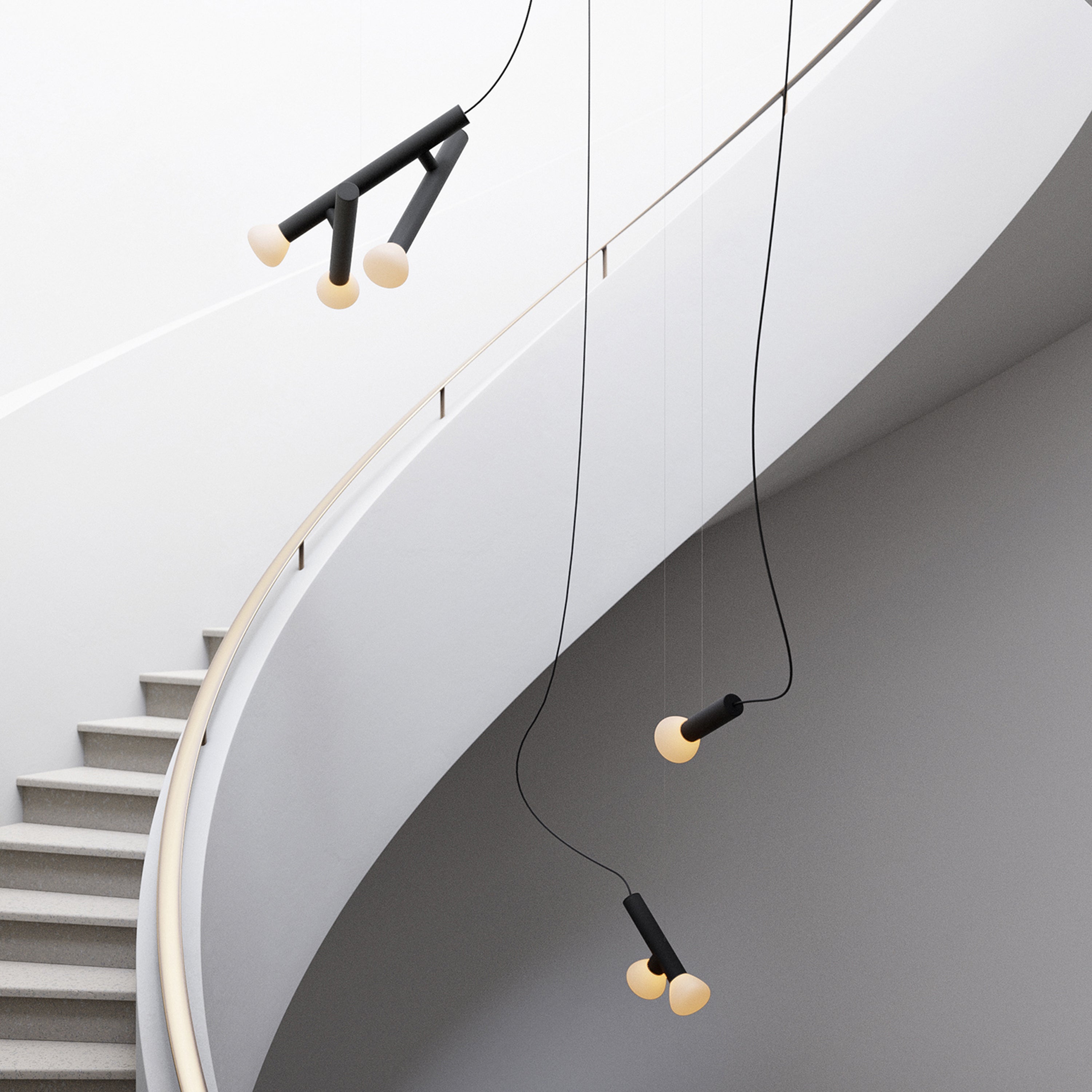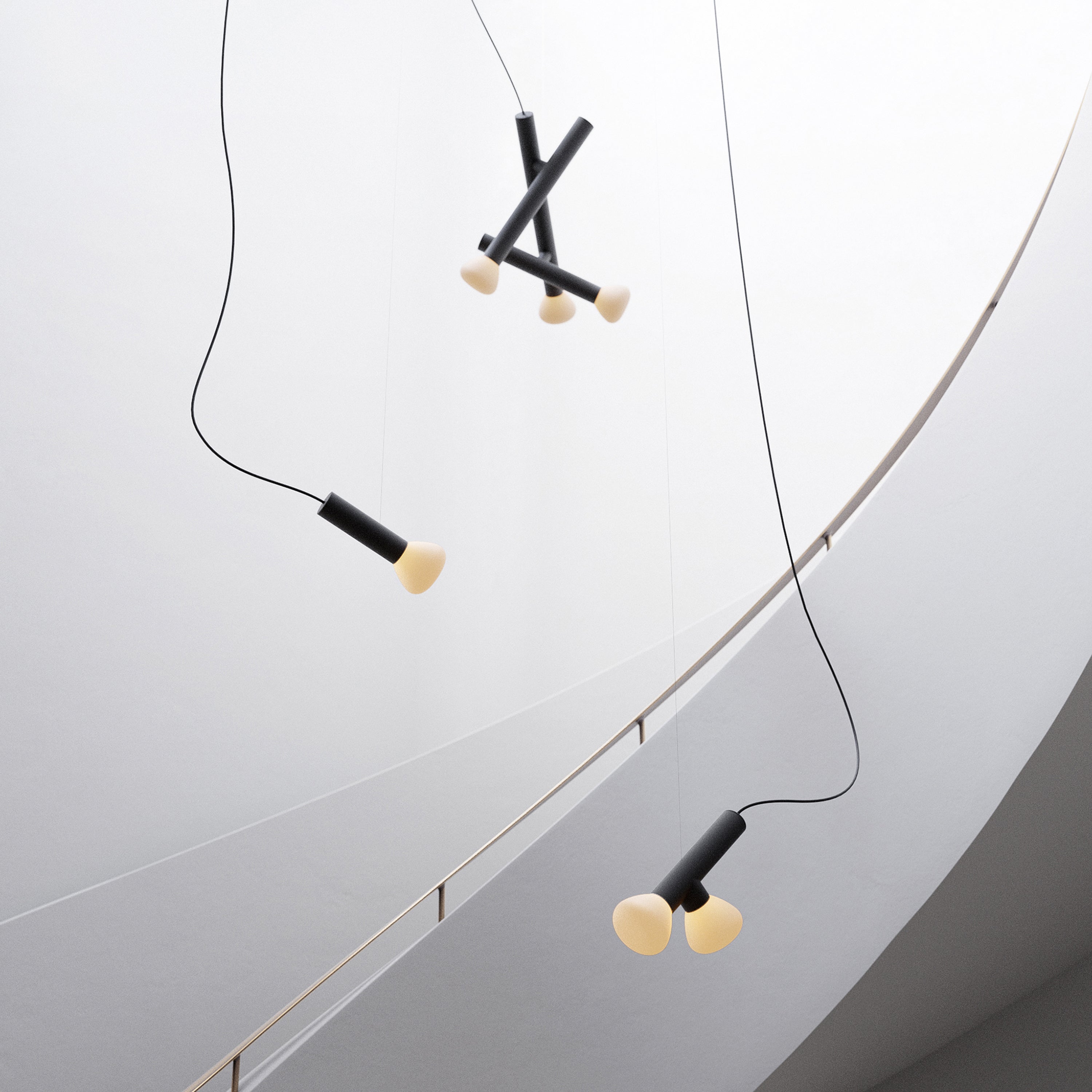 Hand-blown frosted glass, powder-coated aluminum, polyester