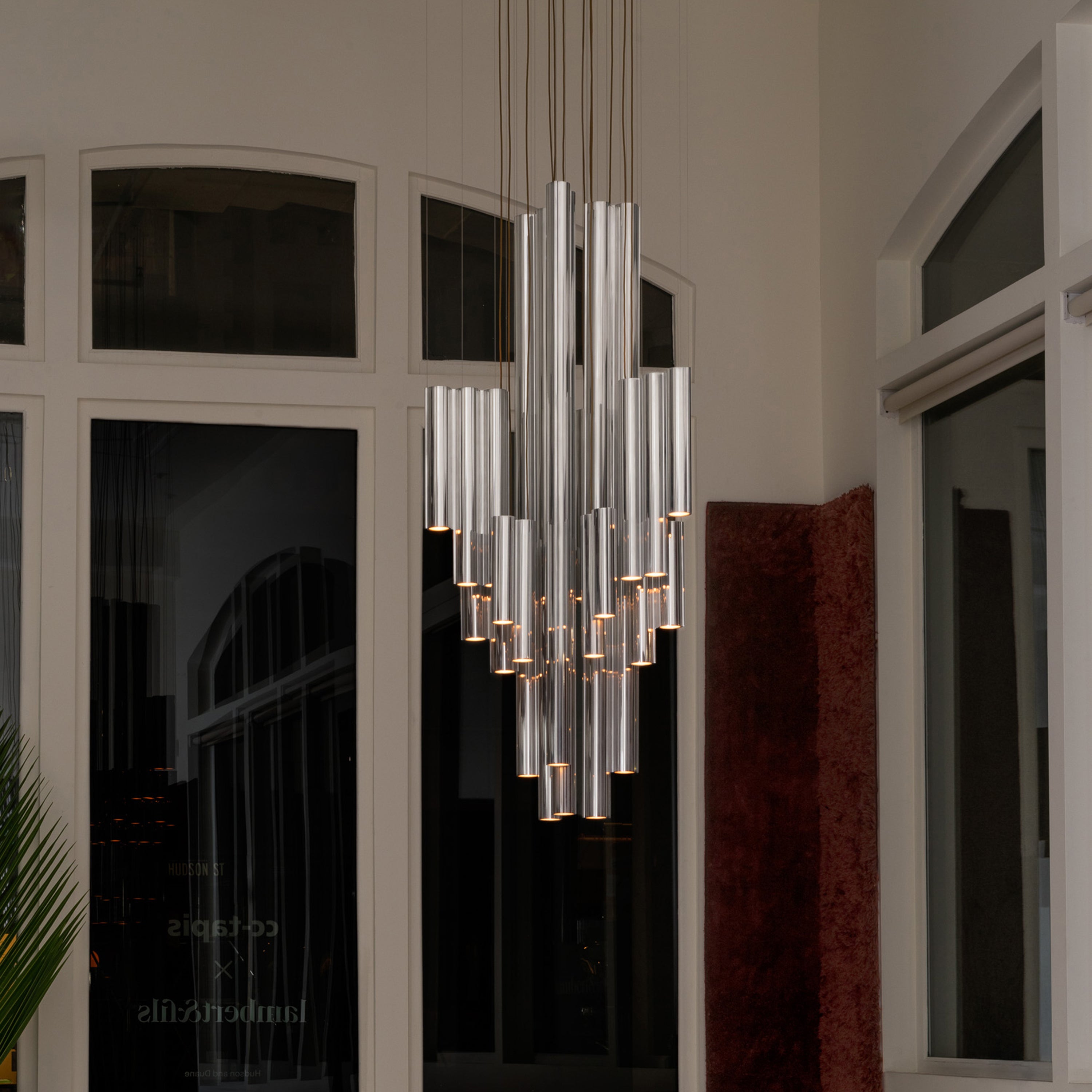 Fashioned in mirror polished aluminum or a glossy powder coat, Silo Atelier 01 makes a breathtaking display of dazzling iridescence and reflections. Composed of a mix of 12 tubular Silo modules, this stylishly futuristic take on a chandelier features 30 integrated LED light sources in total for a marvel of monumental form.